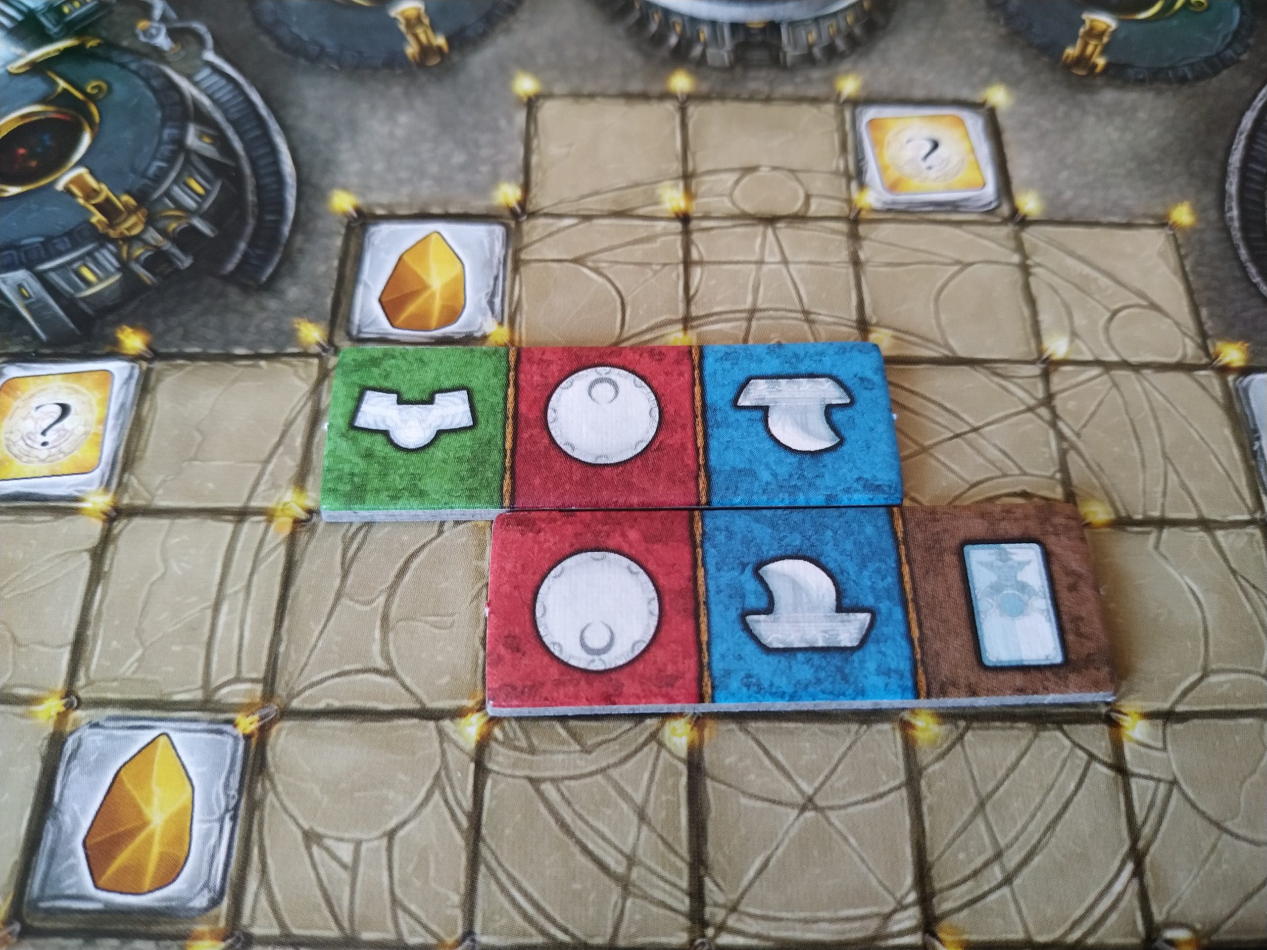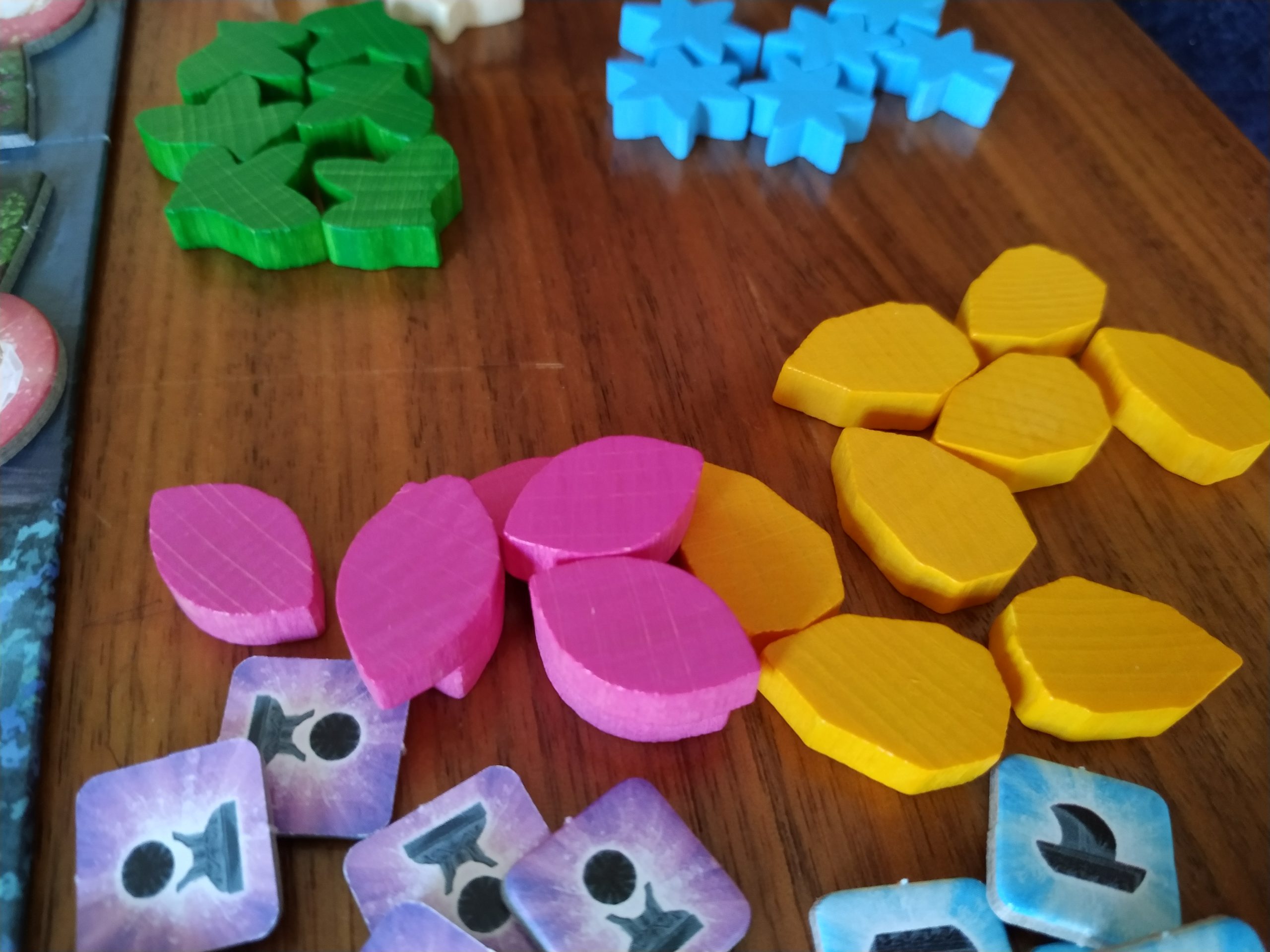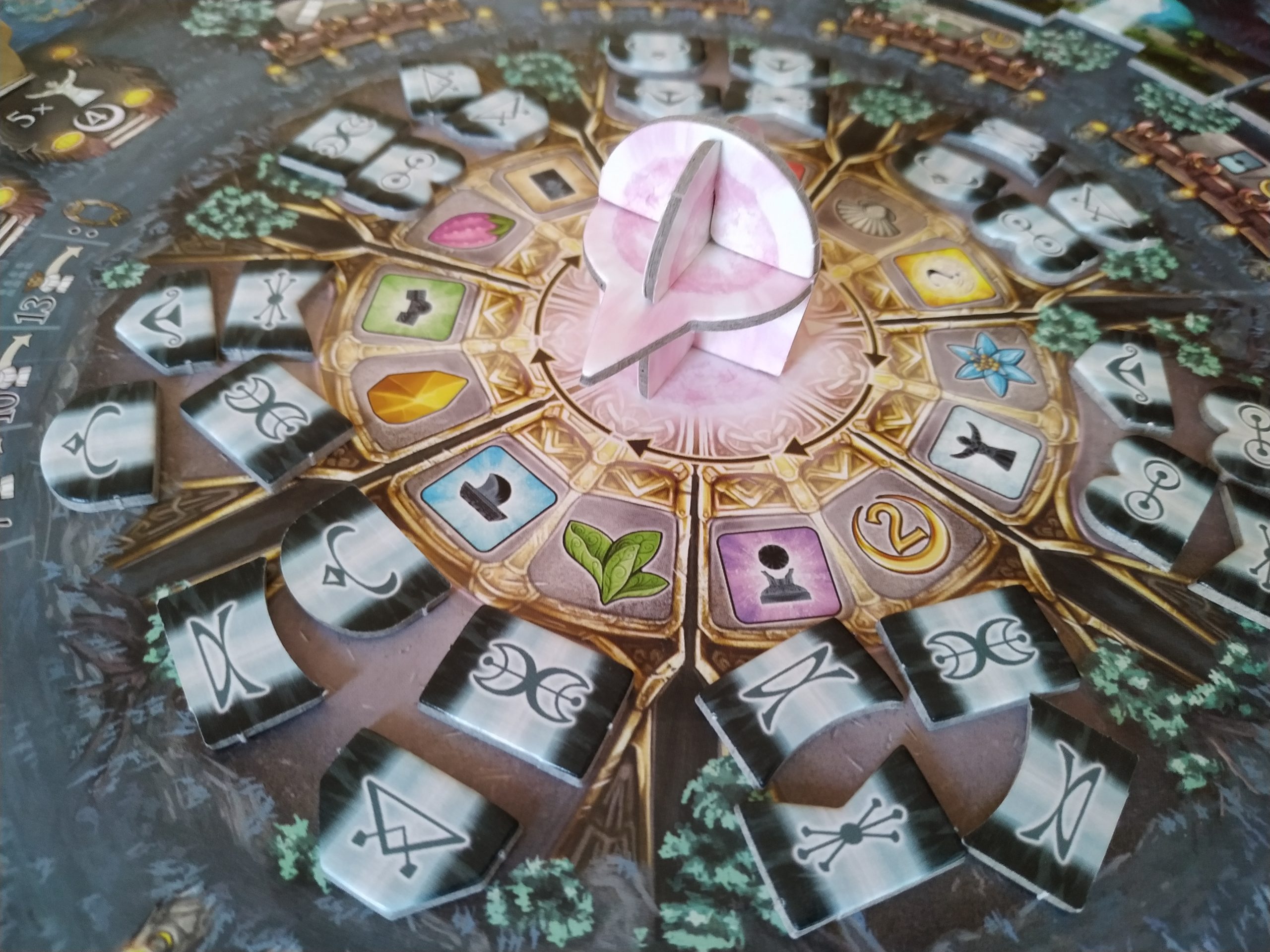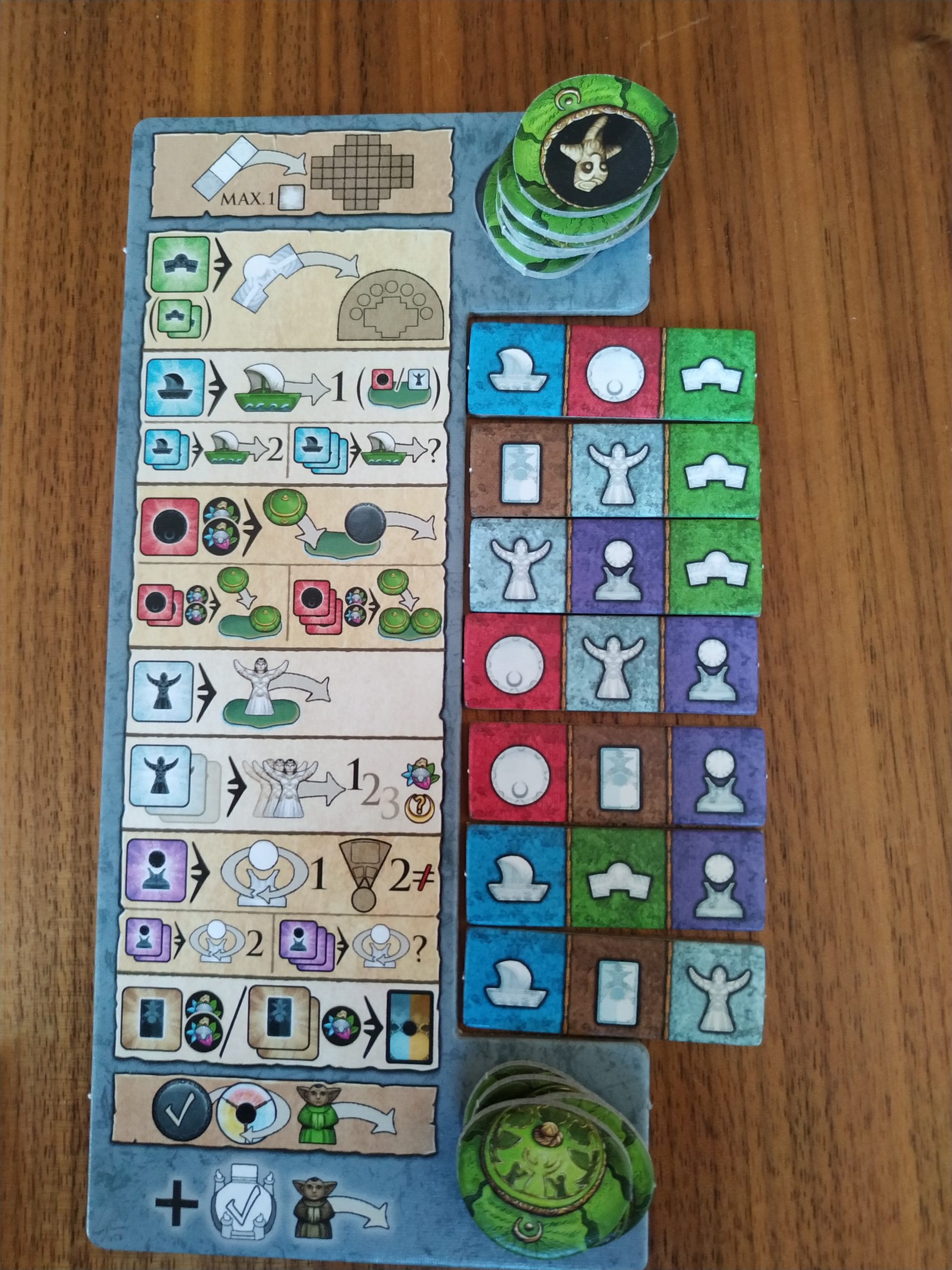 Le pitch est que les feux de joies (Bonfire) se sont éteints et que les gnomes que nous sommes allons quérir la bonté des gardiens de lumière pour qu’ils acceptent de les rallumer. Ils nous donnent des quêtes pour prouver notre foi et notre vaillance et si on est bon, on récupérera la lumière. Concrètement, à chaque tour on prend une action entre placer une plaque sur son plateau central (qui apporte des pastilles d’action), jouer une (ou plusieurs) pastilles pour faire une action (6 types différents), allumer un feu (quand l’objectif associé est réalisé). Là, c’est brossé large, car le détail sera pour la Review et il y a tant de choses à dire dans les détails ! La fin de jeu se déclenche quand un certain nombre d’objectifs seront réalisés (10 pour l’ensemble des joueurs à 3).