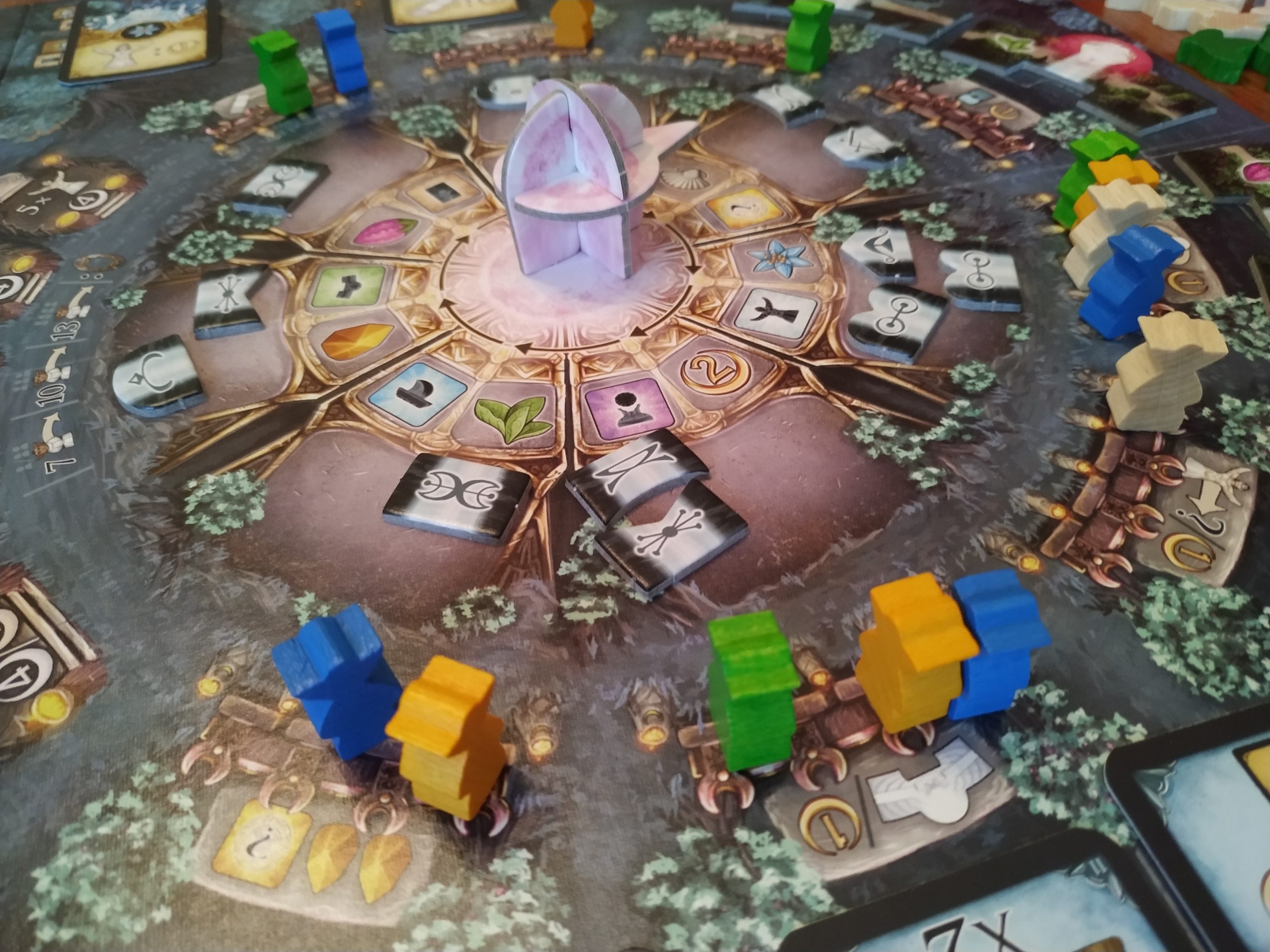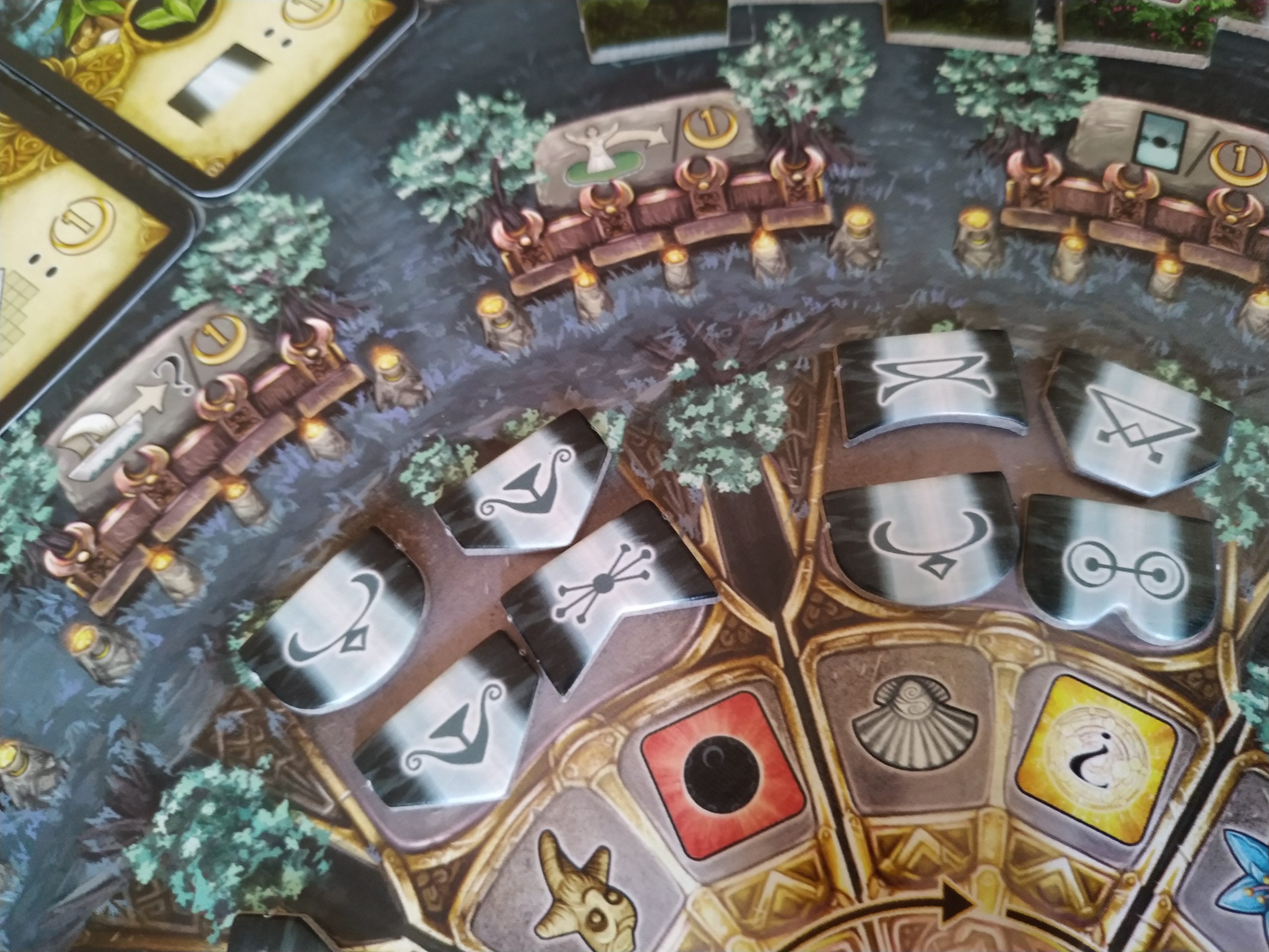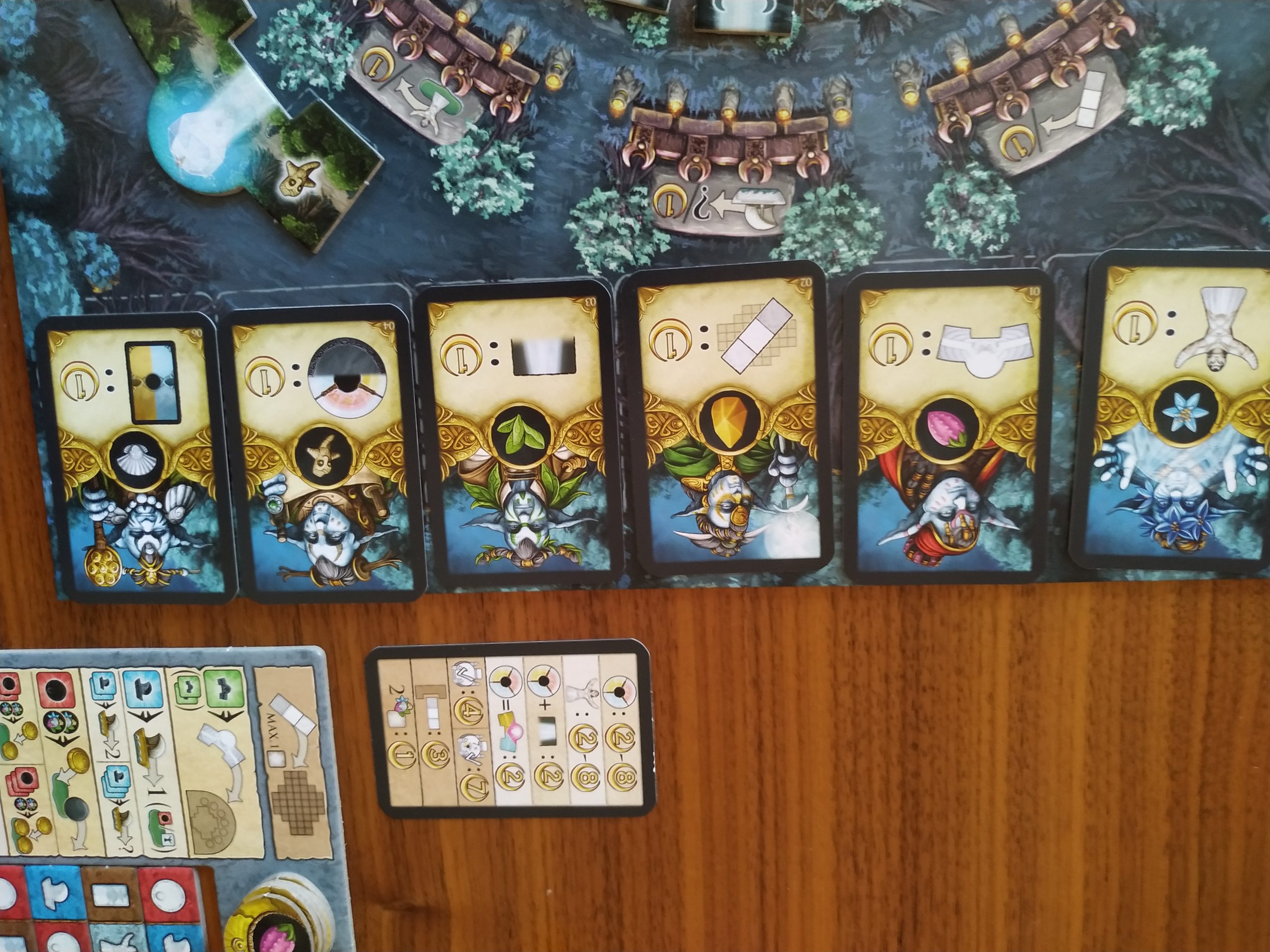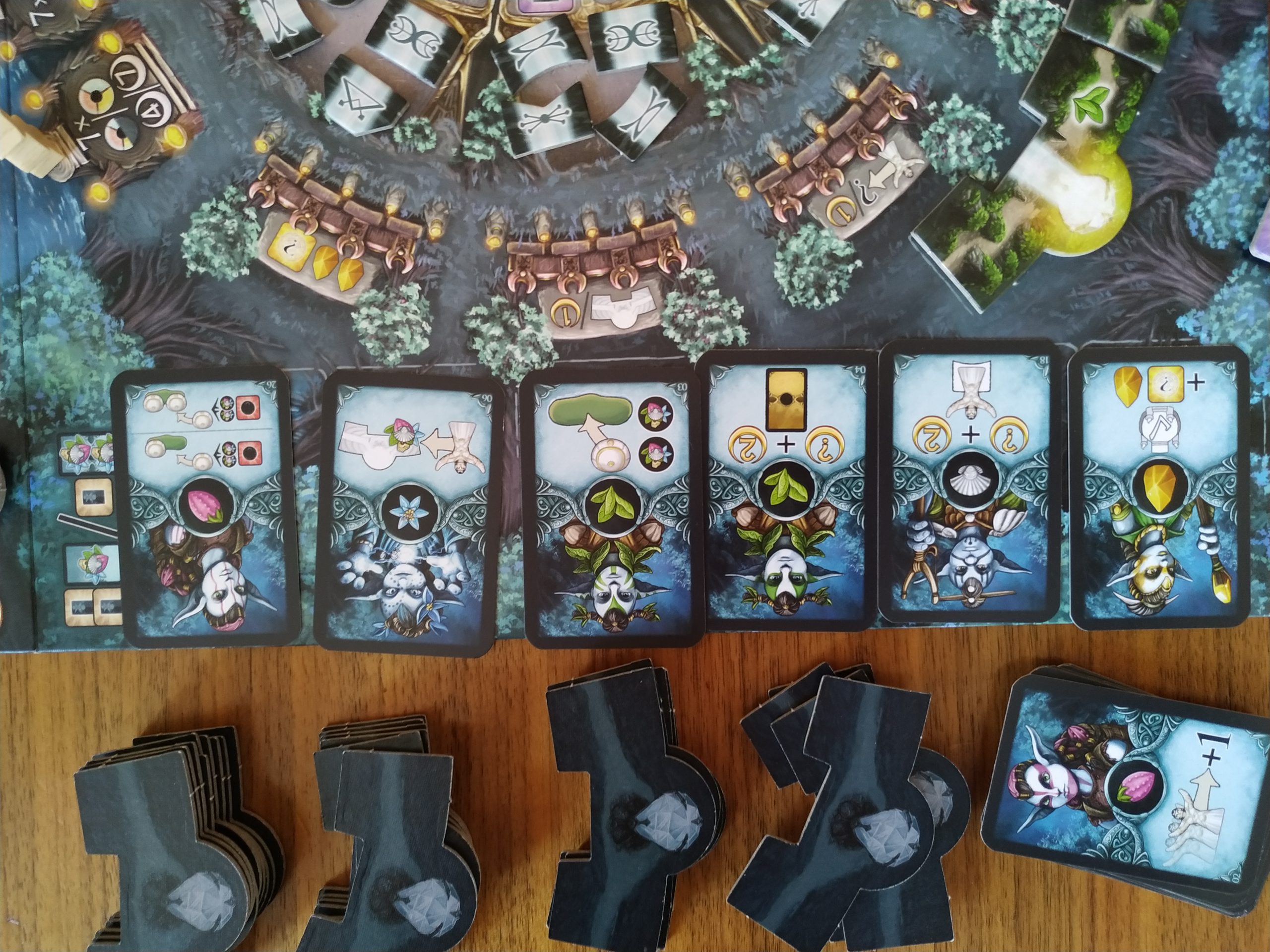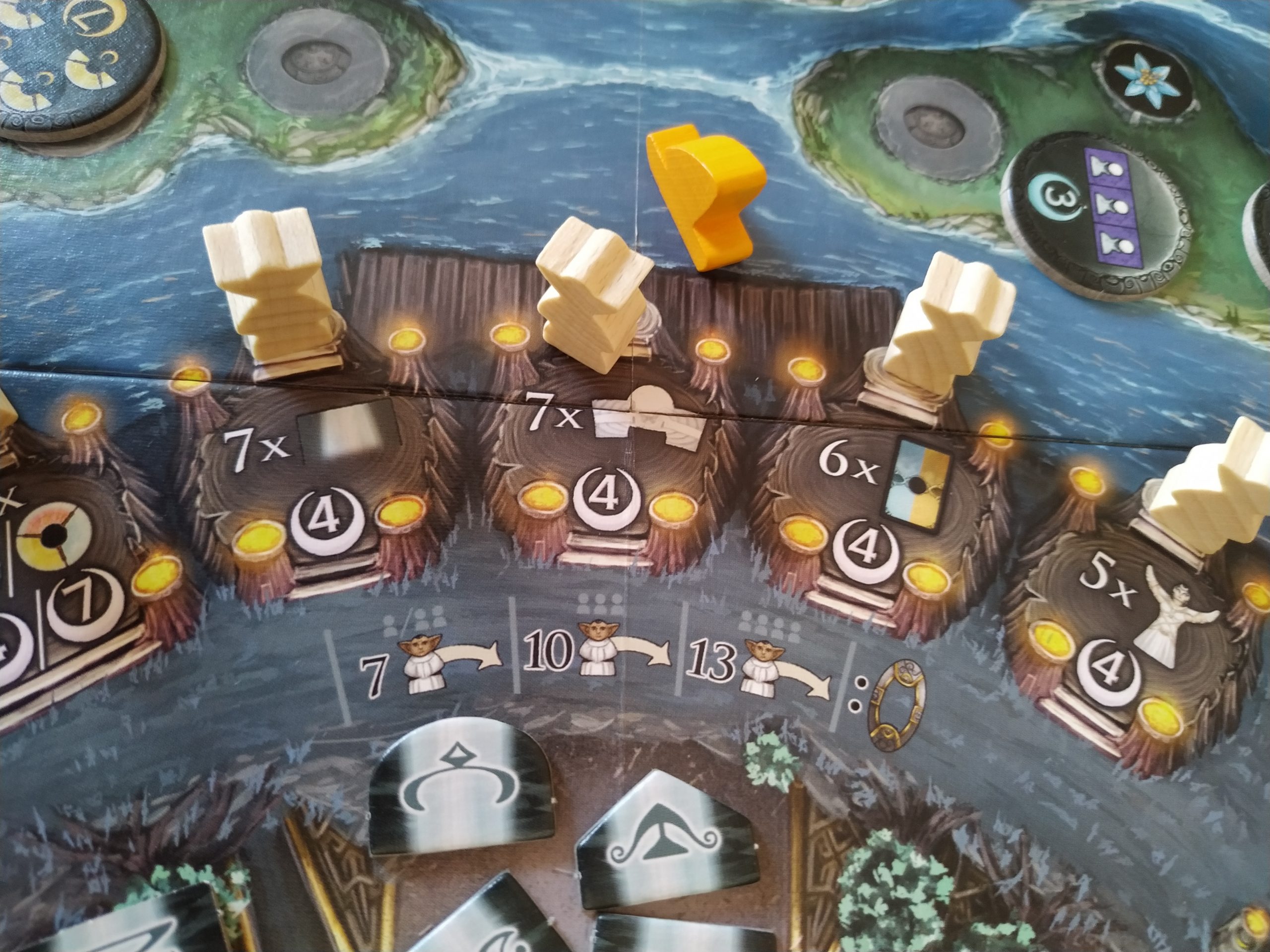 Pour le reste, on va se déplacer avec son bateau, dépenser des ressources pour acquérir des tâches à réaliser, inviter des gardiens, construire une allée, récupérer des portails, faire avancer des gardiens sur la piste pour récupérer des ressources, engager des gnomes, allumer un feu… plus quelques actions bonus. C’est beaucoup et certaines actions posées dépendront des tâches que vous aurez récoltées qui vous forceront à quelques coups pour les valider. Cela annonce une grande rejouabilité comme un Château de Bourgogne puisque les tâches ne seront pas les mêmes d’une partie à l’autre. Impossible d’avoir l’assurance d’un plan de jeu fixe basé sur une tâche qui ne sera peut-être pas présente dans cette partie. L’avenir dira si une tâche (ou un type) est plus rentable qu’une autre provoquant la ruée sur celle si dans les premiers coups. Même type de questionnement sur les spécialistes gnomes qui vous donnent un avantage durant tout le jeu, dont certains semblent plus rentables que d’autres (vu le nombre, on comprend la difficulté de les équilibrer tous).