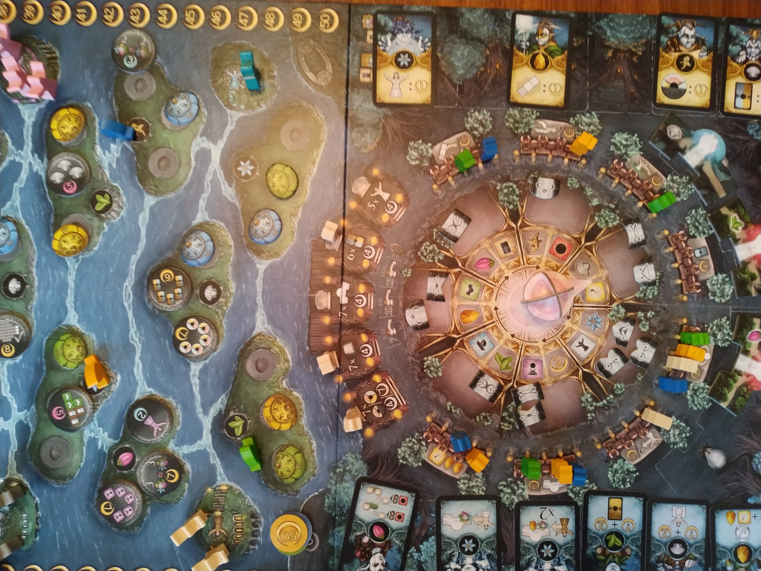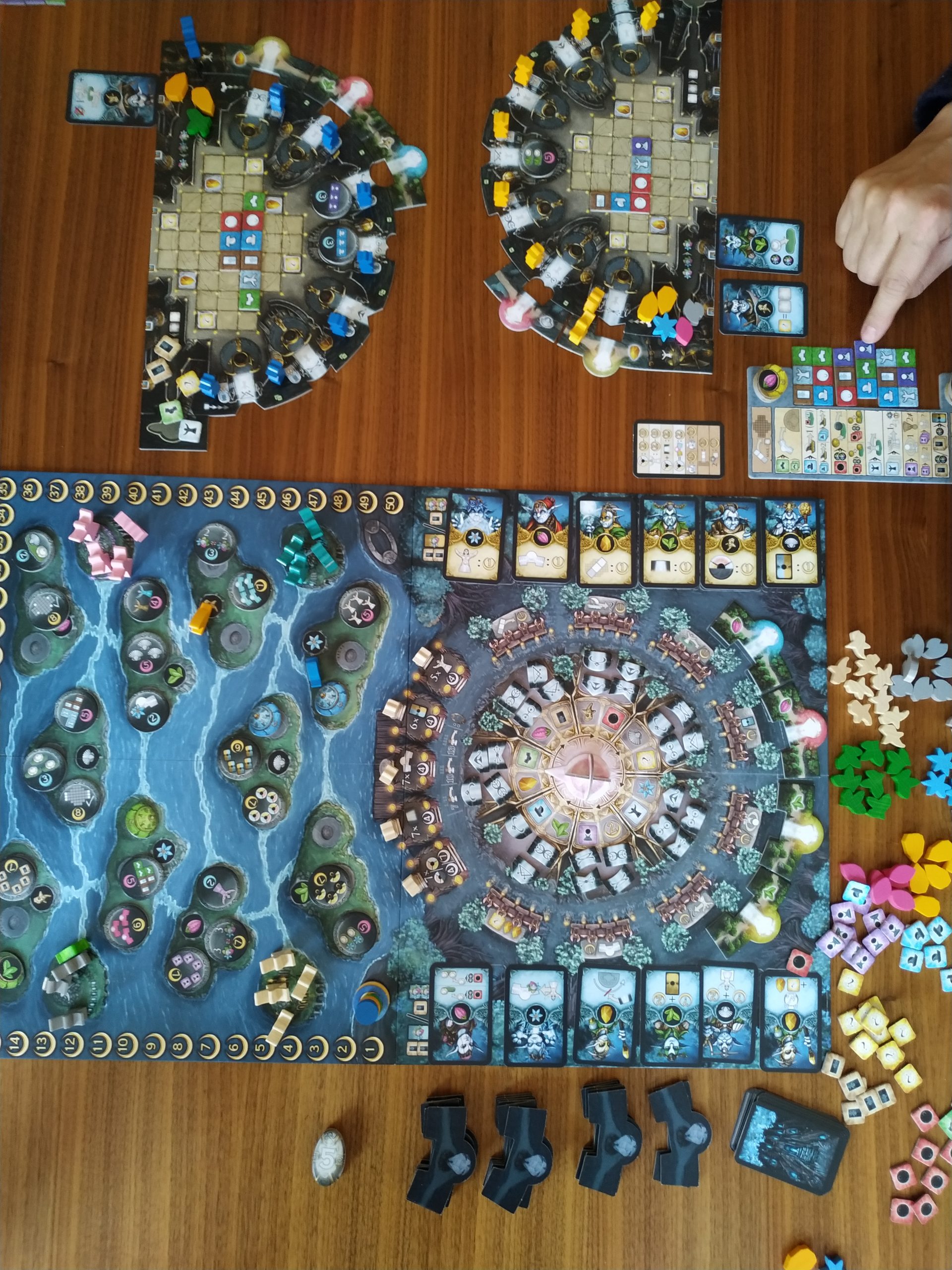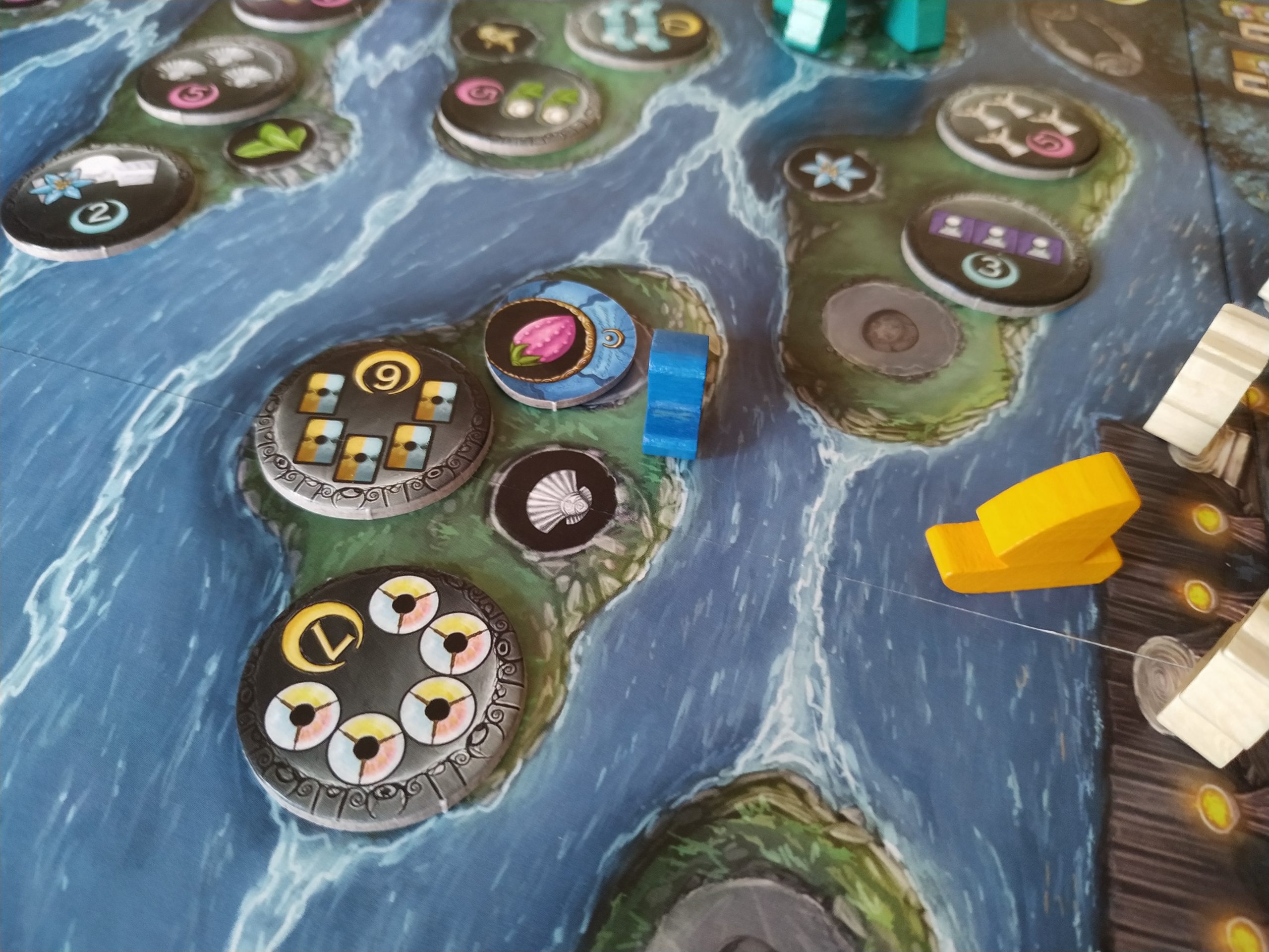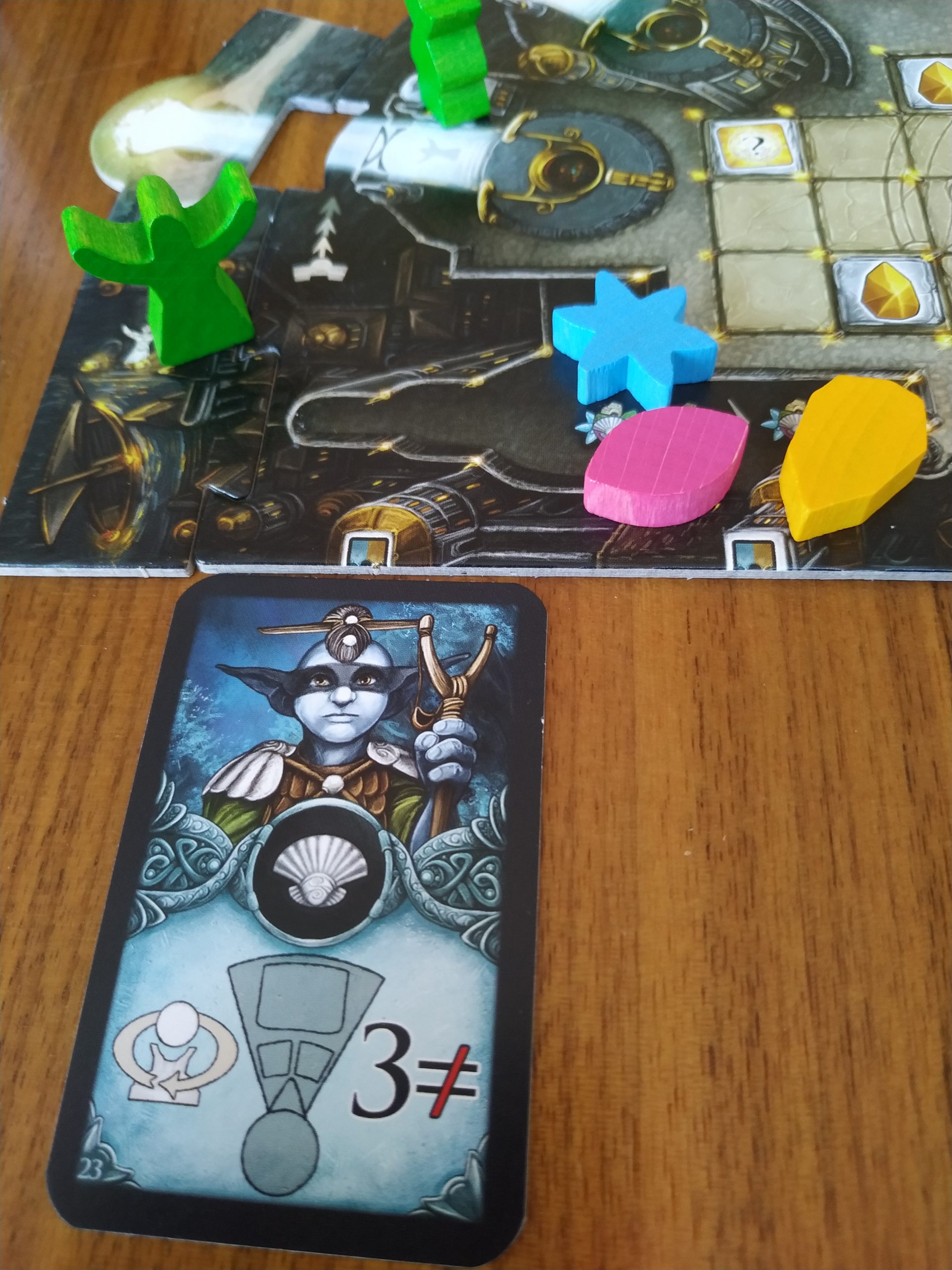 Pour le reste, on va se déplacer avec son bateau, dépenser des ressources pour acquérir des tâches à réaliser, inviter des gardiens, construire une allée, récupérer des portails, faire avancer des gardiens sur la piste pour récupérer des ressources, engager des gnomes, allumer un feu… plus quelques actions bonus. C’est beaucoup et certaines actions posées dépendront des tâches que vous aurez récoltées qui vous forceront à quelques coups pour les valider. Cela annonce une grande rejouabilité comme un Château de Bourgogne puisque les tâches ne seront pas les mêmes d’une partie à l’autre. Impossible d’avoir l’assurance d’un plan de jeu fixe basé sur une tâche qui ne sera peut-être pas présente dans cette partie. L’avenir dira si une tâche (ou un type) est plus rentable qu’une autre provoquant la ruée sur celle si dans les premiers coups. Même type de questionnement sur les spécialistes gnomes qui vous donnent un avantage durant tout le jeu, dont certains semblent plus rentables que d’autres (vu le nombre, on comprend la difficulté de les équilibrer tous).