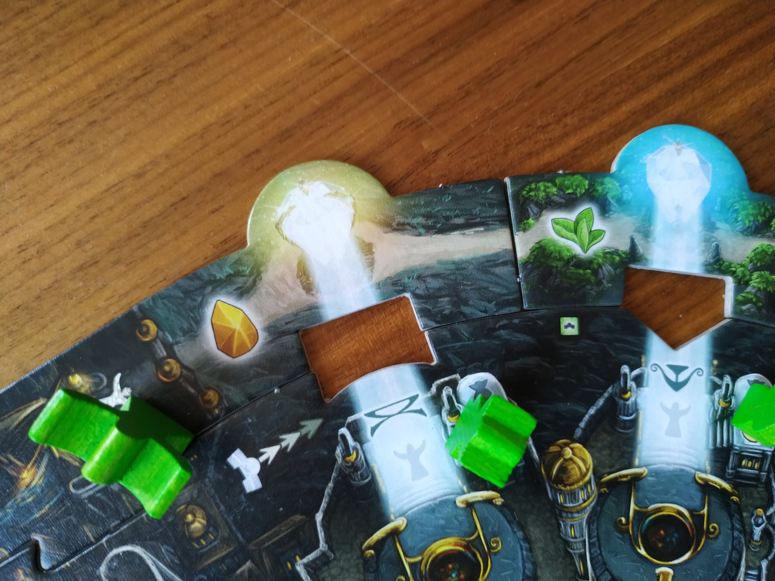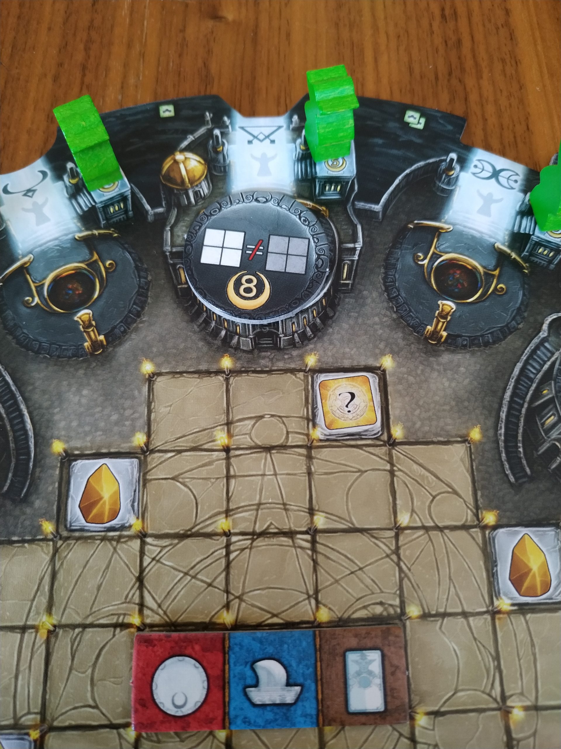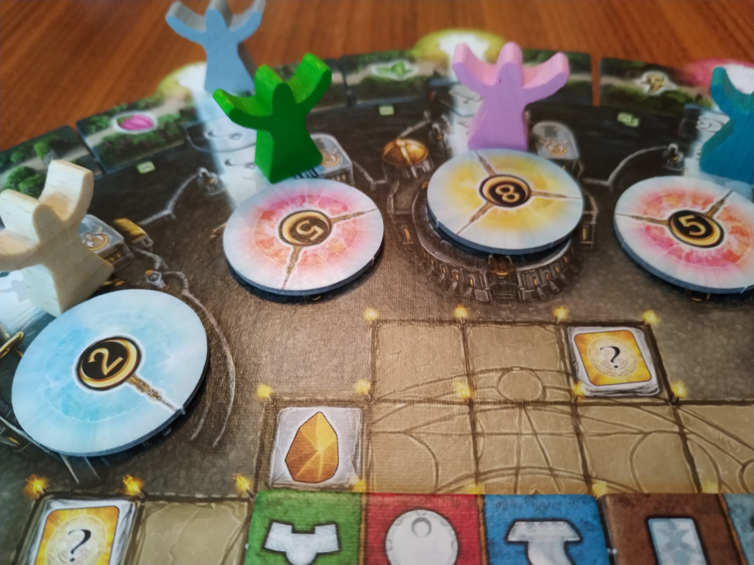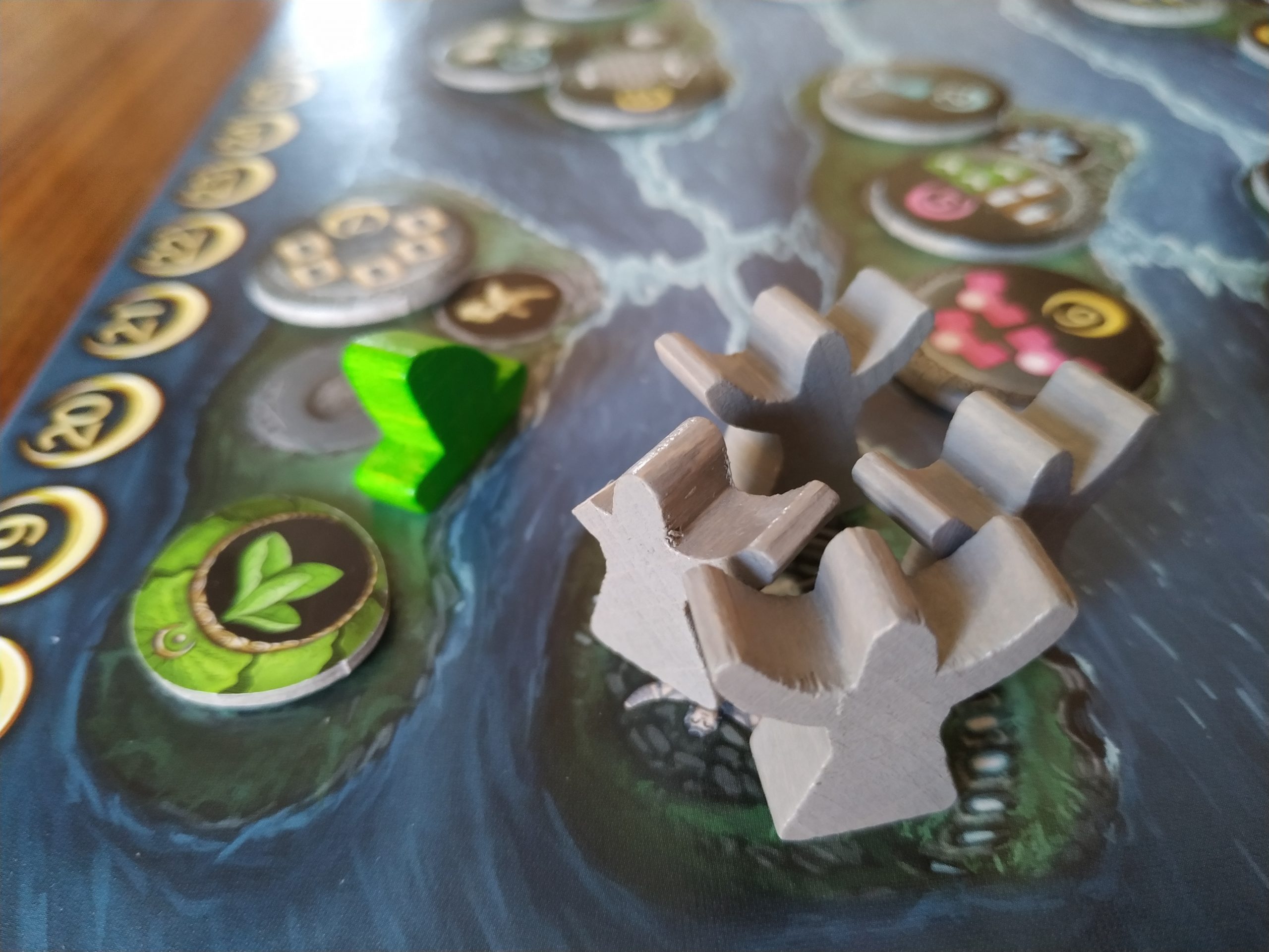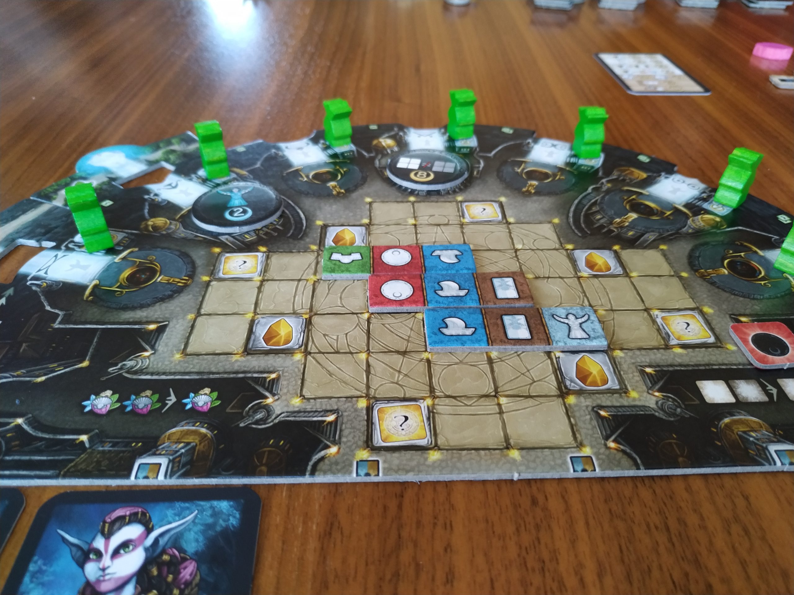 Pour le reste, on va se déplacer avec son bateau, dépenser des ressources pour acquérir des tâches à réaliser, inviter des gardiens, construire une allée, récupérer des portails, faire avancer des gardiens sur la piste pour récupérer des ressources, engager des gnomes, allumer un feu… plus quelques actions bonus. C’est beaucoup et certaines actions posées dépendront des tâches que vous aurez récoltées qui vous forceront à quelques coups pour les valider. Cela annonce une grande rejouabilité comme un Château de Bourgogne puisque les tâches ne seront pas les mêmes d’une partie à l’autre. Impossible d’avoir l’assurance d’un plan de jeu fixe basé sur une tâche qui ne sera peut-être pas présente dans cette partie. L’avenir dira si une tâche (ou un type) est plus rentable qu’une autre provoquant la ruée sur celle si dans les premiers coups. Même type de questionnement sur les spécialistes gnomes qui vous donnent un avantage durant tout le jeu, dont certains semblent plus rentables que d’autres (vu le nombre, on comprend la difficulté de les équilibrer tous).
