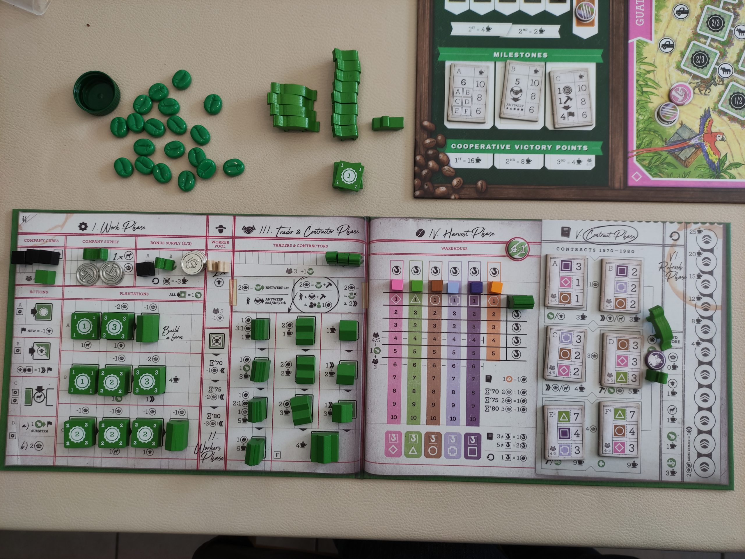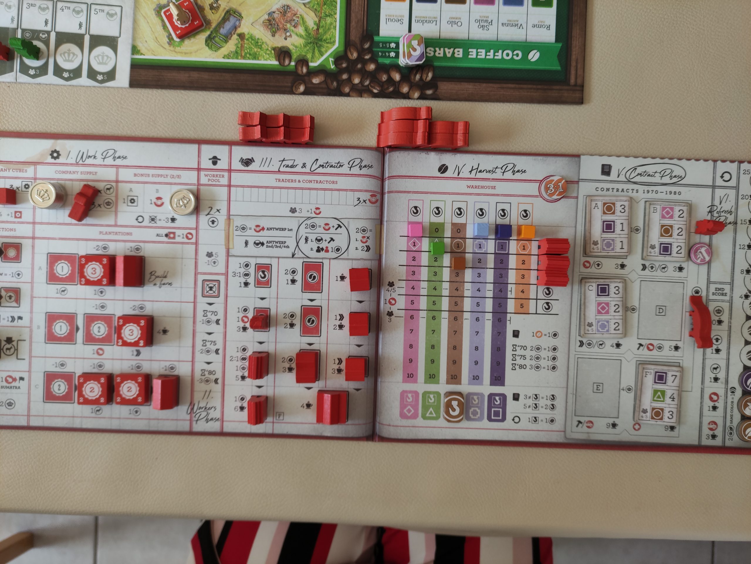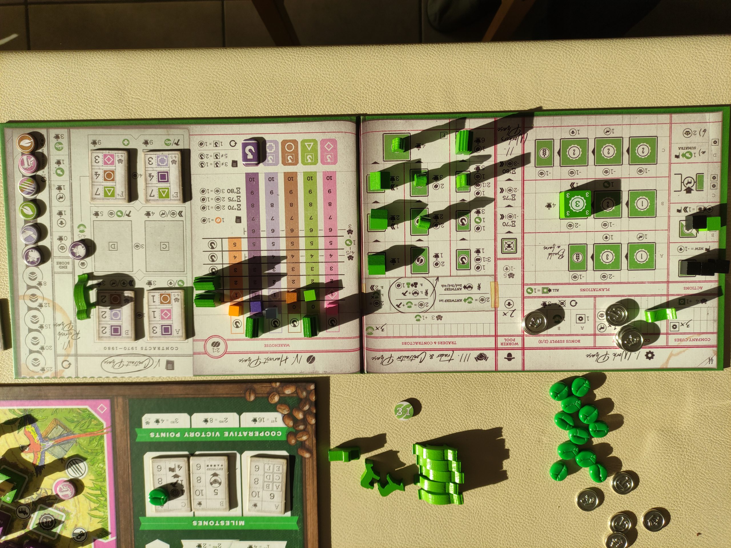 C’est fluide une fois tout assimilé, assez logique et imbriqué, dans le thème et un bon jeu de gestion sans besoin de texte in game. J’imagine qu’une VF peut clairement et calmement s’envisager. Cette première partie donne un effet plus que correct à l’ensemble, mais nécessitera d’autres pour profiter plus intensément des actions de développement, surtout si tous les joueurs connaissent déjà les règles et que l’on gagne du temps sur cette mise en place. Comme le café, il nécessite sans doute une torréfaction pour développer toute sa saveur.