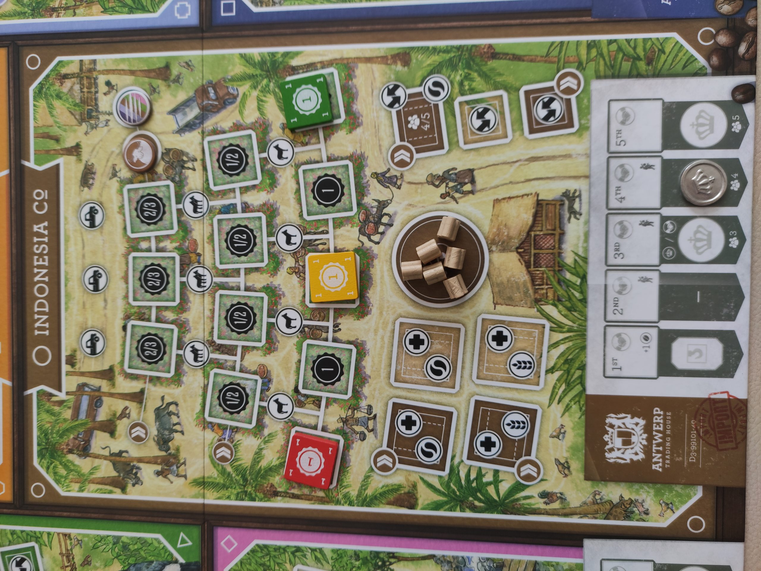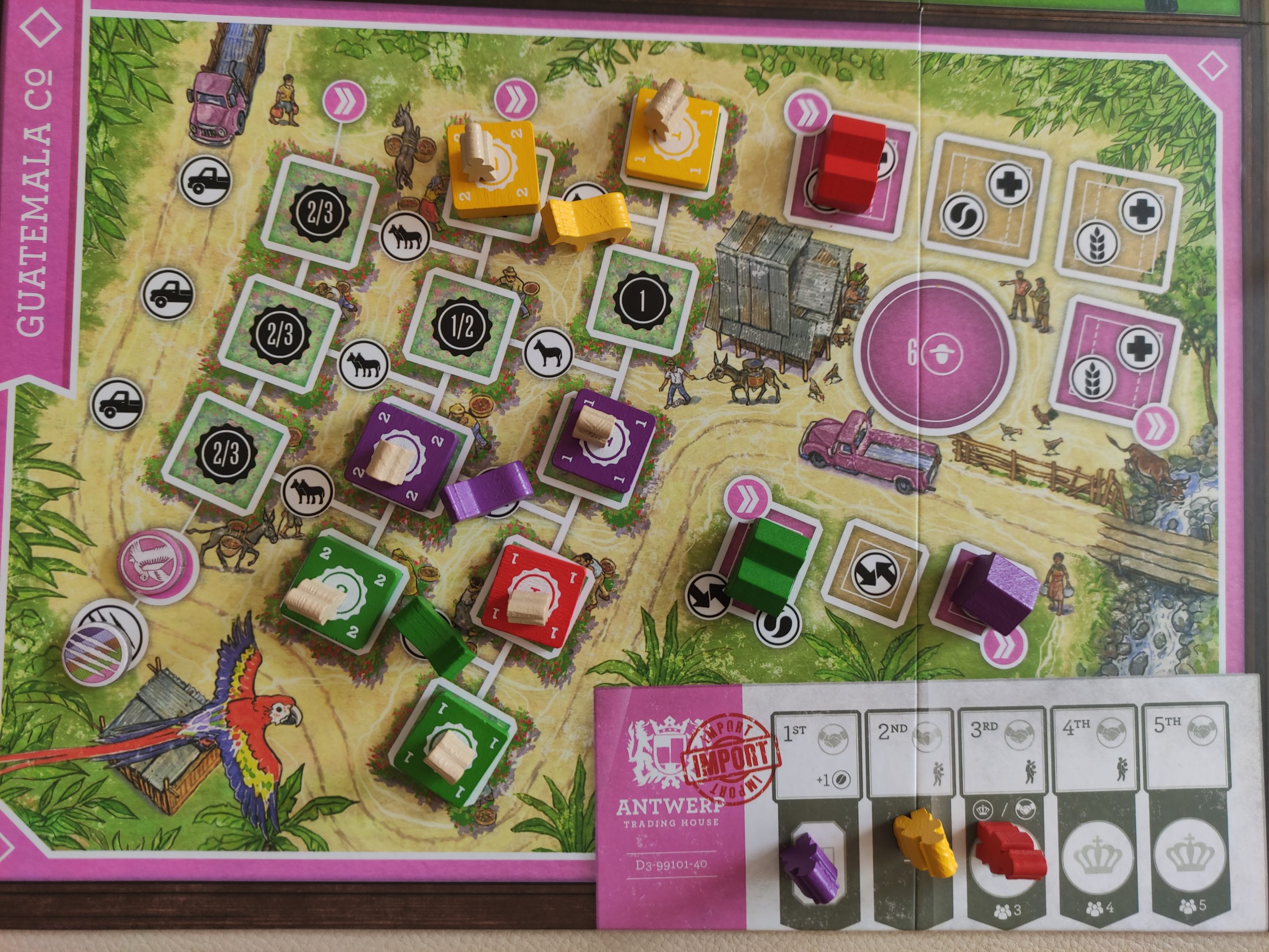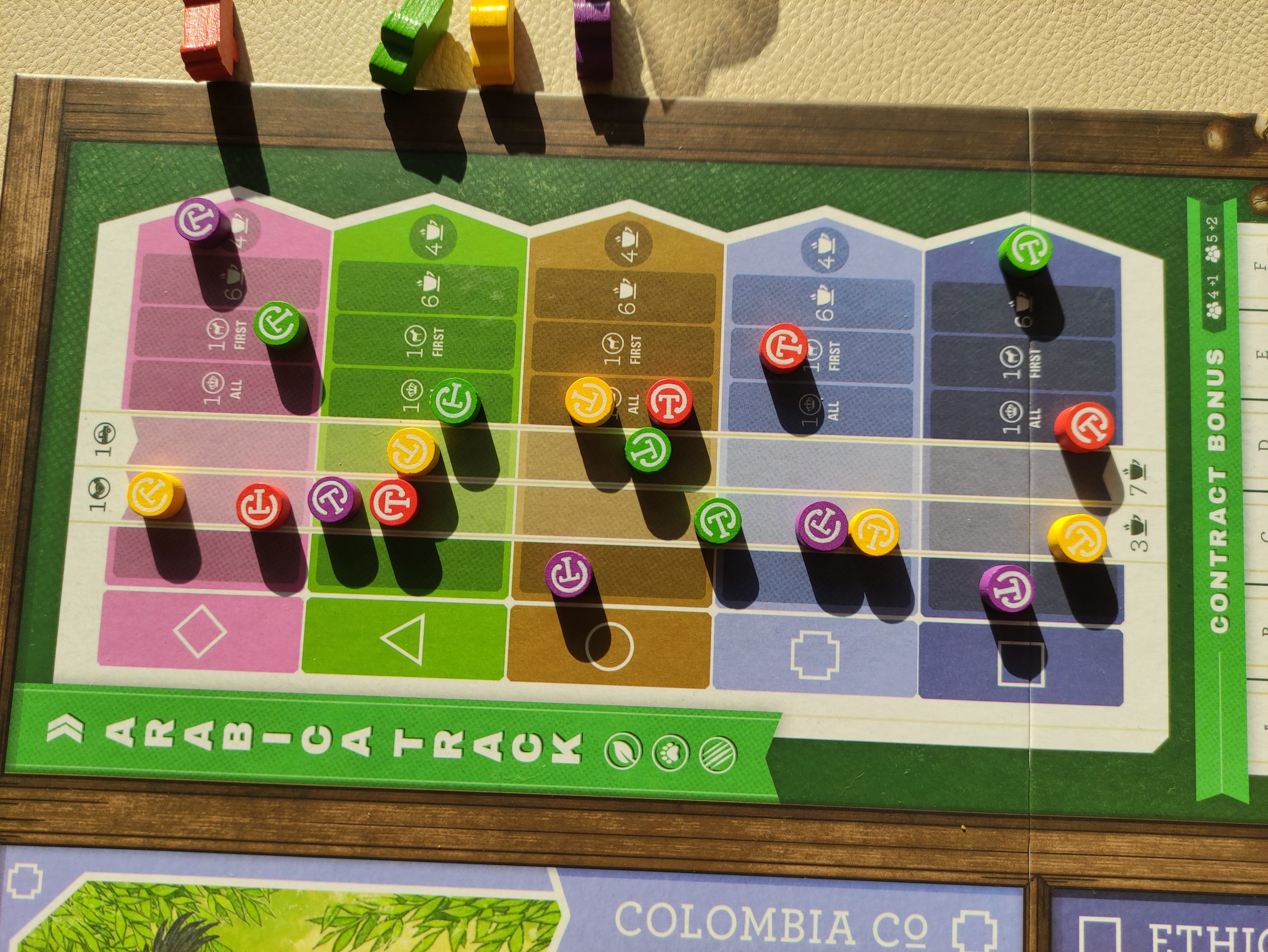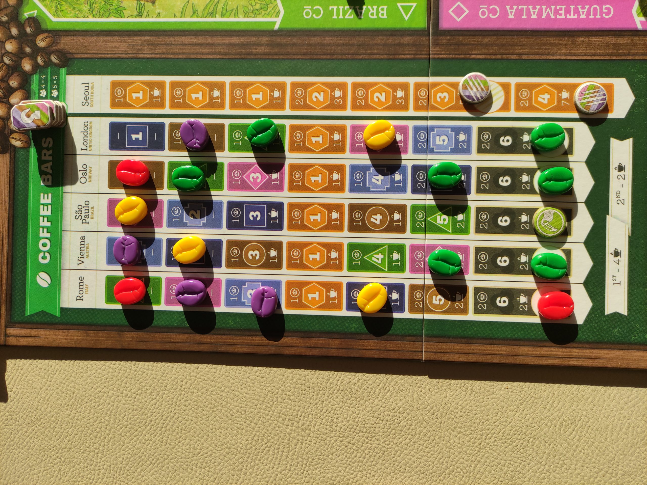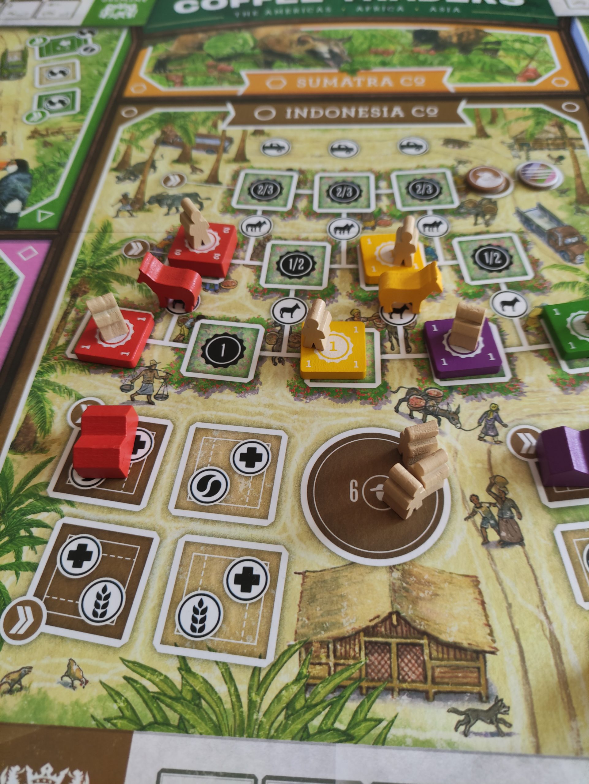 - On produit zone après zone, chaque plantation produisant 2 grains d’un café d’une couleur spécifique. On les répartis alors en commençant par les maisons de café construites (1 grain chacune) puis les traders un grain à la fois façon awalé (avec un bonus au premier placé). On se retrouve donc avec 14 grains à répartir en 3 sans maison de café à 6-4-4 entre les traders. Chaque Civette produit à son propriétaire un grain qui servira de joker éventuel (ou sera vendu for cher dans les coffee bars).