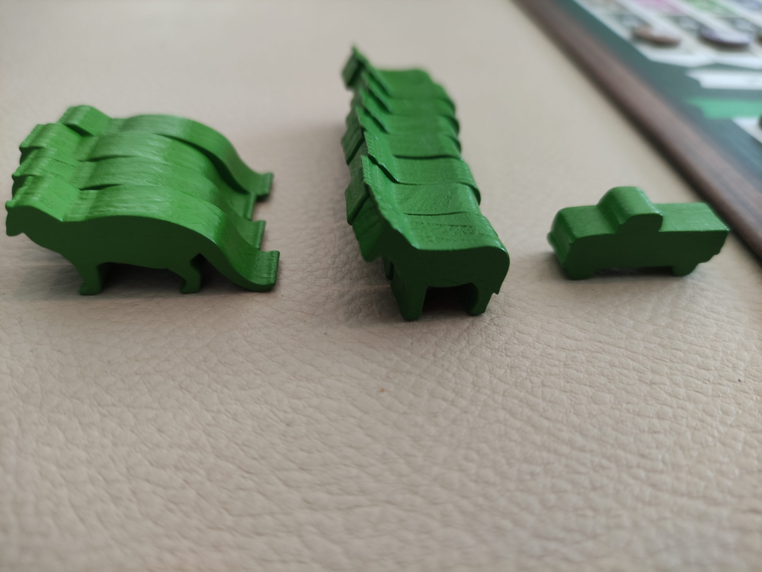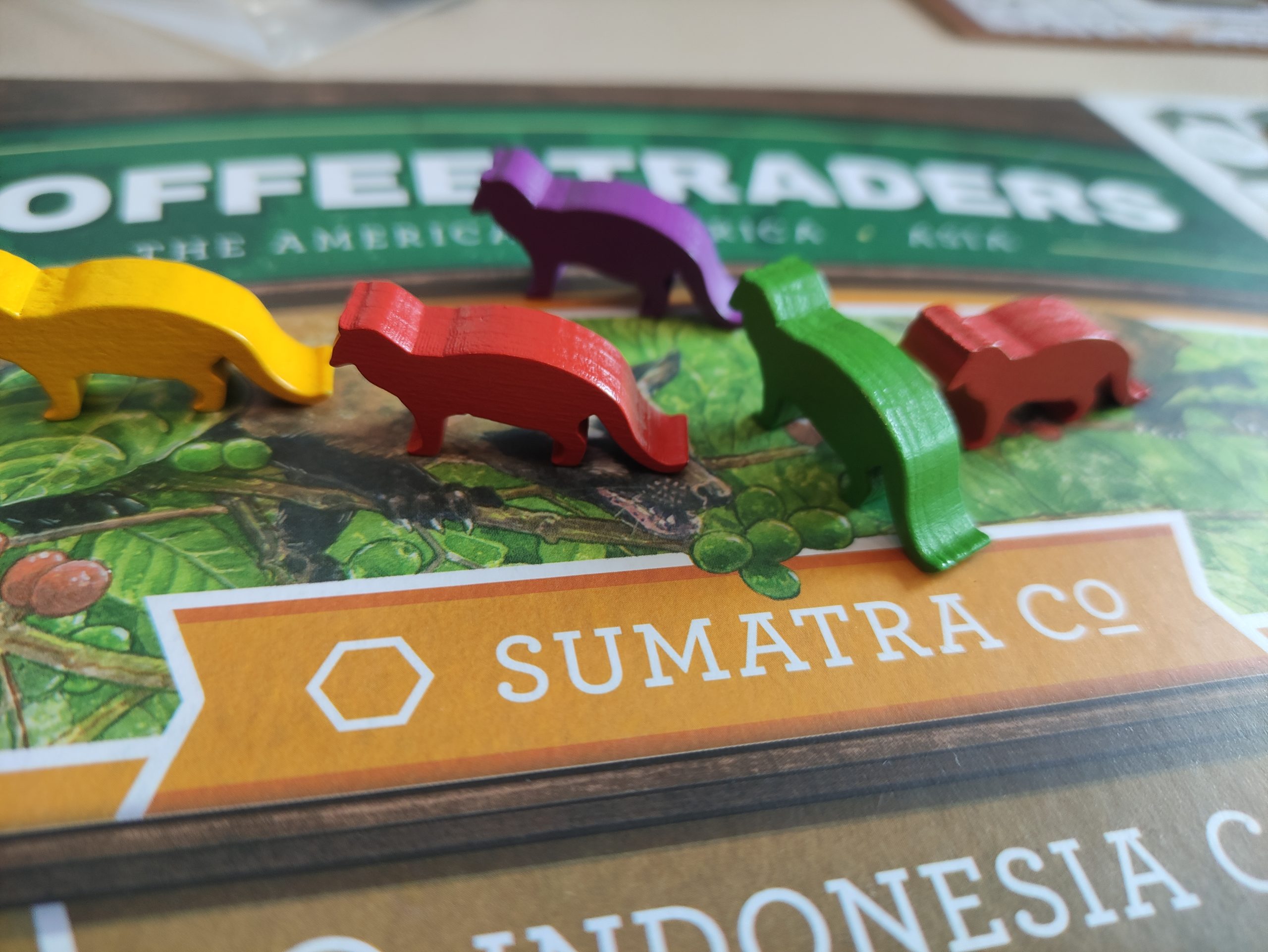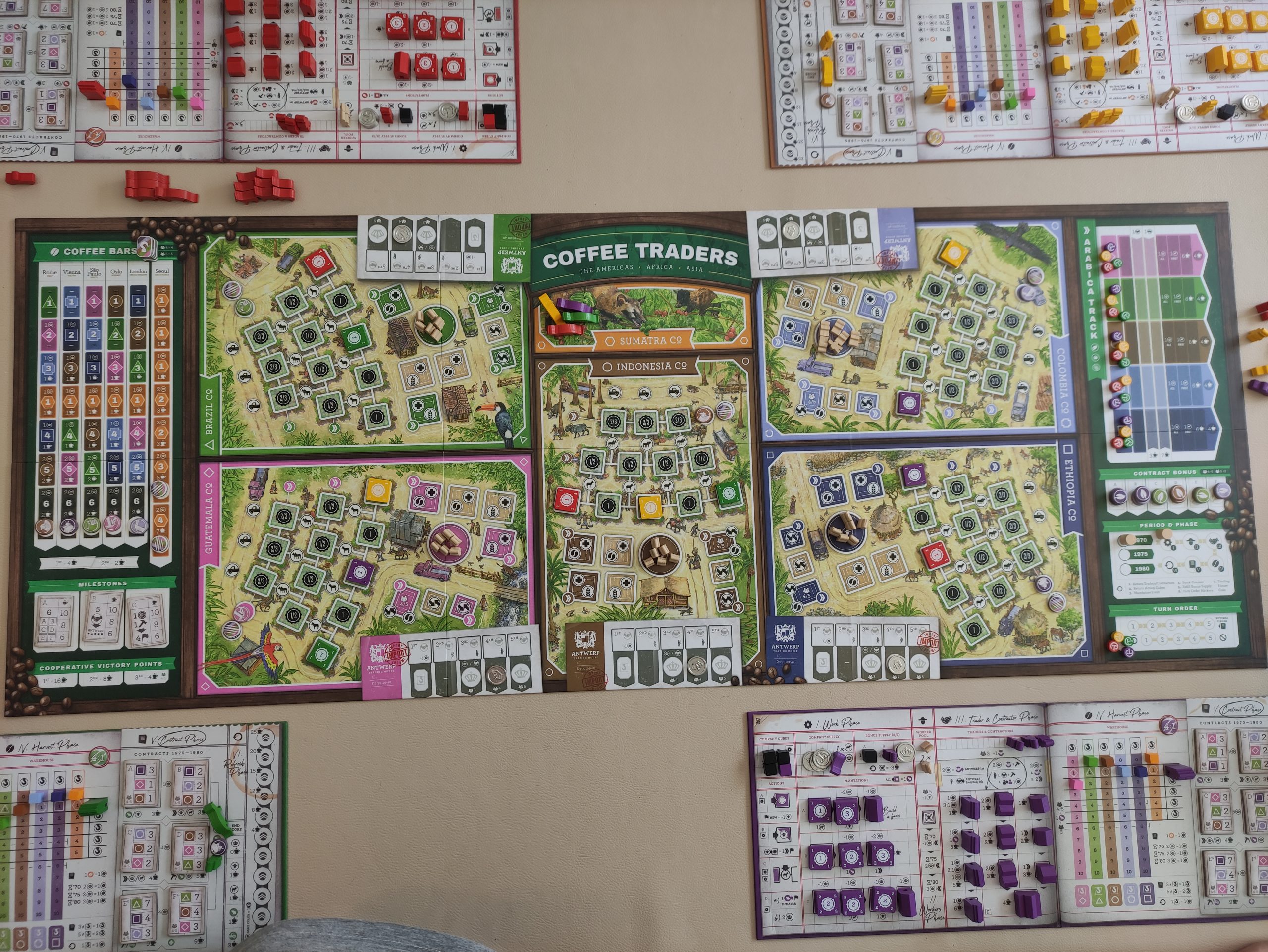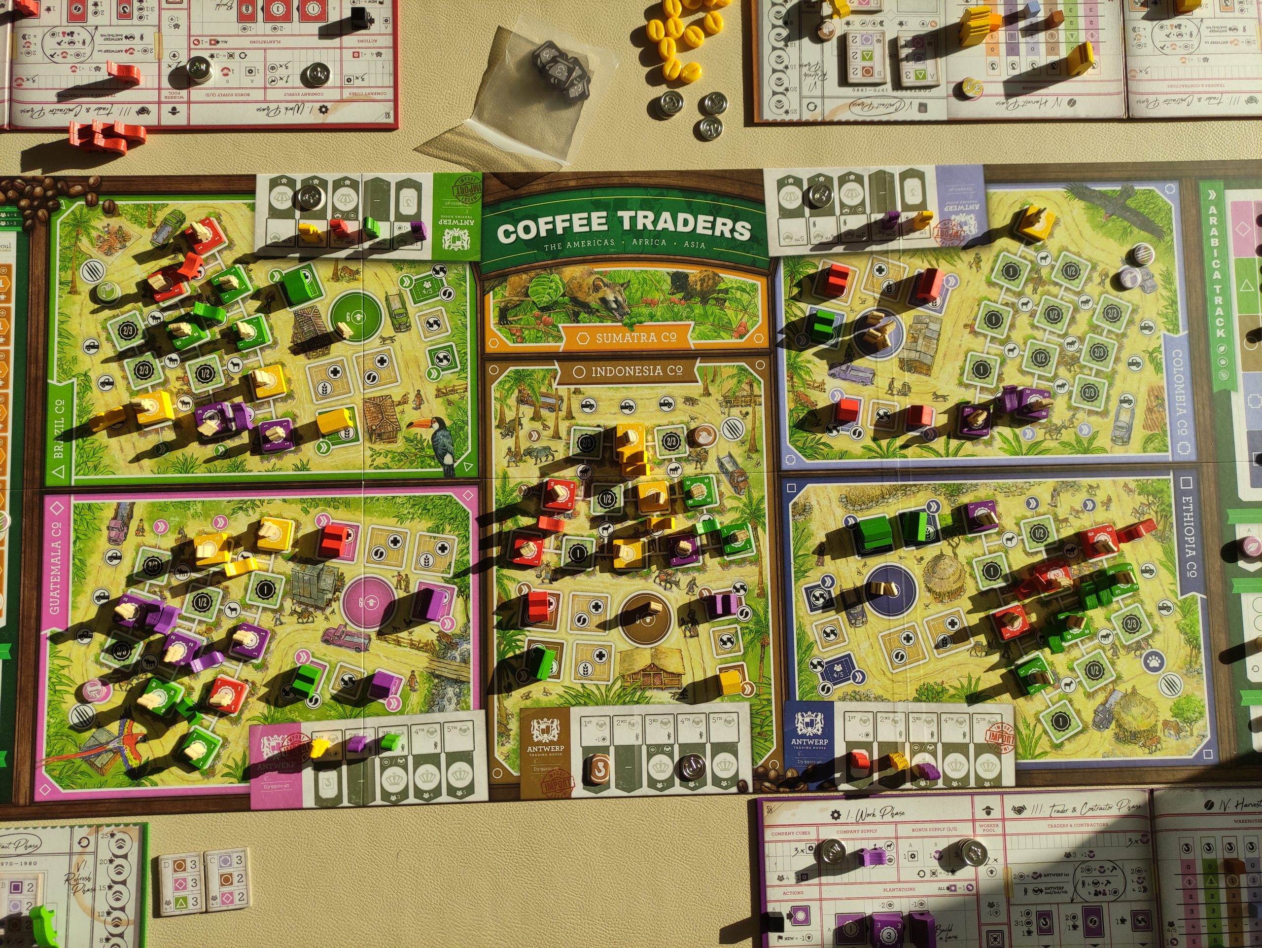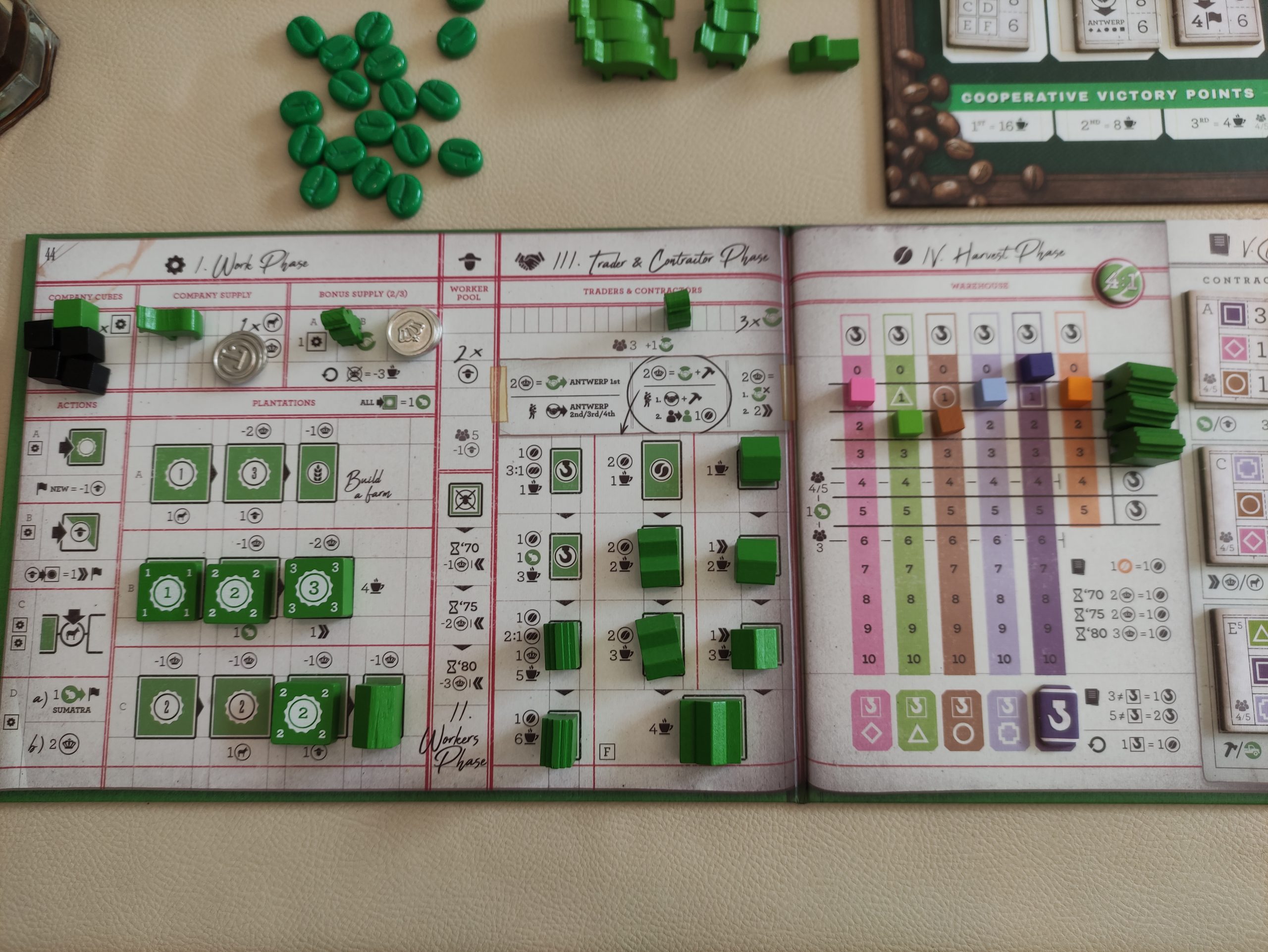 - On produit zone après zone, chaque plantation produisant 2 grains d’un café d’une couleur spécifique. On les répartis alors en commençant par les maisons de café construites (1 grain chacune) puis les traders un grain à la fois façon awalé (avec un bonus au premier placé). On se retrouve donc avec 14 grains à répartir en 3 sans maison de café à 6-4-4 entre les traders. Chaque Civette produit à son propriétaire un grain qui servira de joker éventuel (ou sera vendu for cher dans les coffee bars).