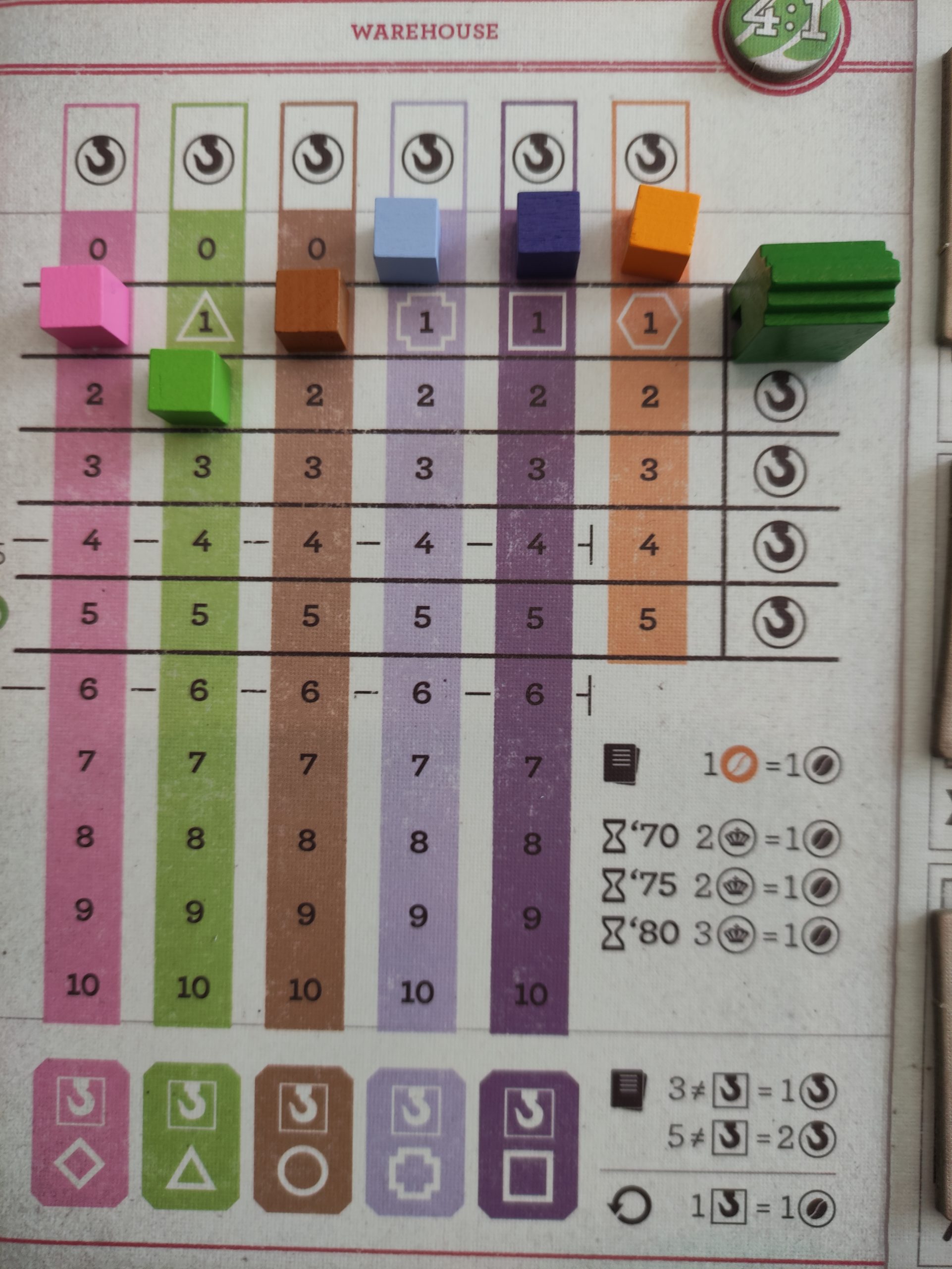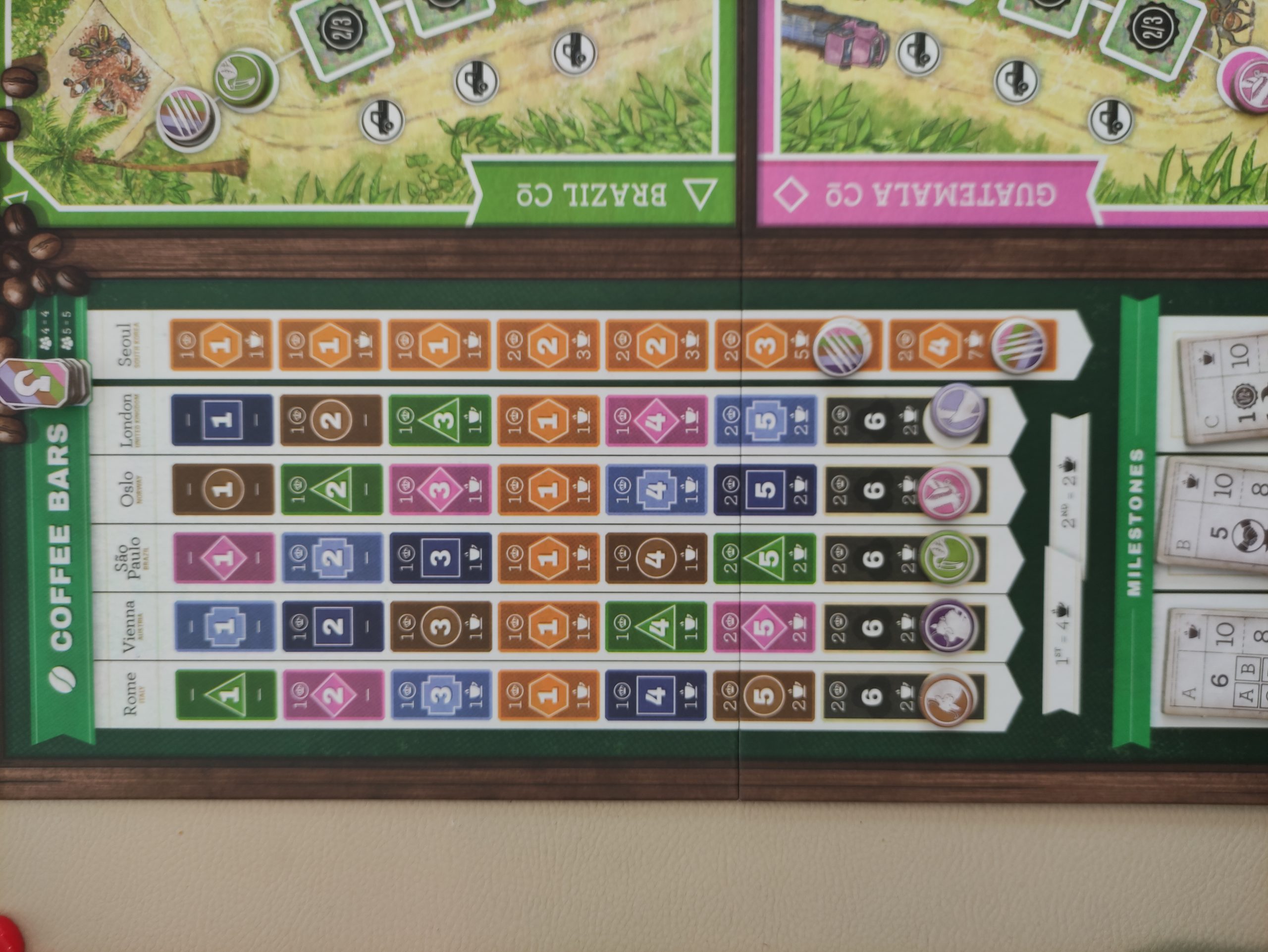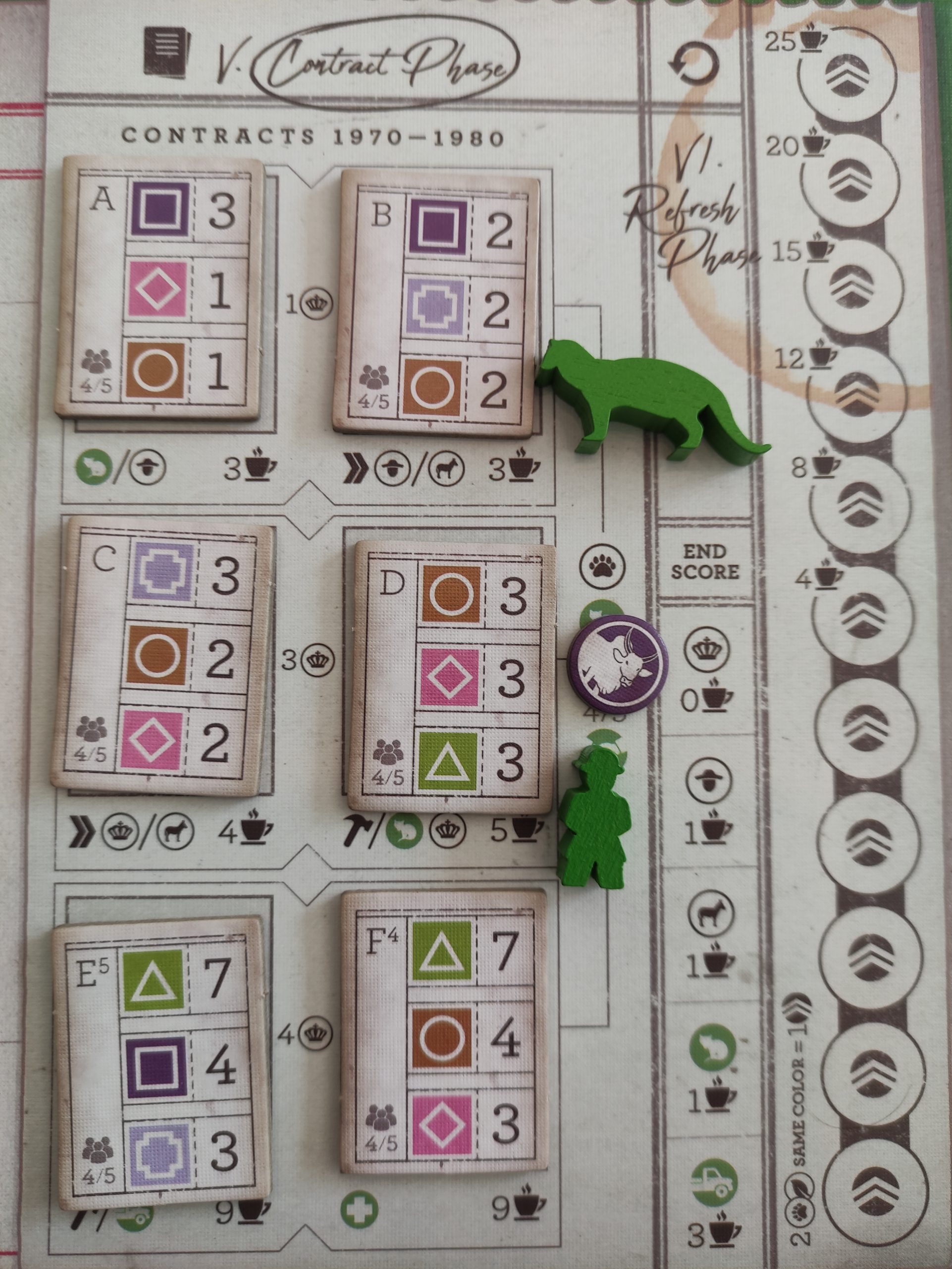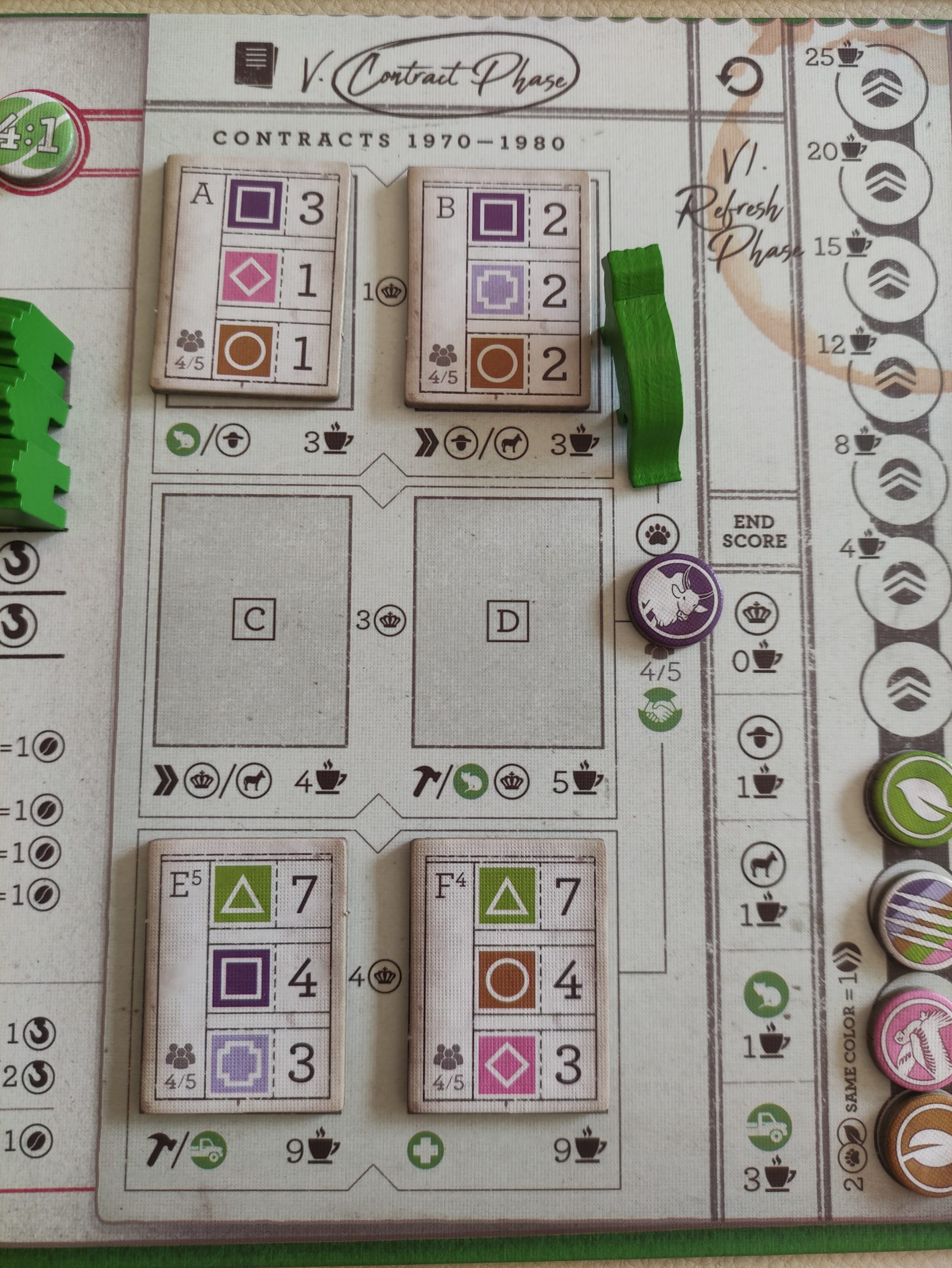 - Avec sa production on réalise chacun son tour les contrats (de A à F) de plus en plus difficile (dans l’ordre de son choix) pour avoir de l’argent, des PV et des ressources. On peut aussi vendre dans les Coffee bars en grappe plus ou moins importantes, pour de l’argent, des PV et une lutte de majorité.