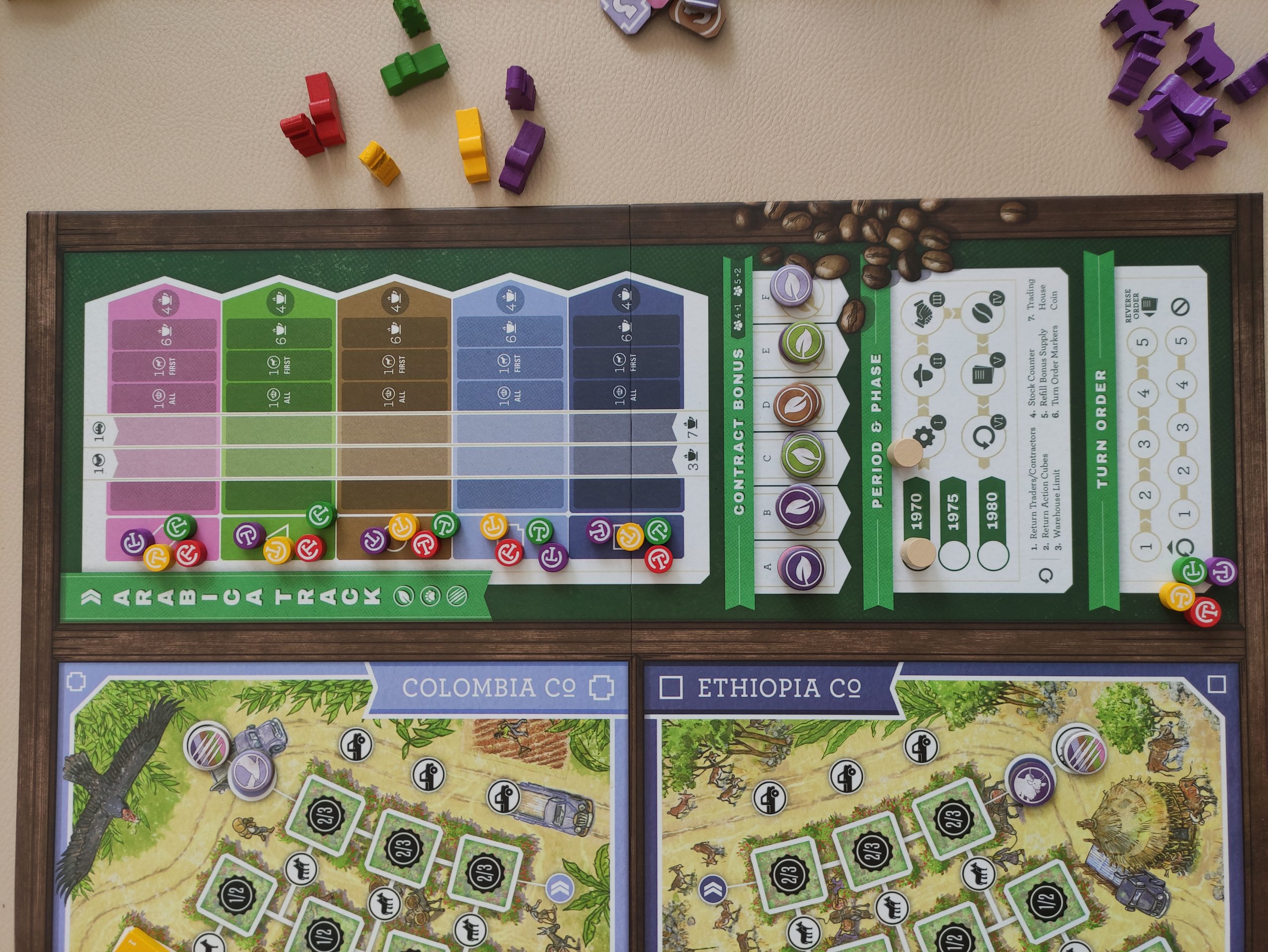 On se rend vite compte que les 6 étapes du jeu sont clairement dans le thème, on se la joue Fair Trade sur la production en développant les coopératives dans les régions réputées pour leur café en installant des plantations et un responsable. Lorsqu’elles produiront, les traders sur place se répartiront équitablement le café (enfin, premier arrivé, premier servis quand même) avant de répondre aux contrats internationaux et en fournissant les Bars à cafés branchés. Du producteur au consommateur.