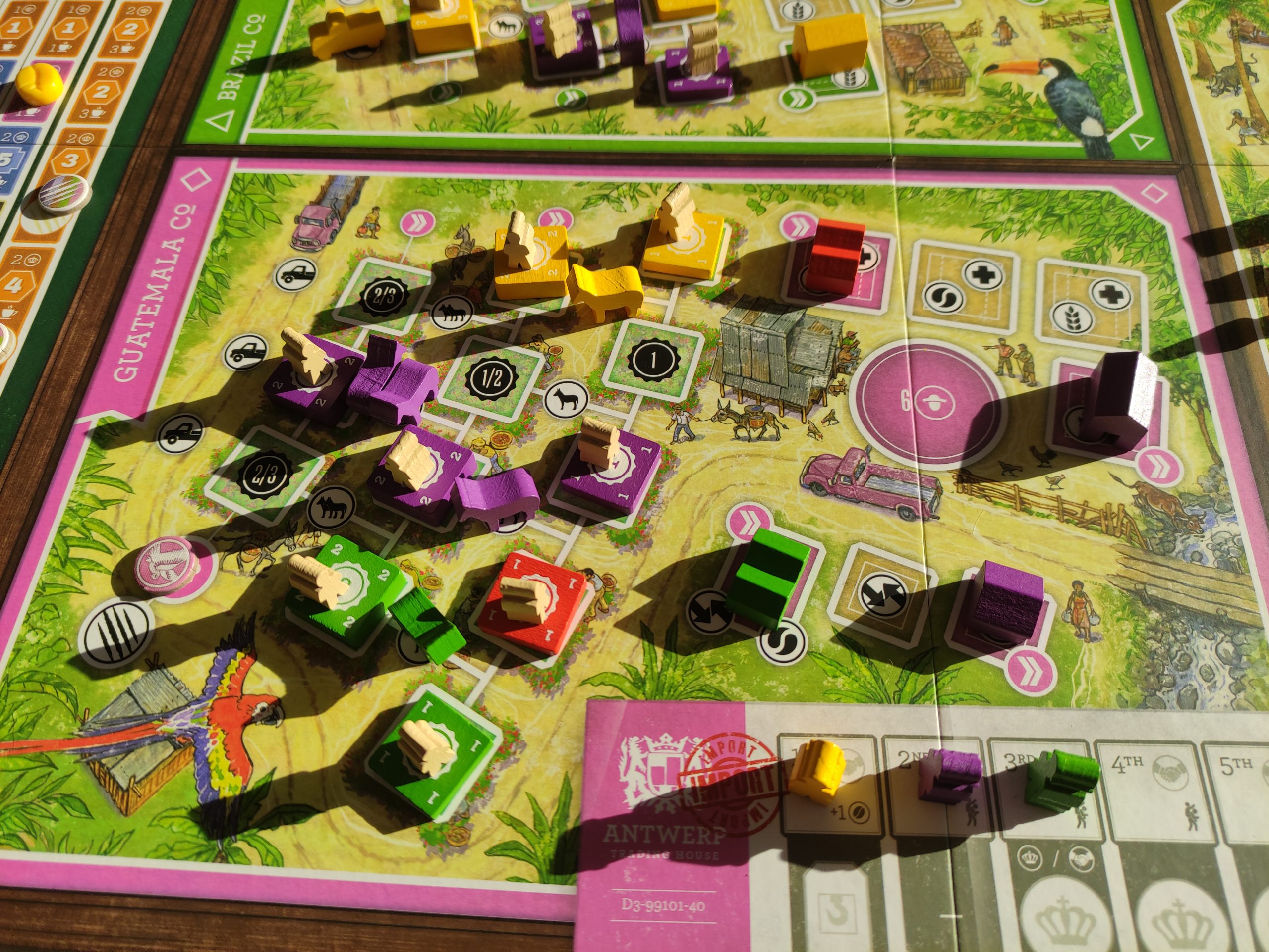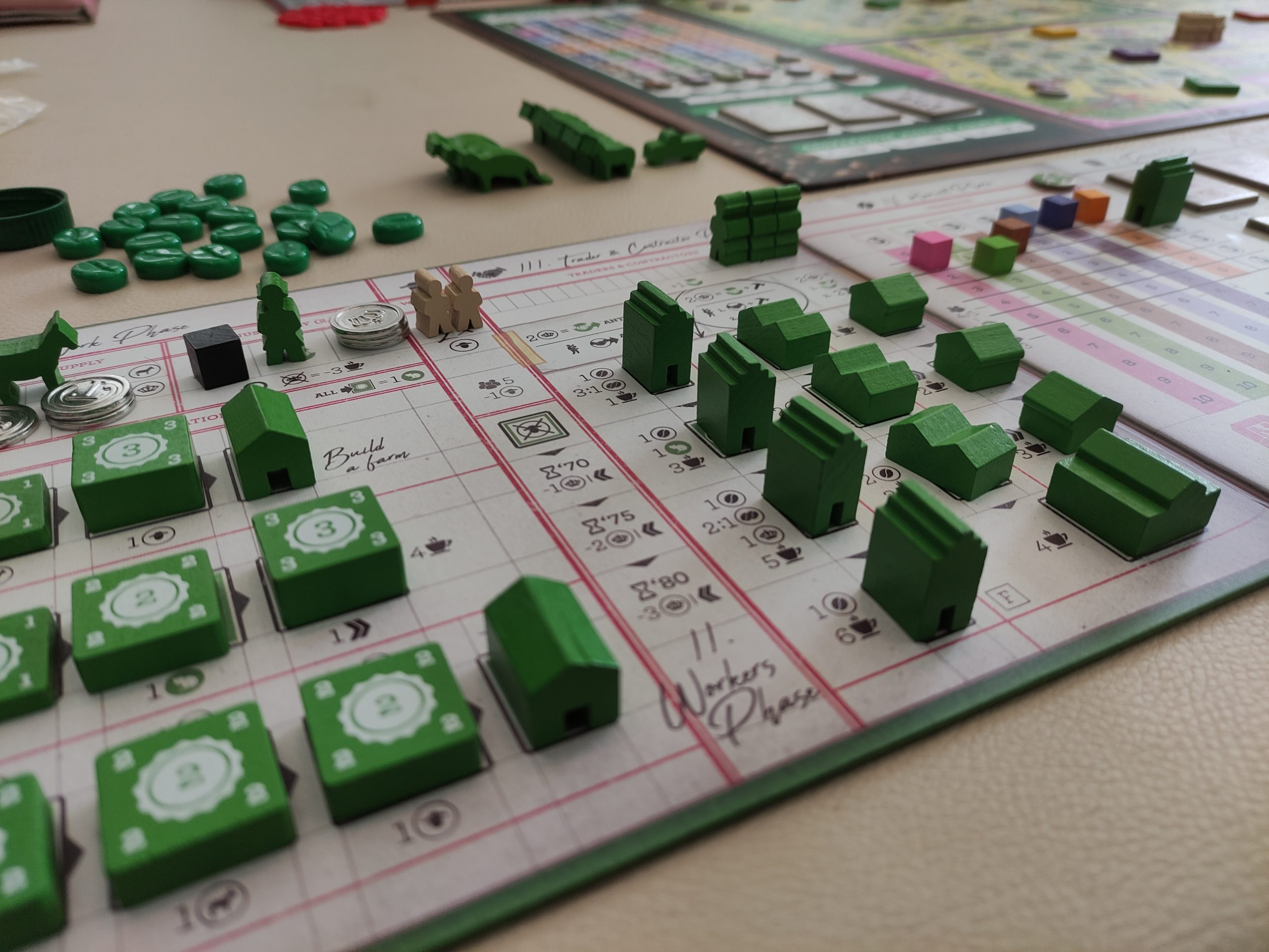 - On place des plantations : 3 (voire 4 ou 5) actions de construction ou désignation d’un travailleur en chef de plantation ou de collecte d’argent / développement de Civette (un animal générant par ses crottes le café le plus cher du monde). Les constructions sont sur une zone spécifique et par « étage » et niveau.