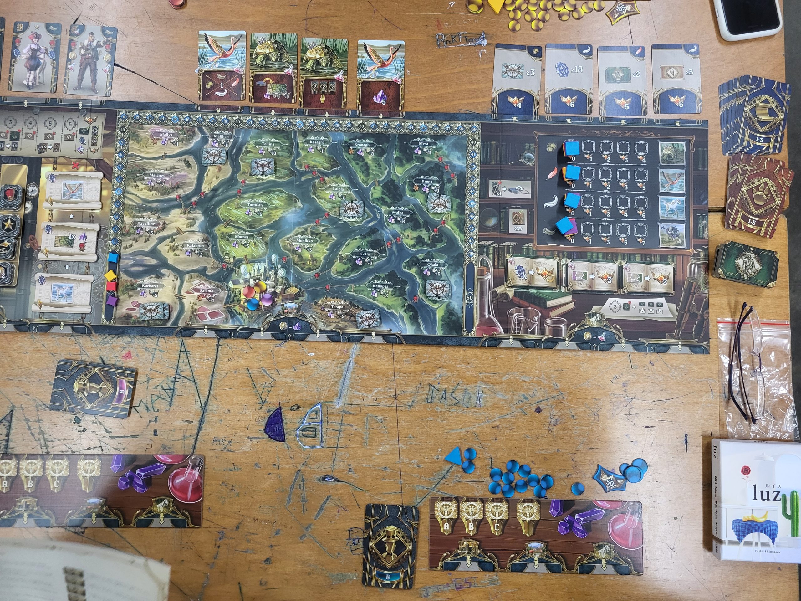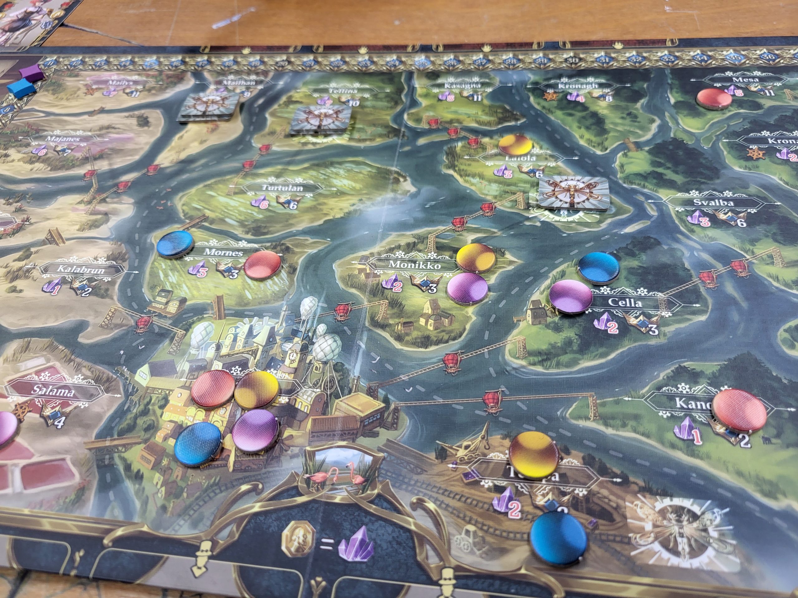 On termine à 103-100-100-90 en étant allés dans des voies différentes, se disant que cela tient parfois à rien et que le jeu est globalement équilibré. Bien sûr, si deux joueurs visent les mêmes objectifs ils risquent de se déforcer mutuellement, mais tout le monde s’y est retrouvé.