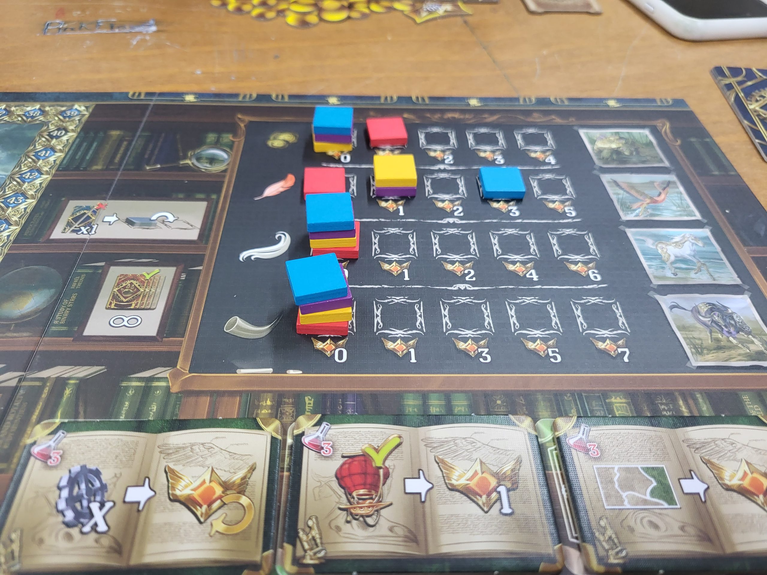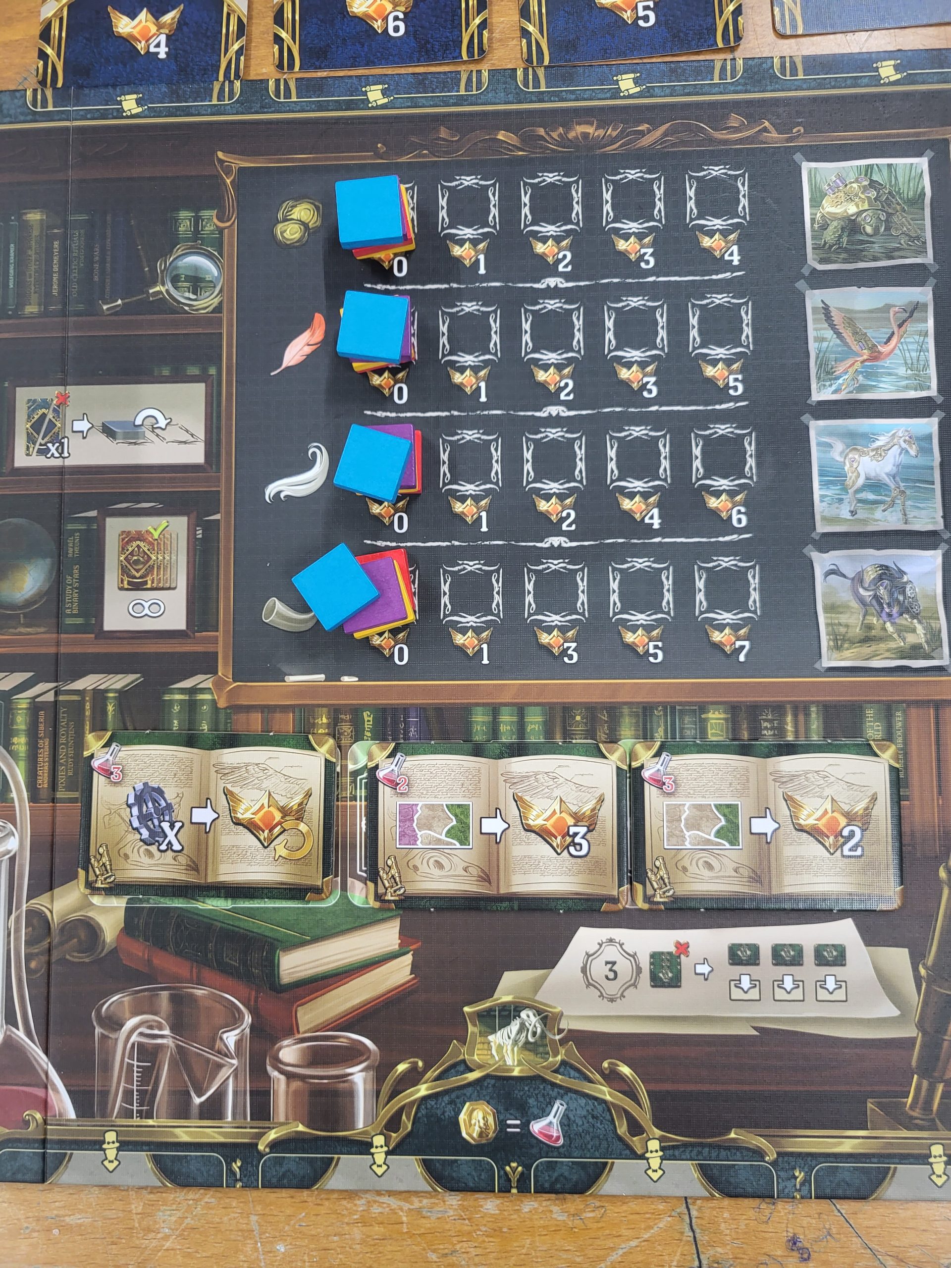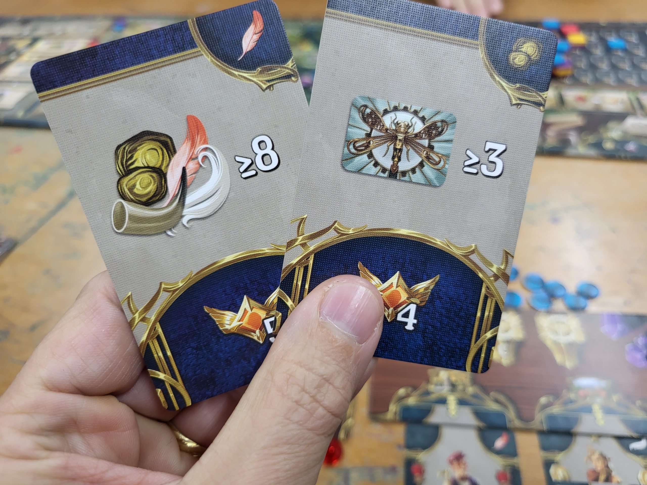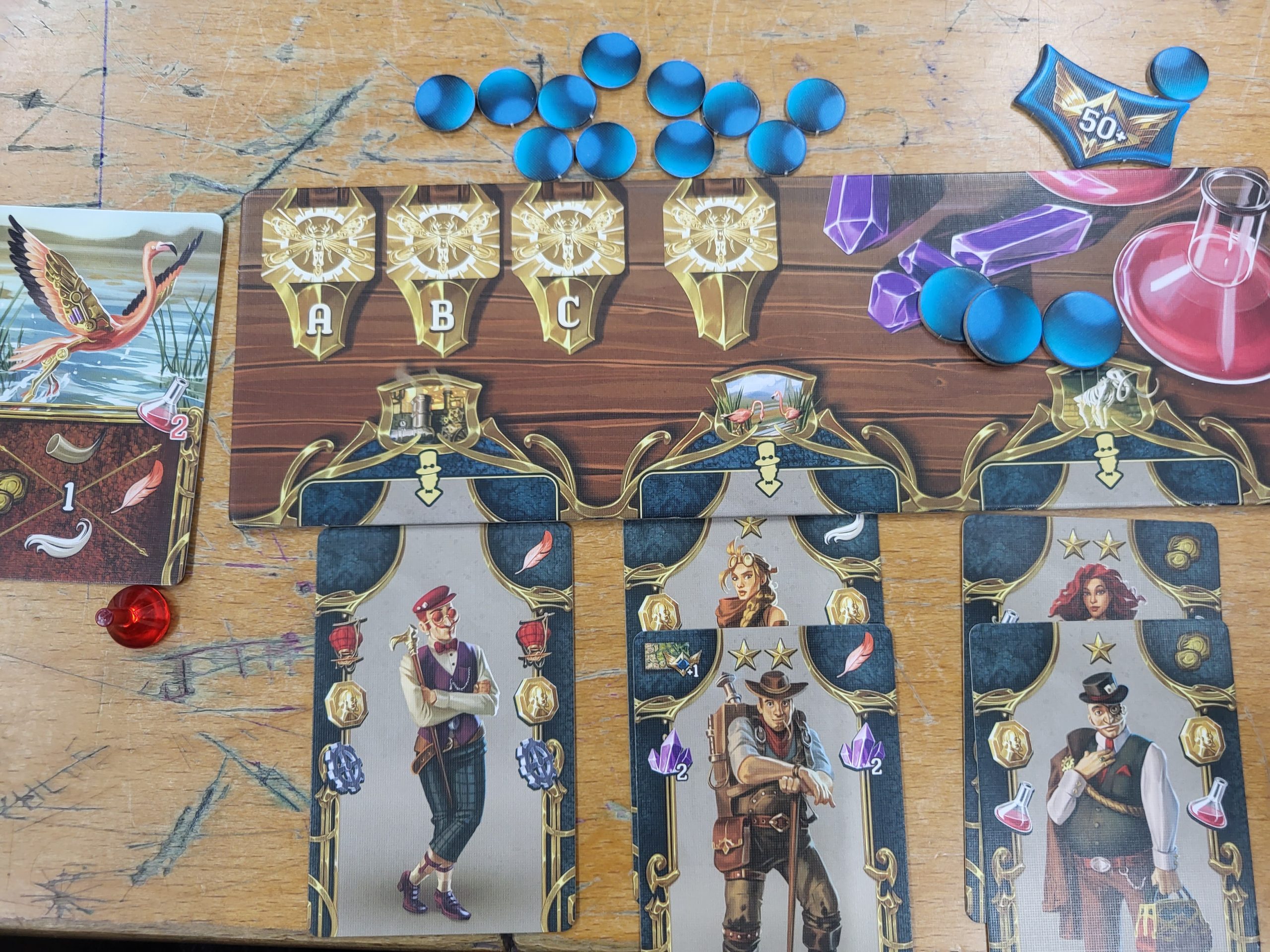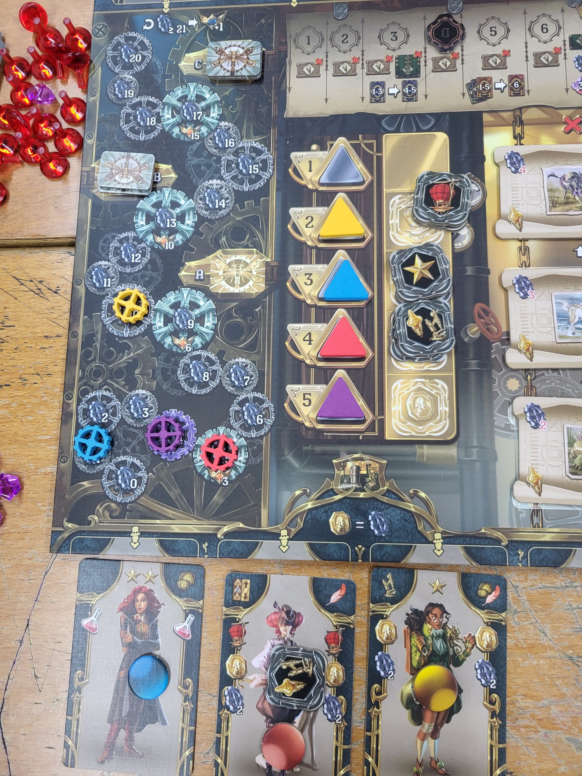 Les cartes utilisées ne sont pas directement de retour dans sa main, ils seront placés en colonne selon le lieu utilisé et on récupérera une colonne par manche. Les personnages ont des ressources sur elles et éventuellement des étoiles d’initiative (signifiant moins de ressources).
