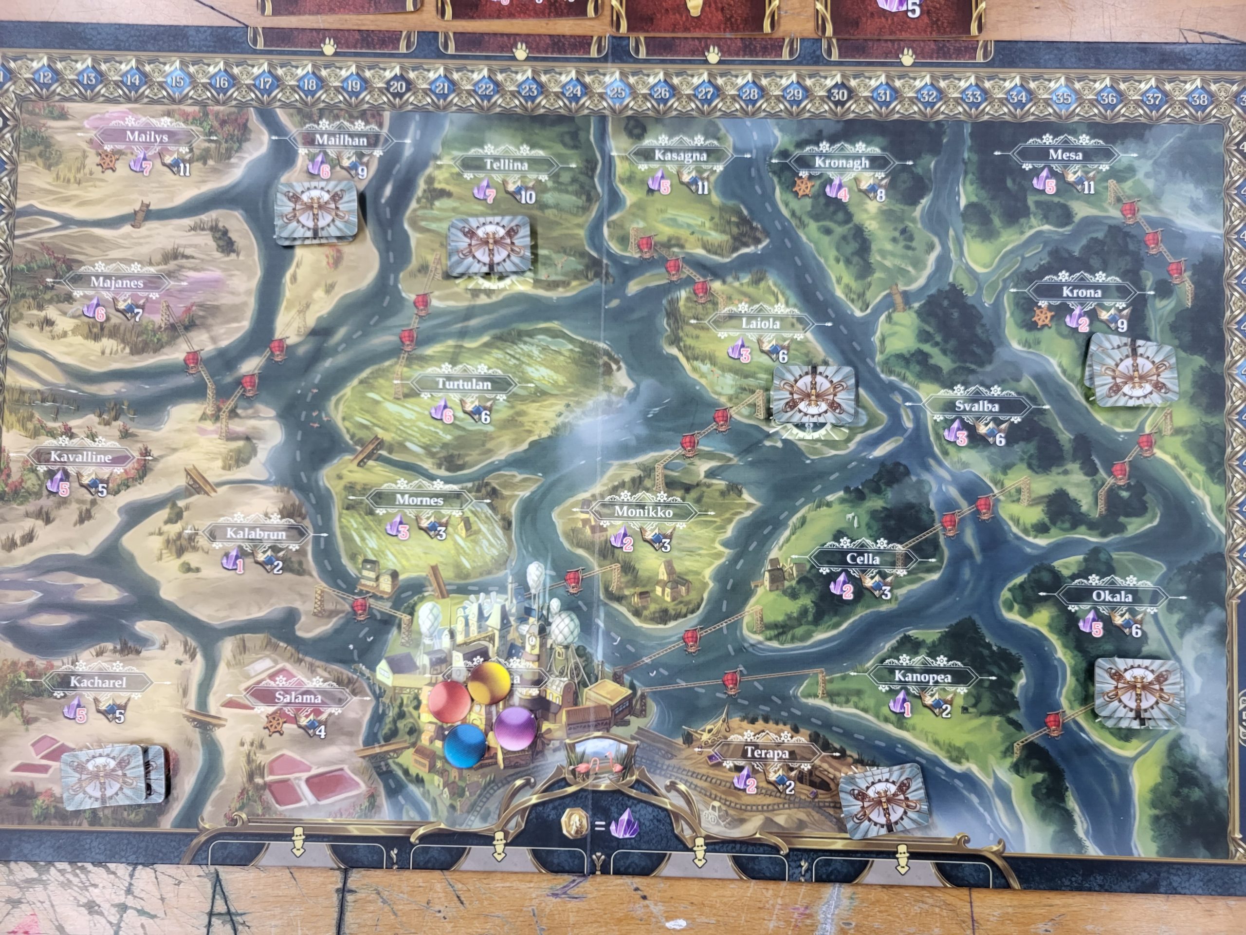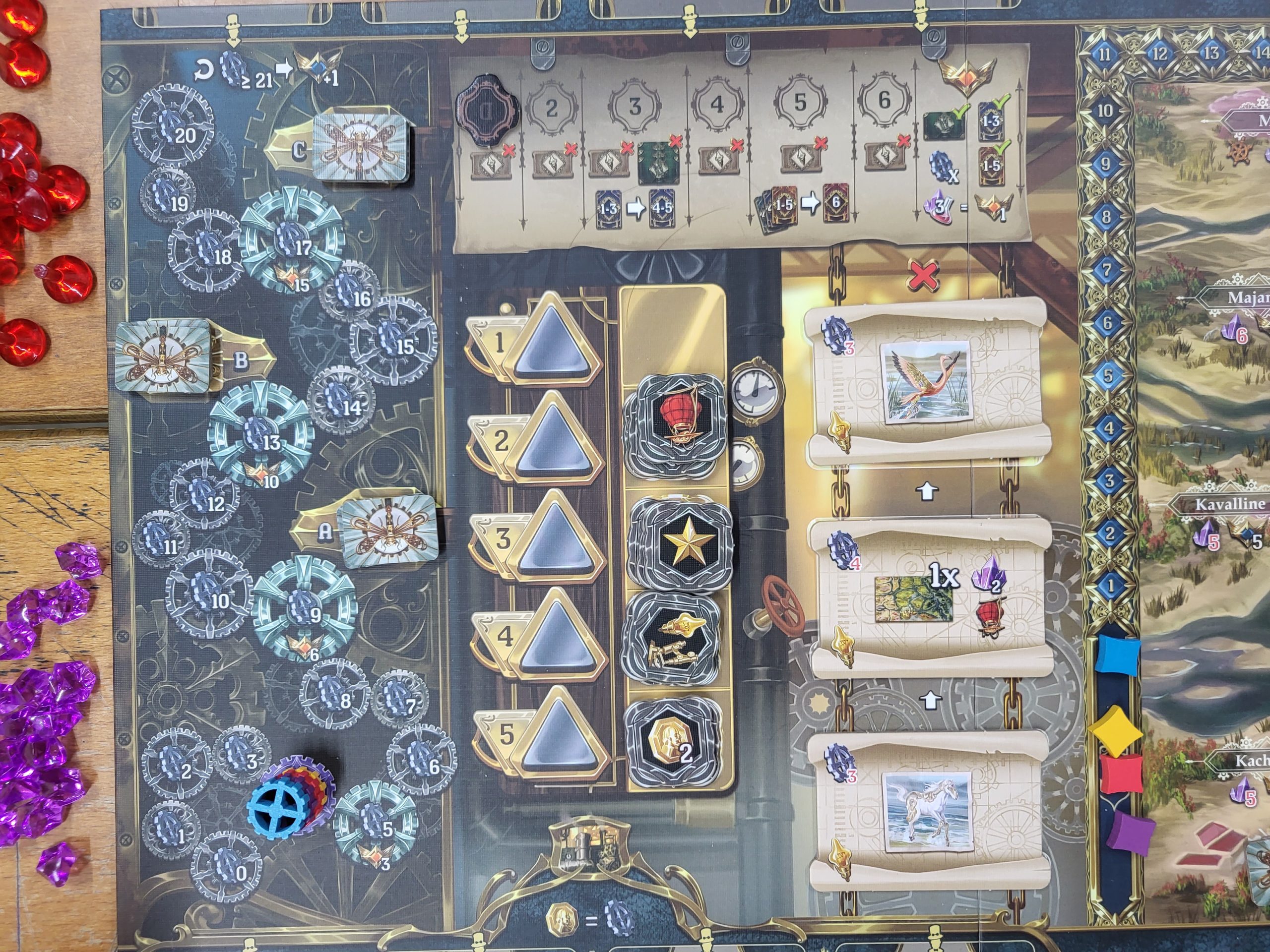Le principe est relativement simple, il y a 3 lieux d’action, 3 types de ressources (dont une joker l’or) et des cartes en main. A chaque manche (6 sur le jeu), on va placer une de nos cartes sur un des 3 lieux. Tout le monde finira la manche avec un personnage sur chaque lieu, mais l’ordre d’arrivée (et les étoiles d’initiative dessus) définiront qui choisira en premier une des cartes de développement placée au-dessus du lieu.