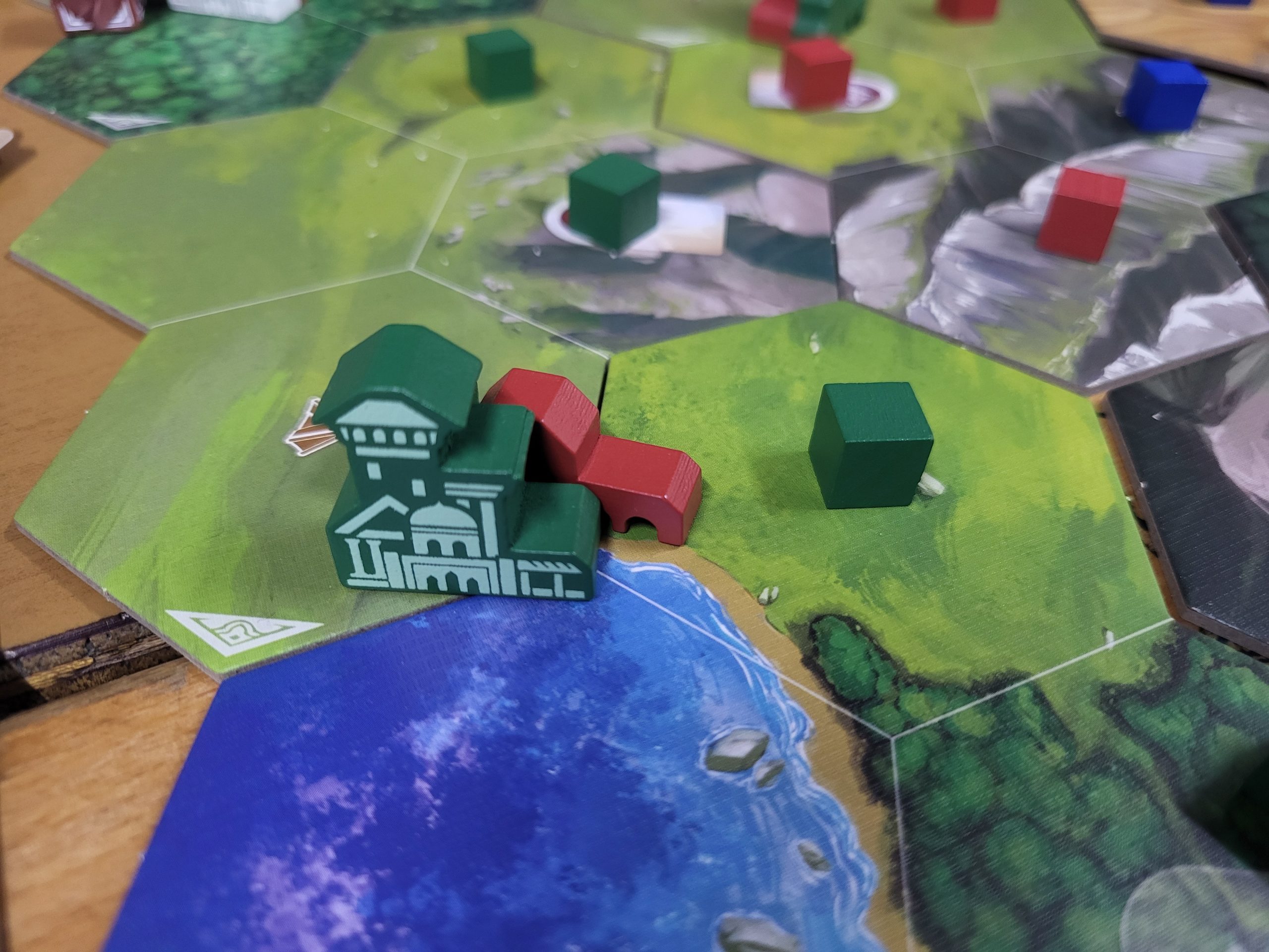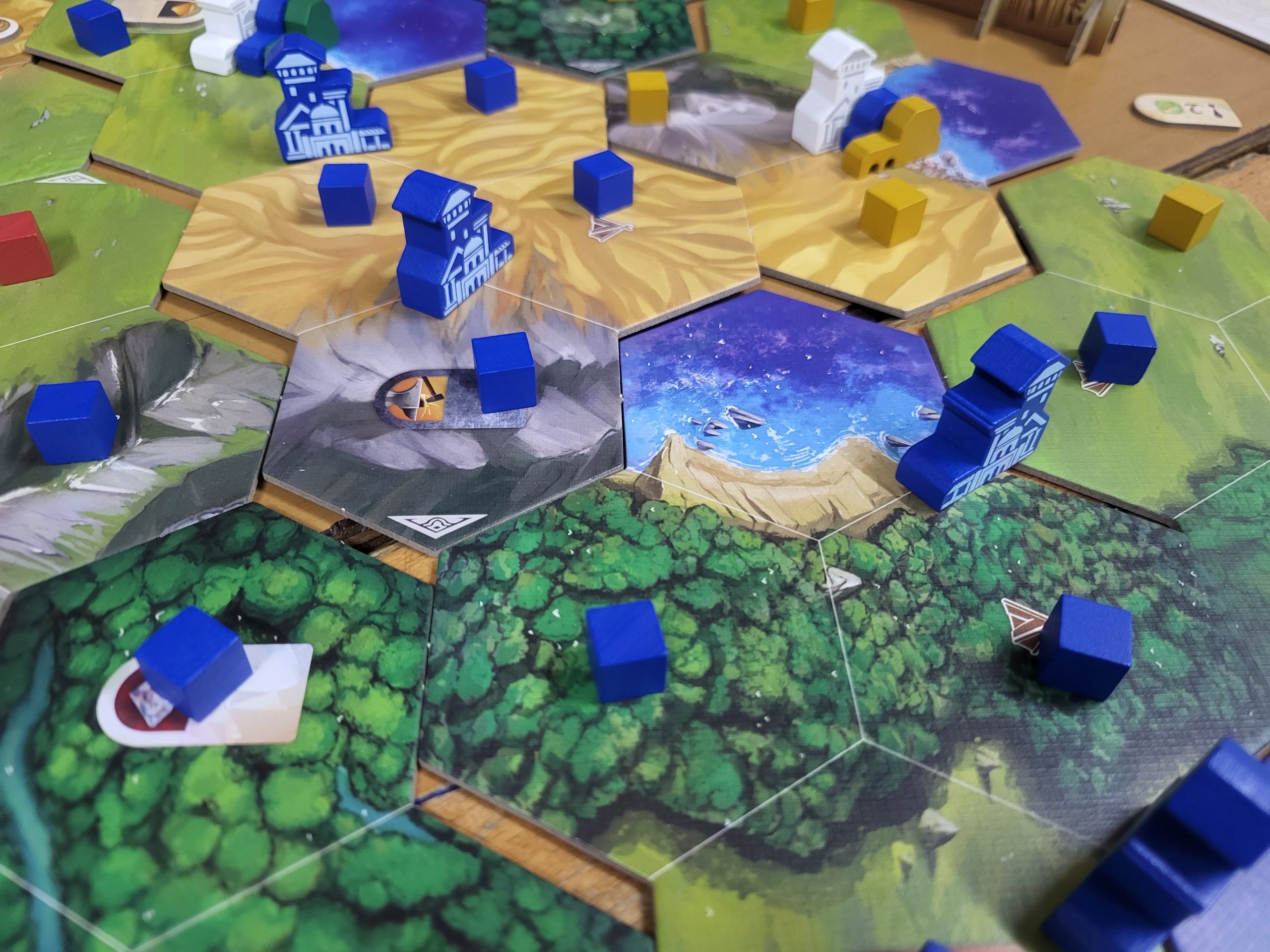 - Construire une ville avec des marteaux : elles se placent sur un coin dont vous contrôlez les 3 tuiles, et à distance d’une autre ville, façon Catane.