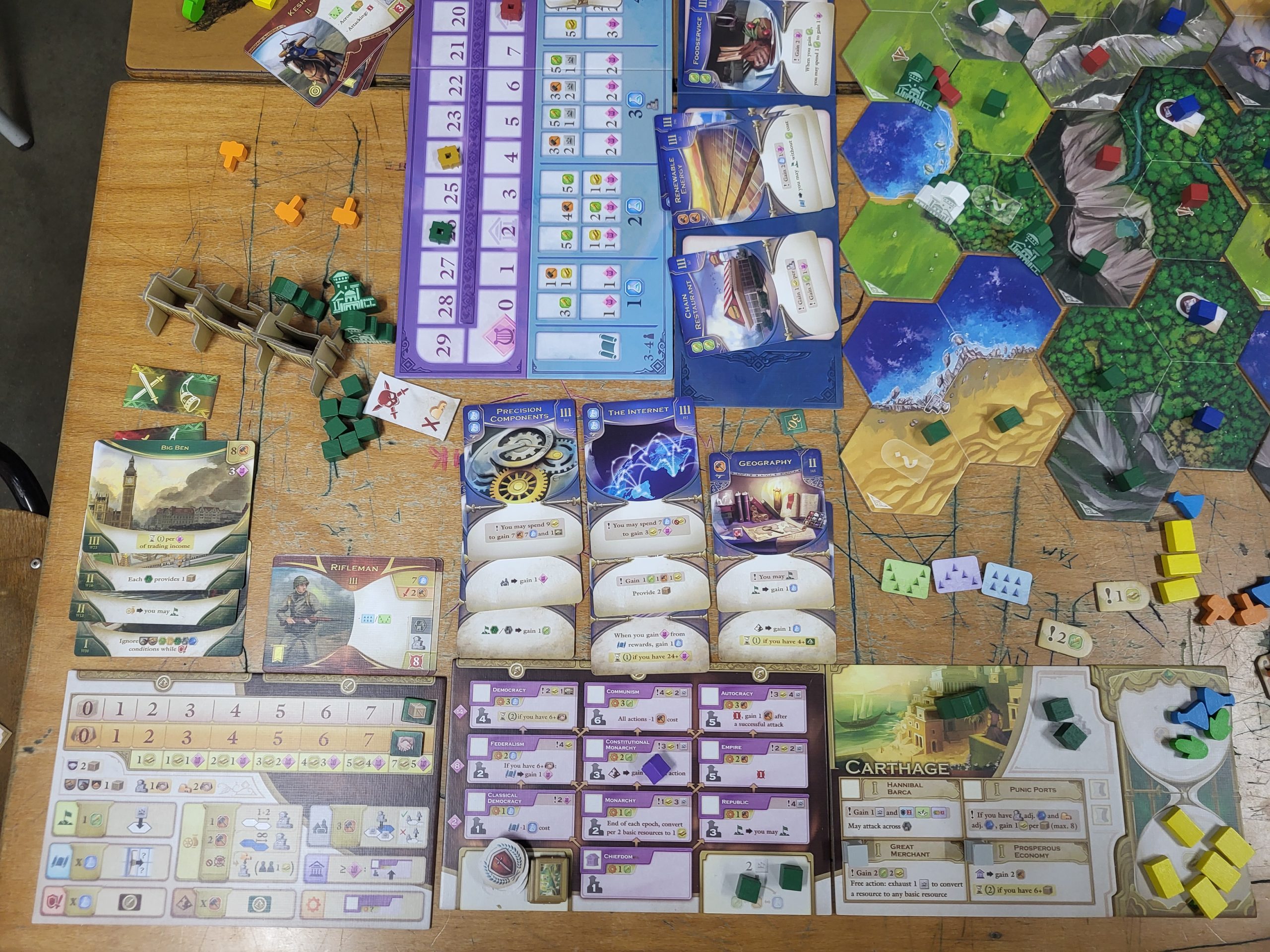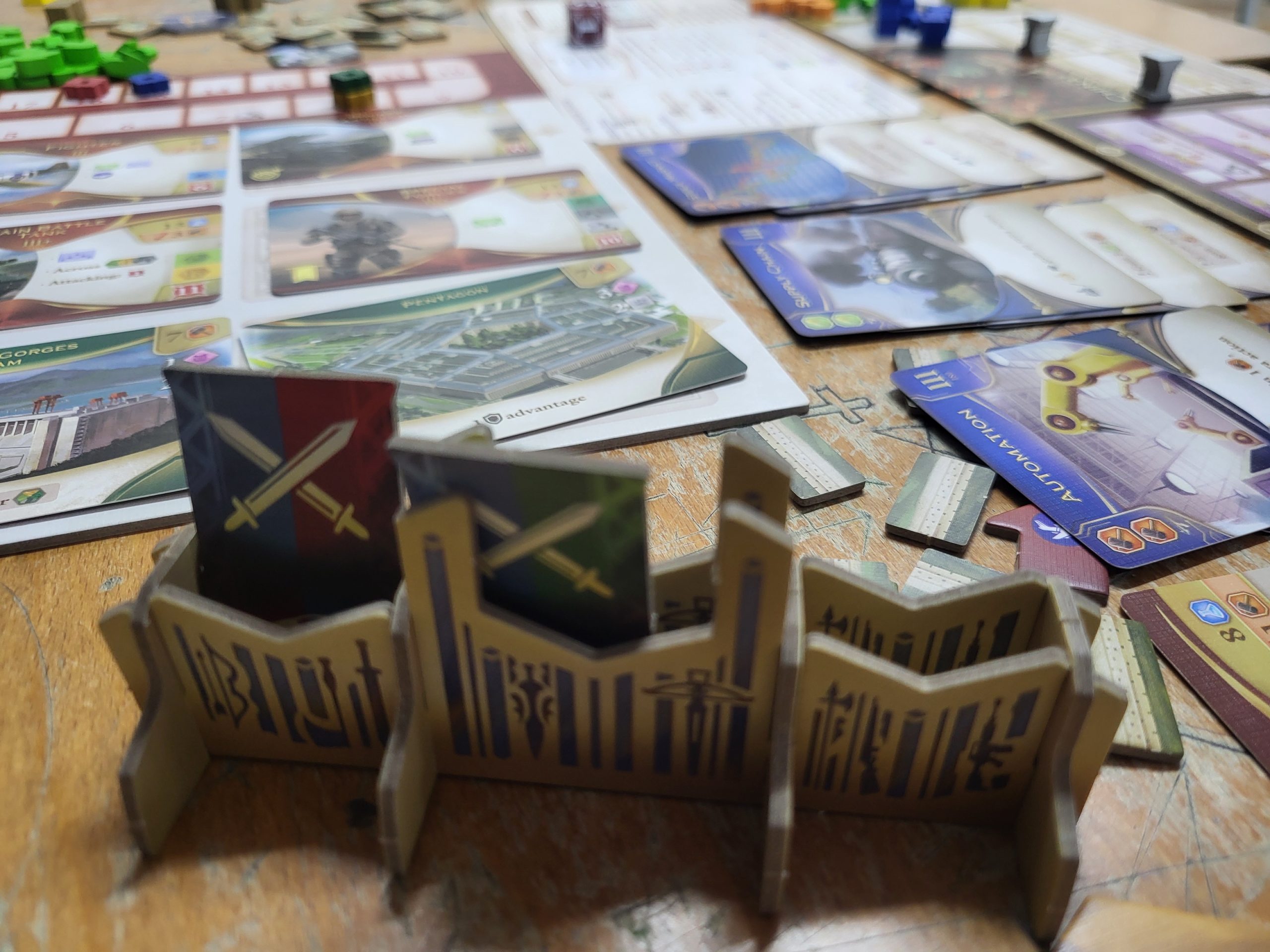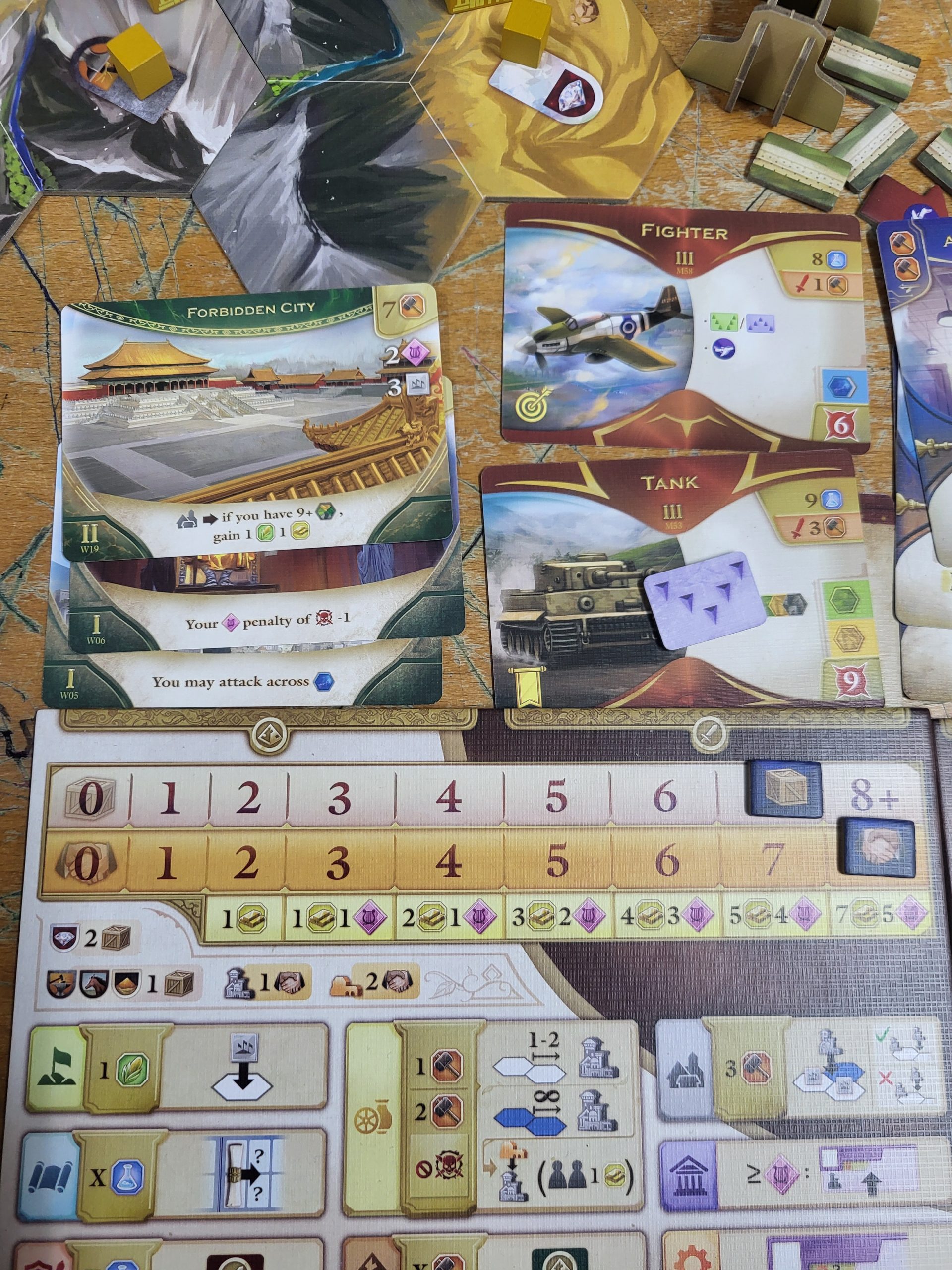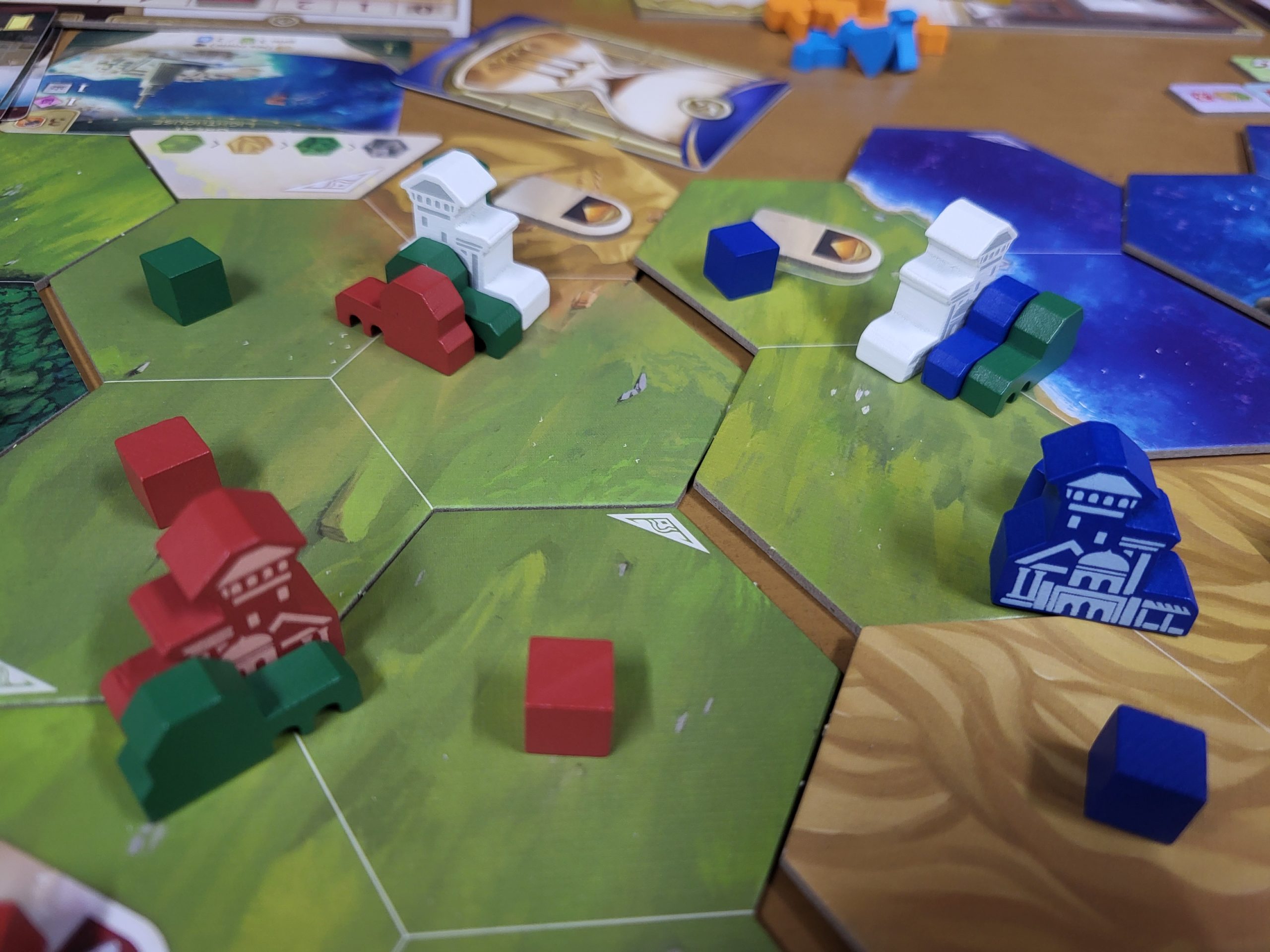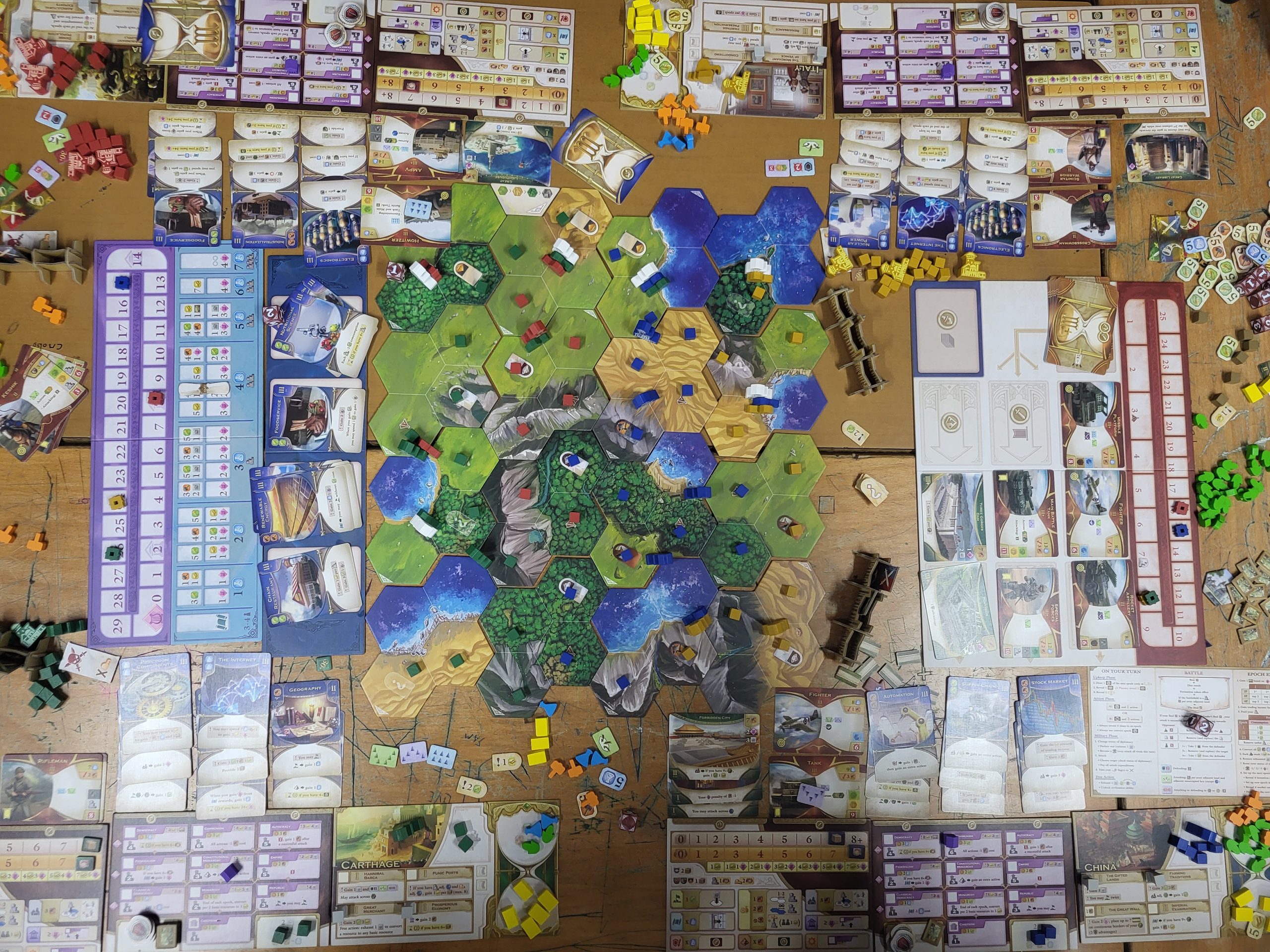 On se positionne sur une zone, là où l’une des ressources nous intéresse, et j’avoue être content d’avoir un joueur réputé non belliqueux installé près de moi. Car ici, avoir l’occasion de jouer sans tout investir en cartes militaires (comme dans Through the Ages ou Nations) permet de garder plus d’actions (et de ressources) pour autre chose. Un seul joueur était vraiment agressif à table ; j’étais assez loin pour que ses assauts soient majoritairement subis par les autres. C’est un facteur « chance » du jeu, somme toute.