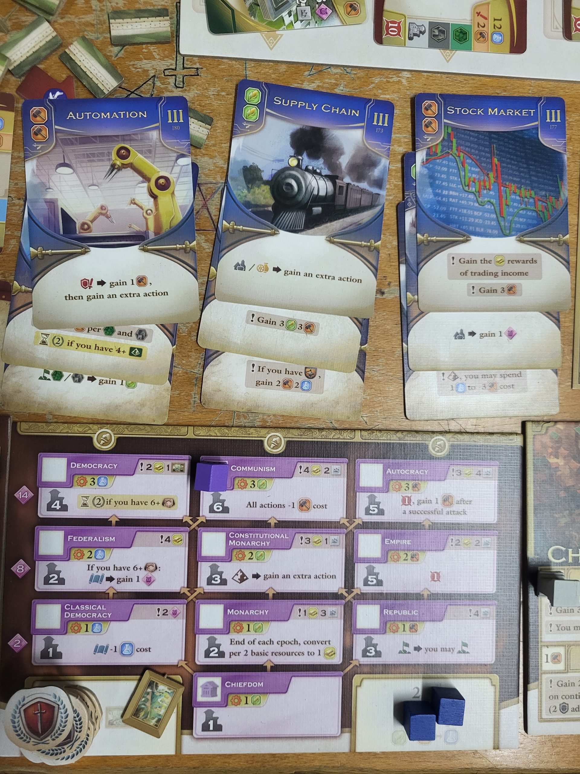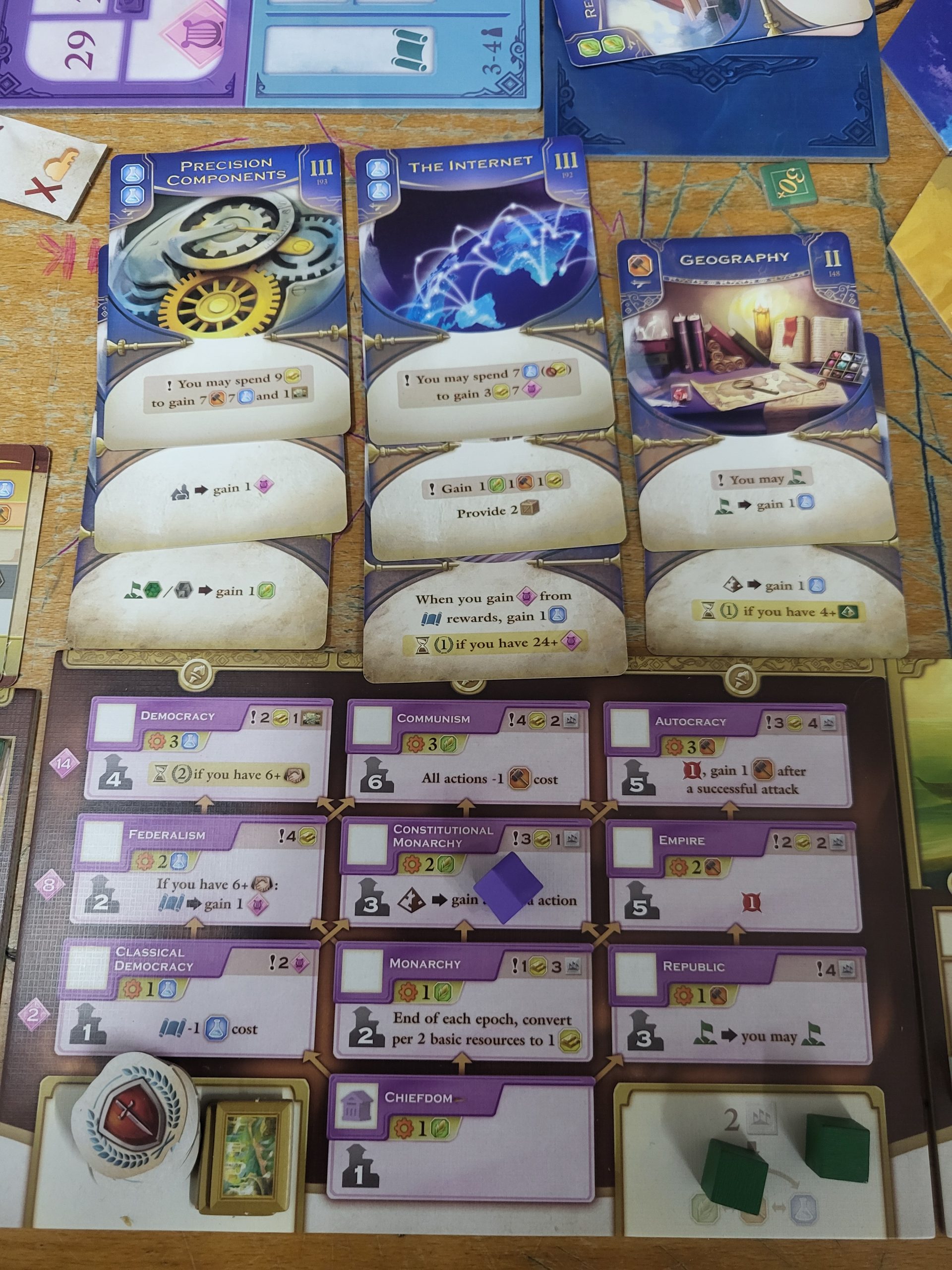 - Changer de politique selon votre avancée en connaissances : cela ouvre des pouvoirs, des cubes pour contrôler plus de tuiles, de la production, des villes disponibles, etc.