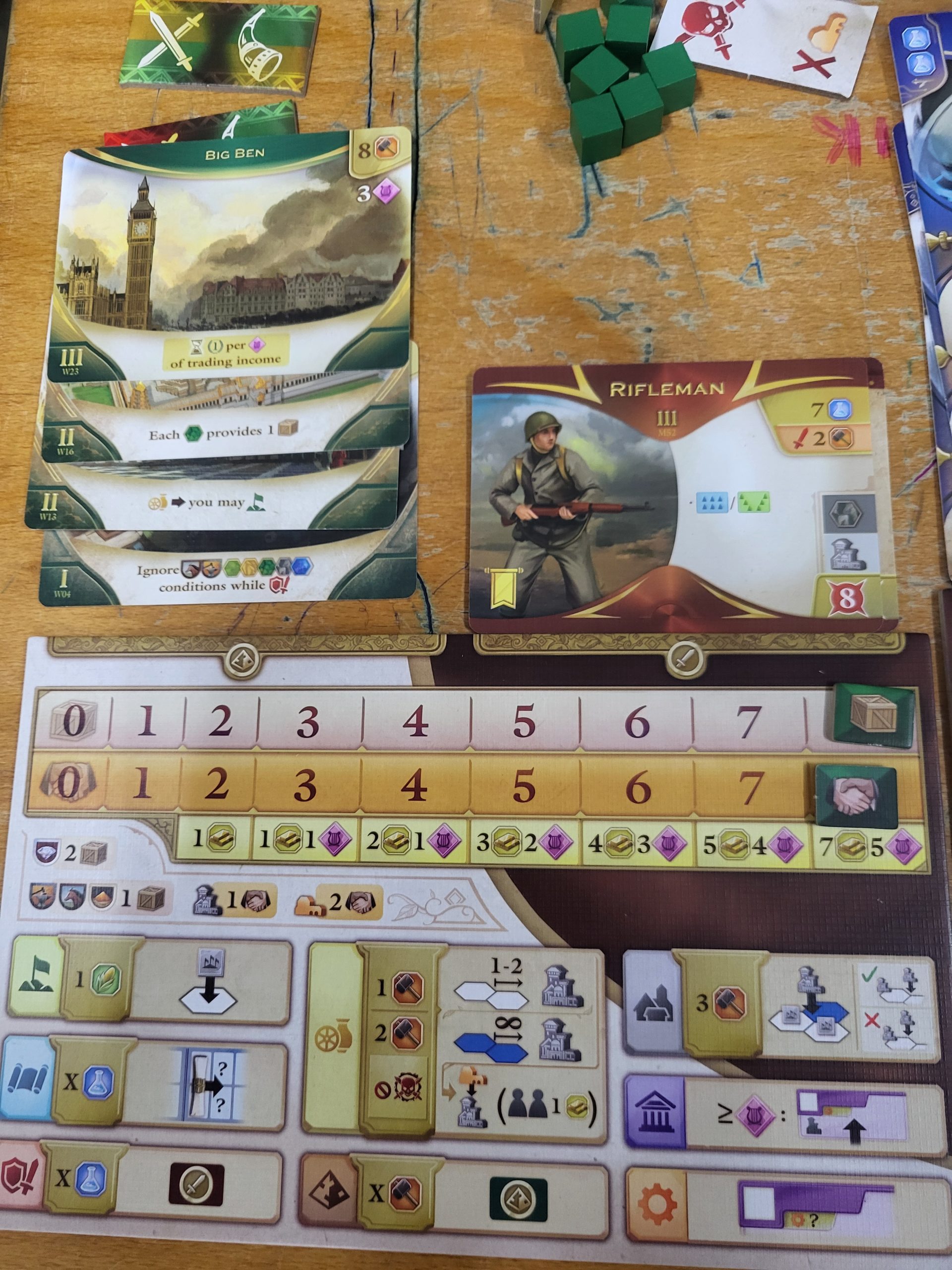En fin de manche, les ressources de base restantes sont transformées en or (joker) en 3 pour 1 : on essaie donc de tout dépenser au maximum. Il faudra aussi nourrir les villes construites (de plus en plus cher au fil des ères) pour ne pas les perdre — ainsi que des connaissances. Bien sûr, à chaque manche, après avoir joué ses 6 cartes, on va acheter des cartes de plus en plus chères… mais aussi de plus en plus puissantes.