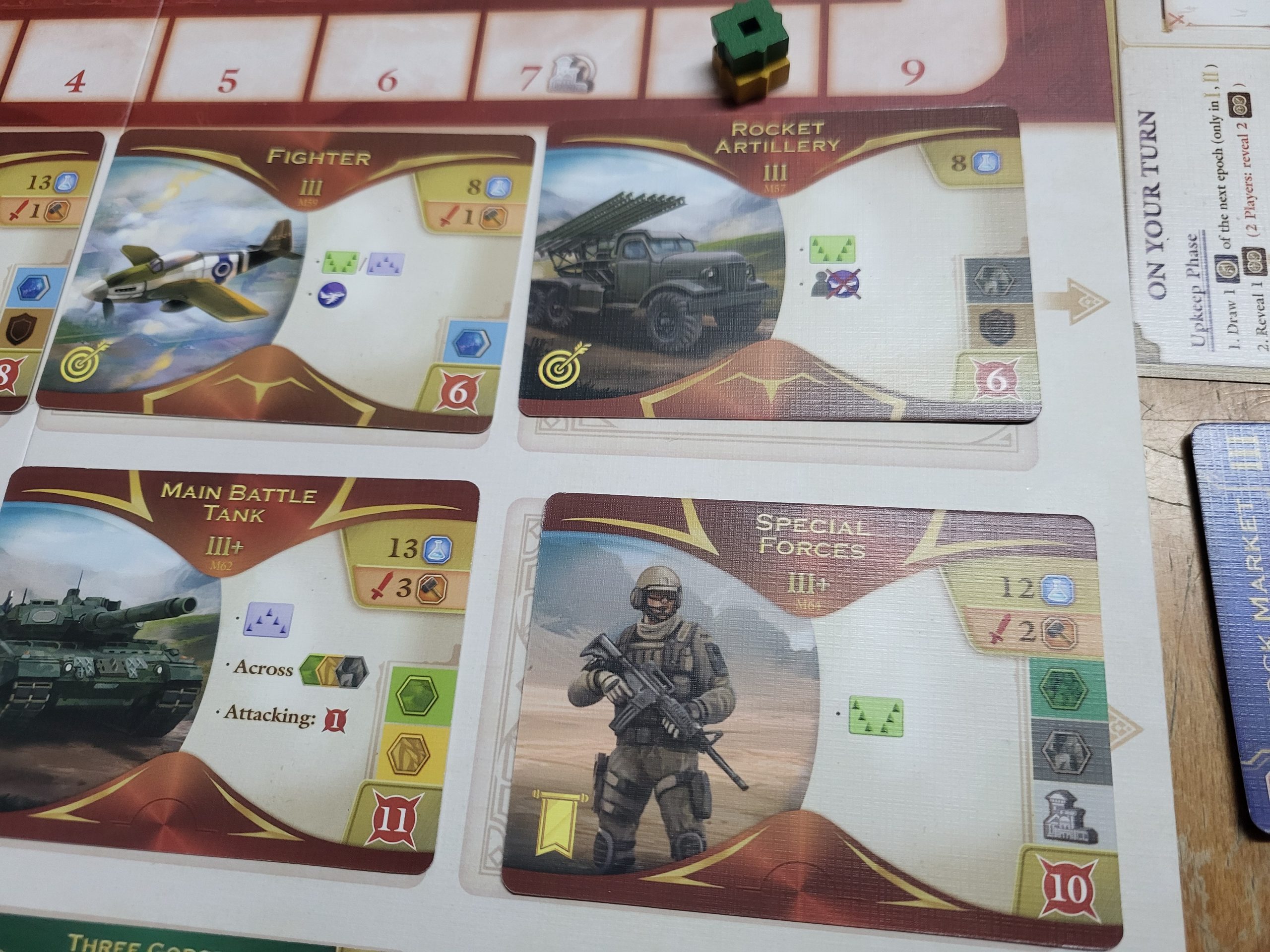 Après chaque coup, on peut déclarer la guerre à un joueur, ce qui permettra de s’attaquer réciproquement au tour suivant — histoire de laisser au joueur menacé l’occasion de dépenser pour améliorer ses troupes. Quand la guerre est posée, un joueur peut attaquer une position ennemie. En plus de la force de base, selon les troupes, on dispose d’avantages sur certains terrains, et un jet de dé peut avoir lieu (part d’aléatoire) pour départager. Certaines troupes nécessitent de dépenser des ressources, et il est parfois onéreux d’attaquer plusieurs fois… mais on sait ce que l’on veut. Si l’attaquant l’emporte, il prend la position du vaincu.