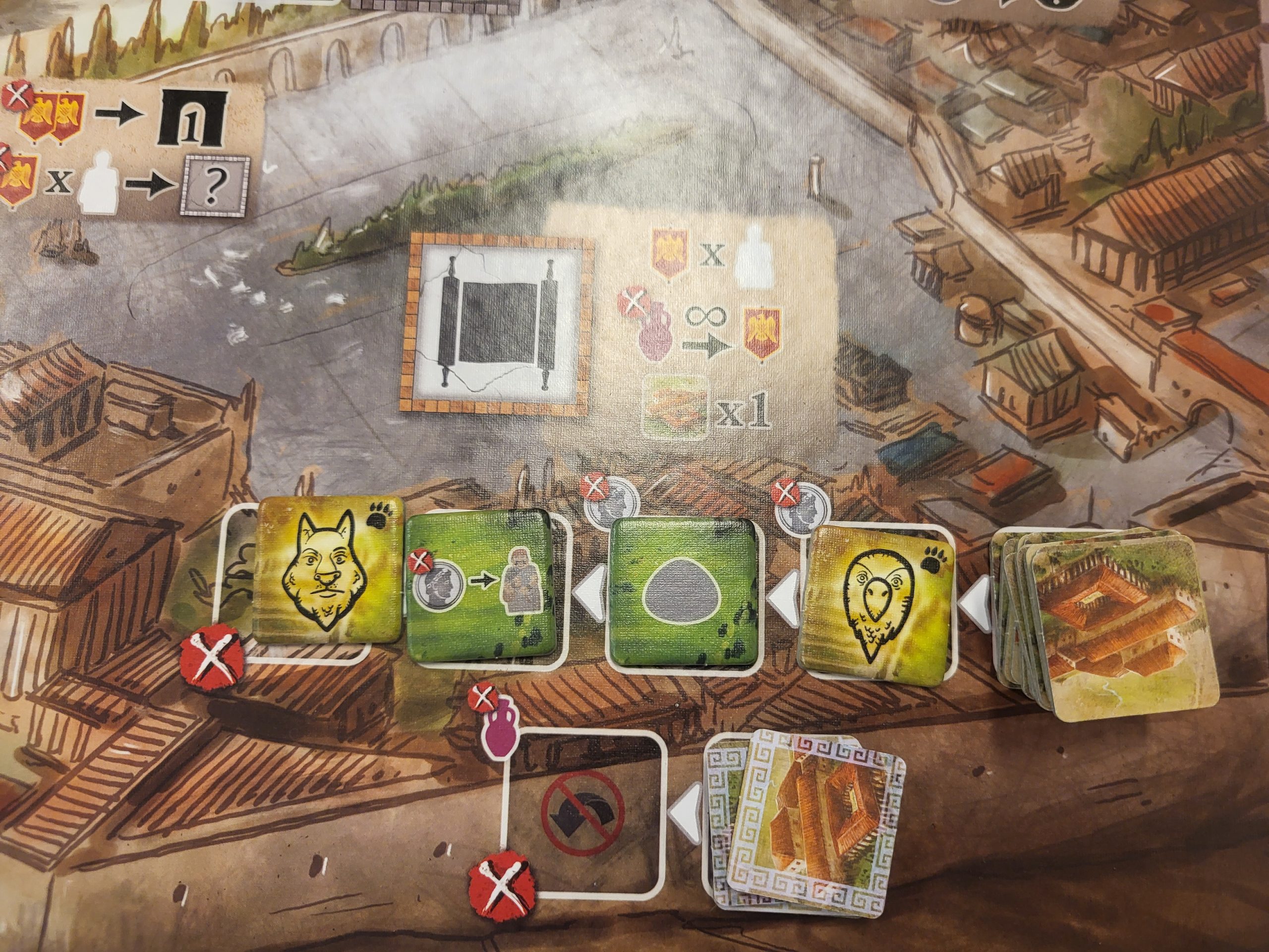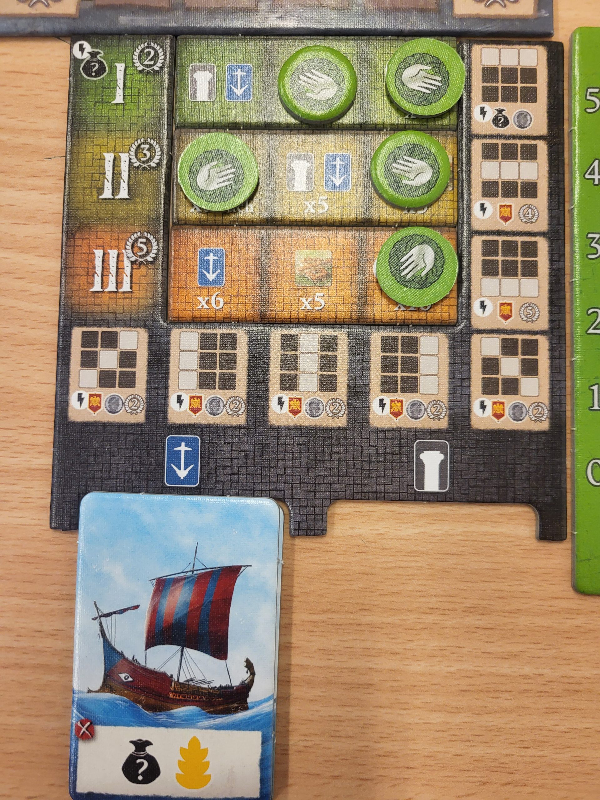 C’est très intéressant, et on retrouve la patte de Stan Kordonskyi, mais plus proche de Minos que de Rurik. Non pas tellement par le principe du jeu, mais par le downtime lié à la réflexion nécessaire pour choisir la meilleure combo à son tour, suite aux blocages posés par les autres joueurs. On l’a joué à 3, et je suis presque sûr que c’est le nombre idéal, pour limiter la frustration des places disponibles pour les ouvriers. Comme il y a 15 places possibles pour les ouvriers, n’en placer que 9 par manche est bien plus ouvert qu’en placer 12. L’autre comparaison avec Minos est liée au sentiment d’entrer dans le jeu. Dans l’un comme dans l’autre, je reconnais la mécanique et son intérêt, mais je n’arrive pas à rentrer dedans pour m’y amuser réellement.
