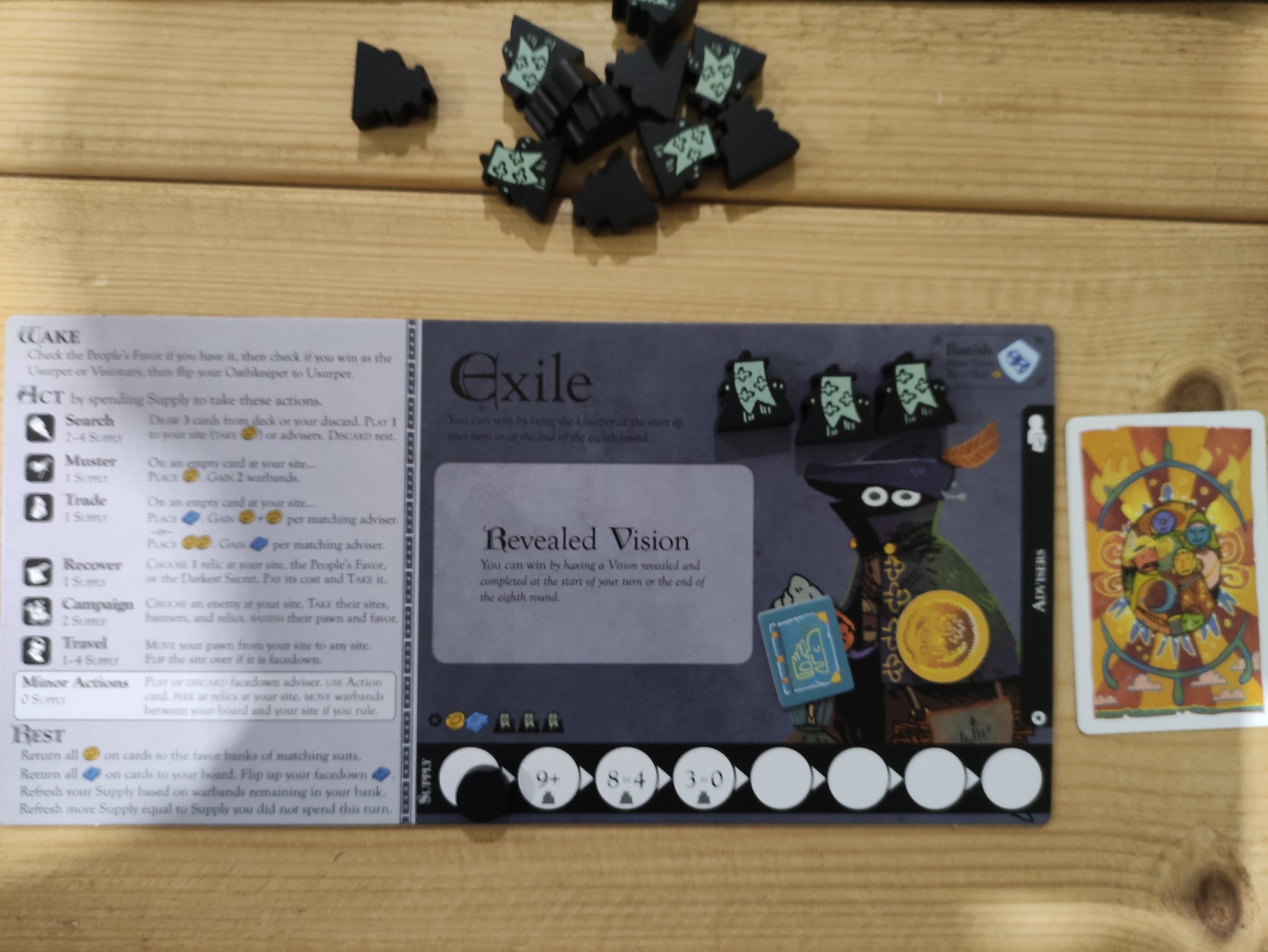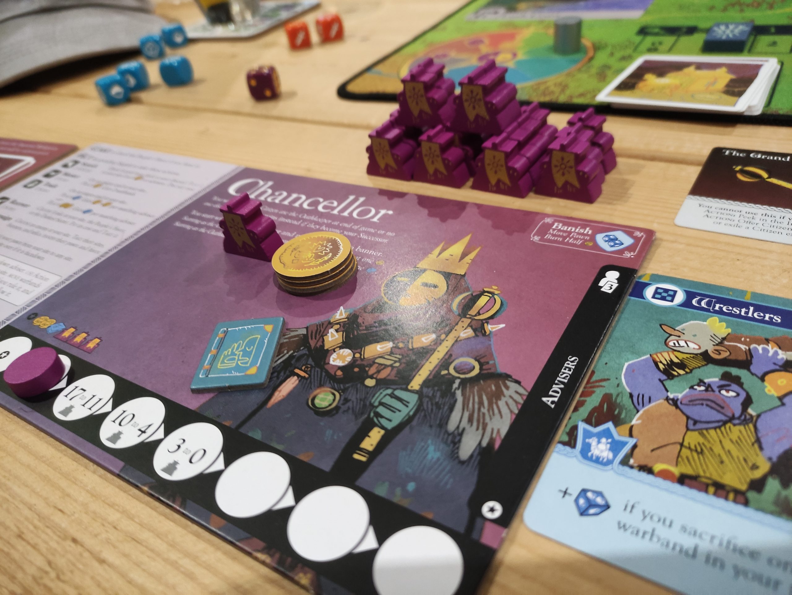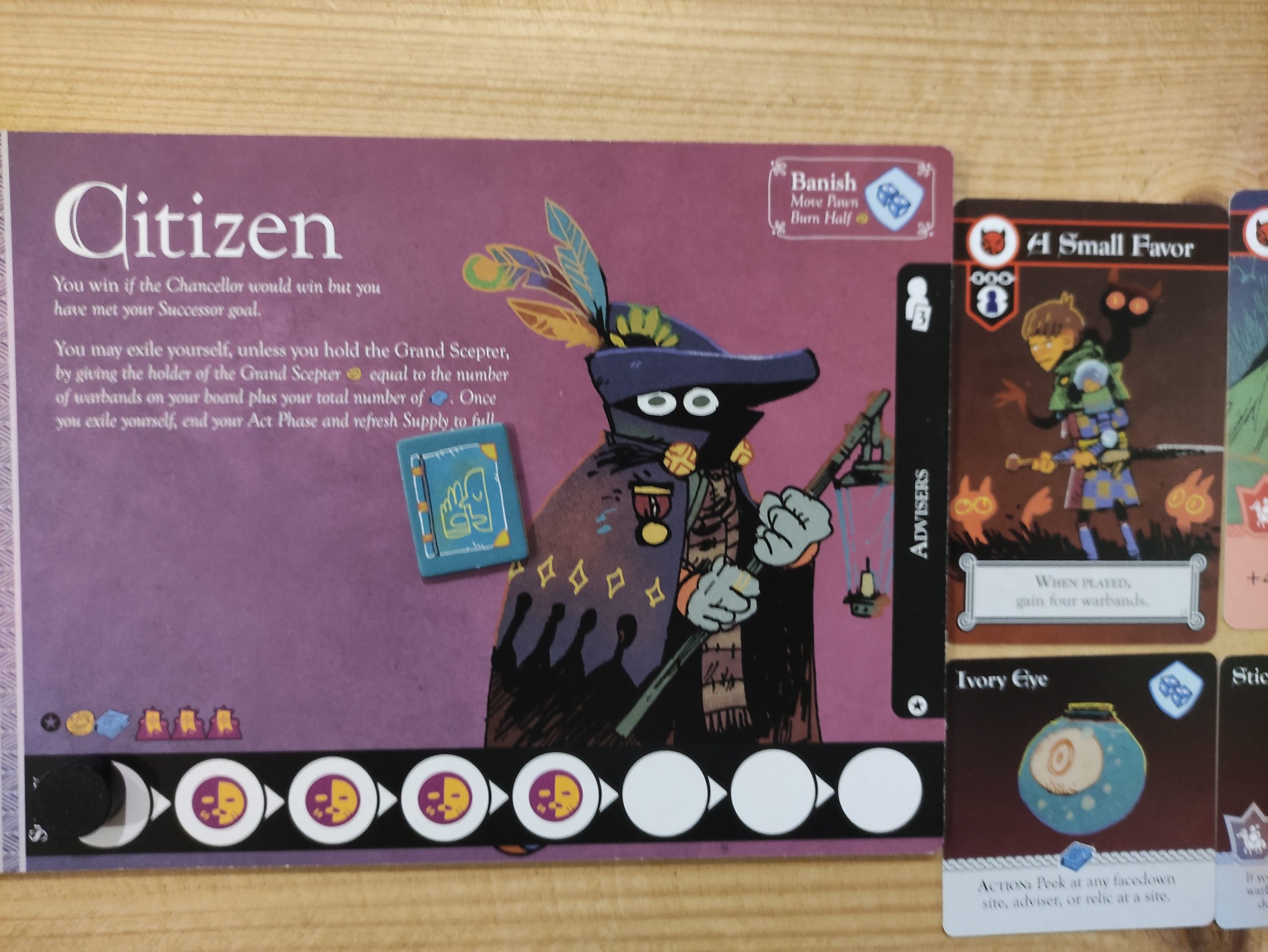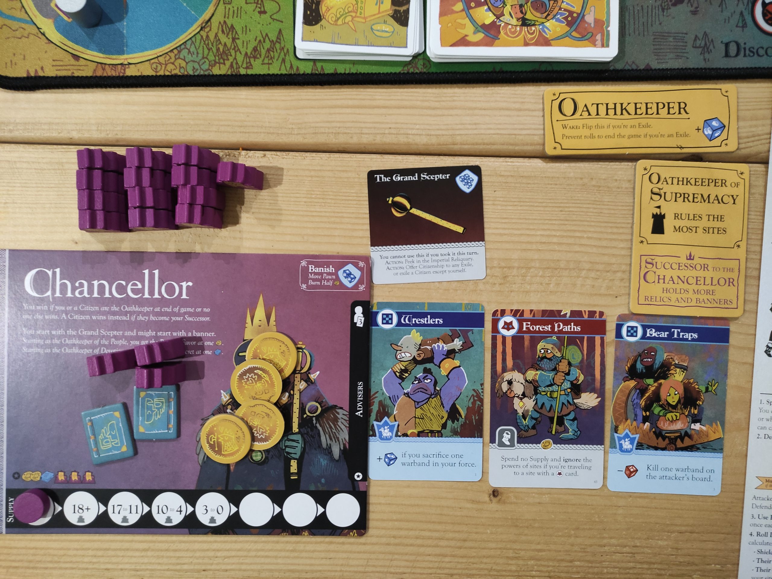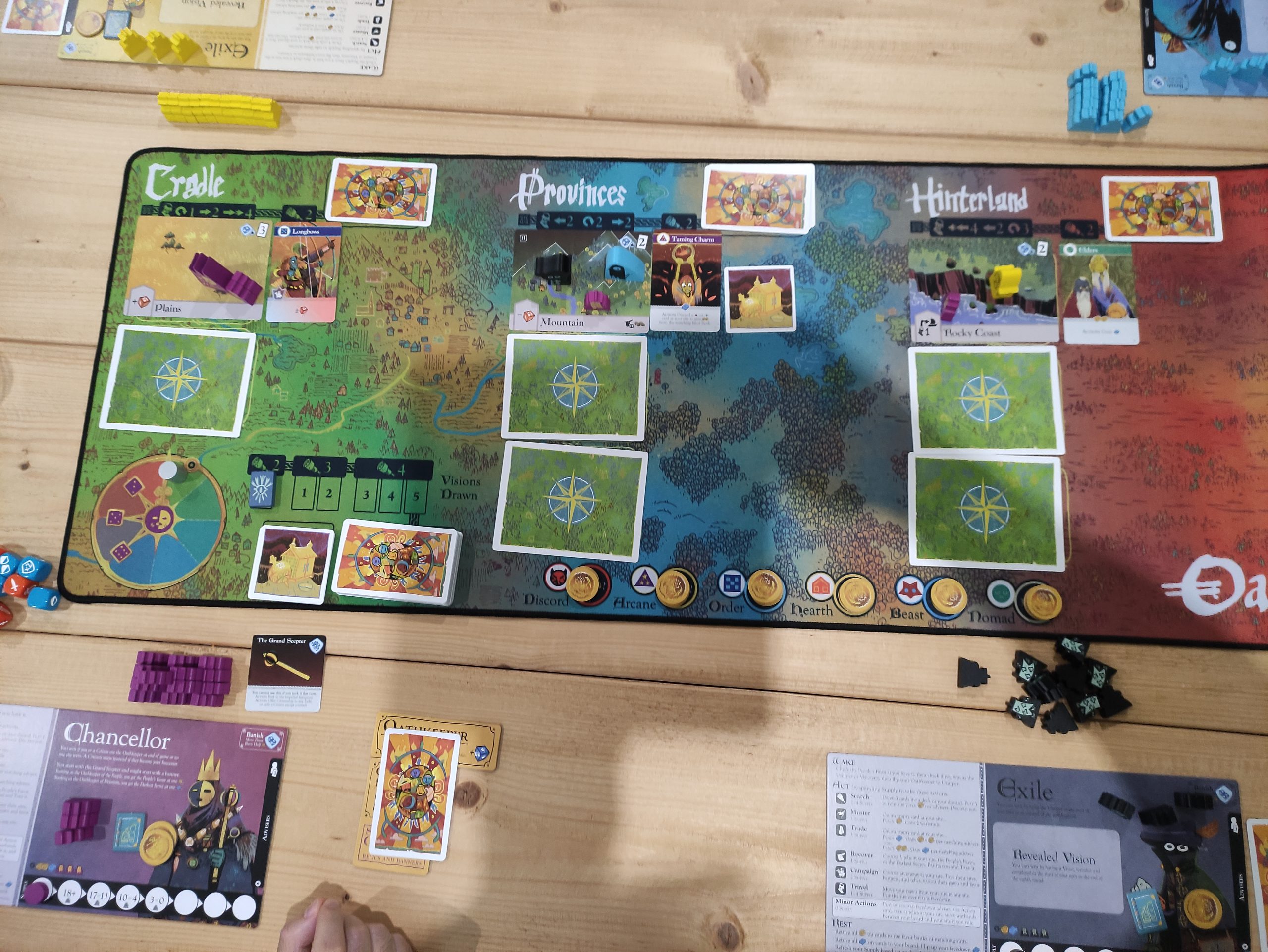 Si dans la première partie la pression sur le plateau est nette (la condition de victoire pour le chancelier), cela peut varier d’une partie à l’autre selon l’objectif de victoire de la prochaine (la possession d’une bannière spécifique ou le plus d’artefacts/bannières). Ce qui est certain c’est qu’à votre prochaine partie la condition de fin de jeu du chancelier ne sera pas la même, car Oath intègre la notion de Chronique, qui implique que la fin d’une partie régit la mise en place de la suivante. Tant dans les cartes en jeu que dans les conditions de fin ou le clan des joueurs (citoyen / exilé), qu’importe si vous jouiez avec les mêmes ou d’autres joueurs. En fait ce n’est qu’une mise ne place aléatoire pour les joueurs n’ayant pas participé à la partie précédente, tandis que cela veut rappeler ce que les joueurs déjà présents avaient vécu pour en arriver là. Les parties ont donc un lien ténu entre elles, non indispensable mais agréable.