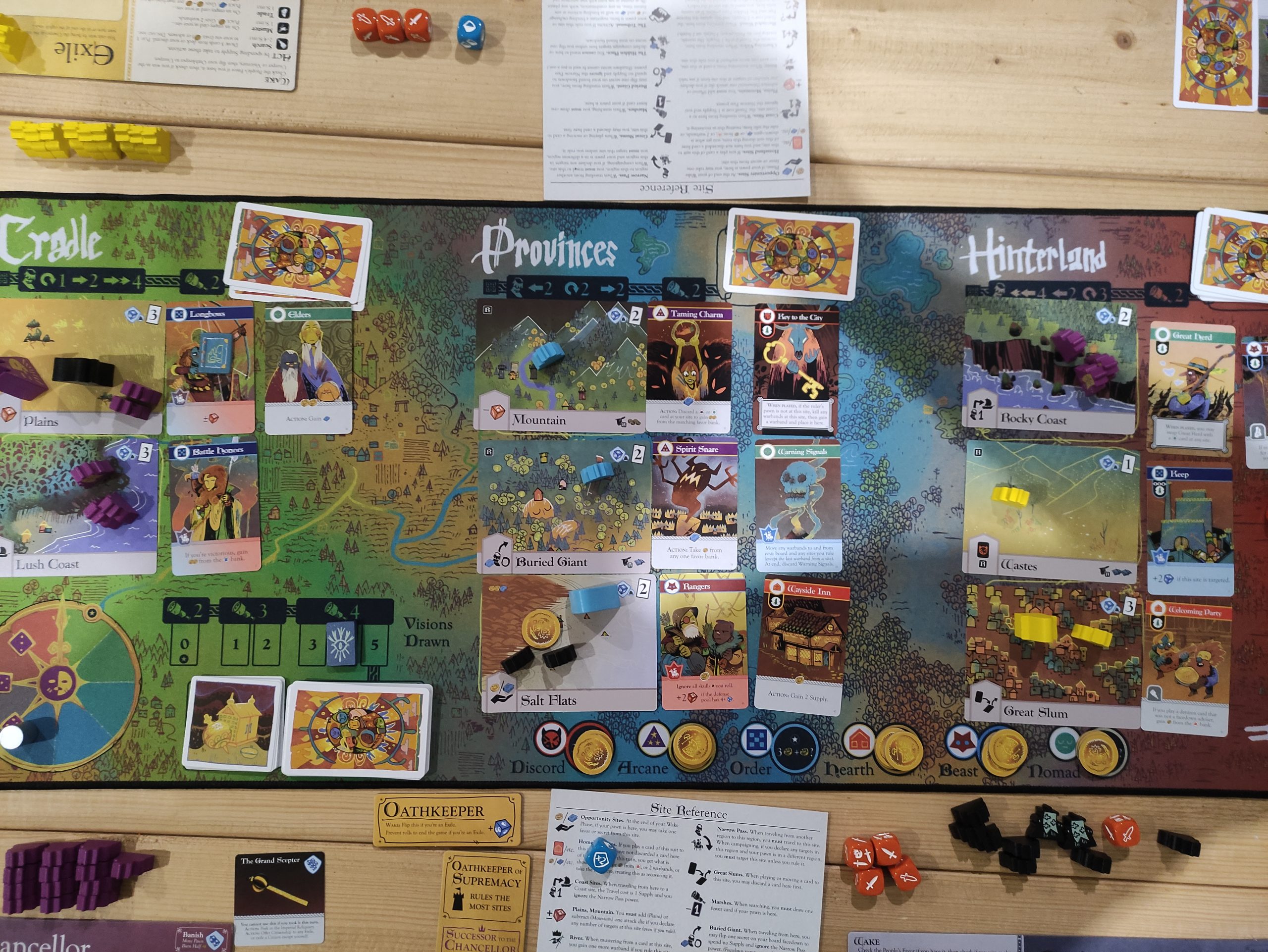 Je dois avouer que je suis parti sur Oath avec de grandes appréhensions. Si Cole Wehrle est un génie, ses oeuvres sont rarement faciles à appréhender, justement parce qu’il est un génie et qu’il bouscule nos habitudes et repères. J’ai détesté Root dès les premières minutes (même dès les explications sans fin, joueur par joueur), tandis que j’ai dû accepter le Kingmaking dans Pax Pamir 2 pour enfin l’apprécier à sa juste valeur. Autant dire qu’avec ce passif, voir Oath sur ma table avec un visuel proche de Root et une opposition annoncée menant au Kingmaking j’avais déjà des sueurs froides.
