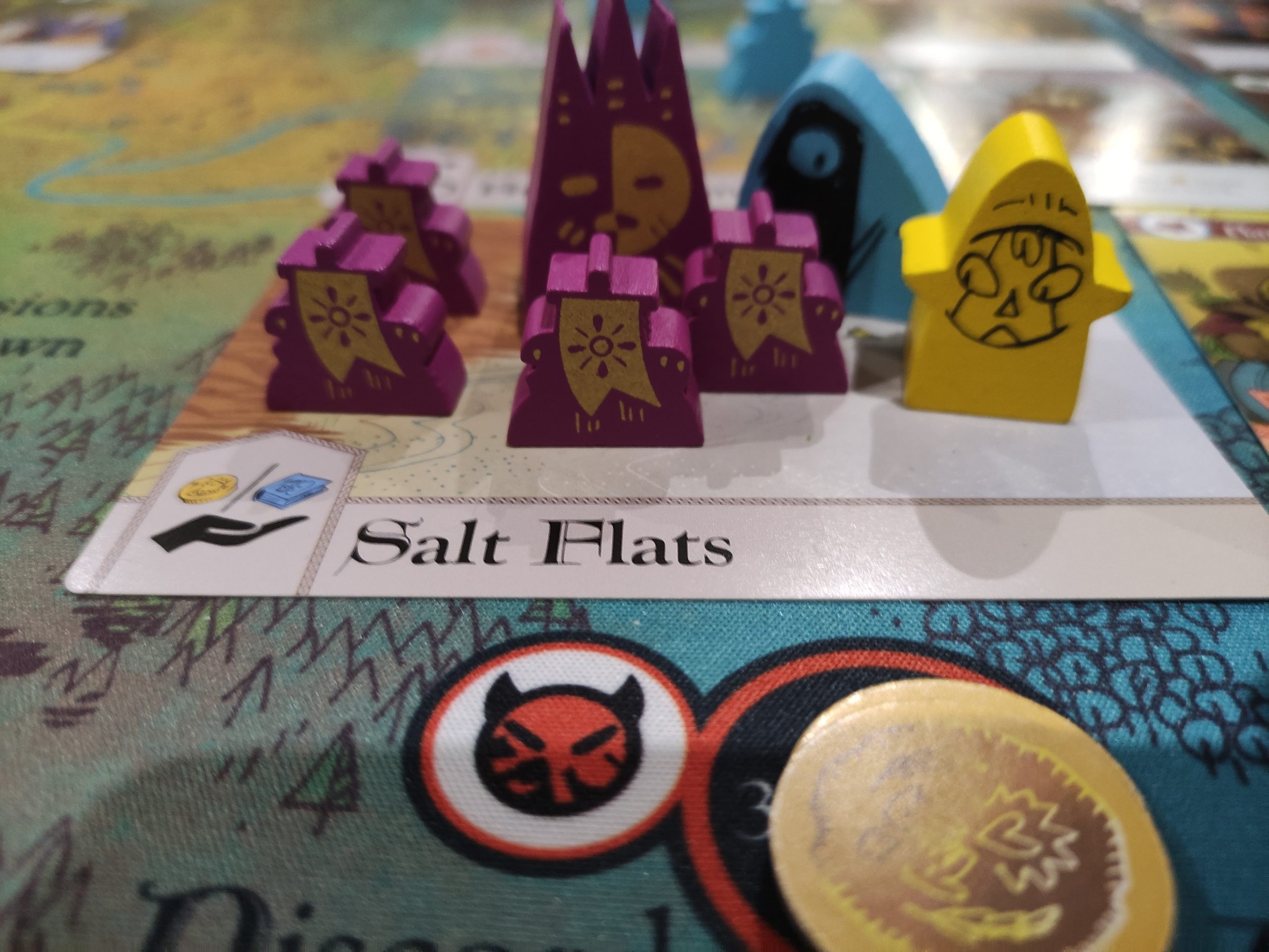 Pour le reste, on va se déplacer, rassembler des armées, découvrir des habitants qui seront des conseillers ou des personnes influentes du site, récupérer des artefacts, commercer pour des ressources, utiliser les pouvoirs des habitants et enfin combattre. On se bat pour prendre le pouvoir d’un site, pour voler un artefact ou chasser le joueur. On peut se battre avec un meeple ennemi (armée ou marqueur du joueur) présent sur son site ou les bandits quand personne n’est présent. Les combats sont globalement à l’avantage de l’attaquant s’il vient avec assez de troupes à sacrifier. Le vaincu perdant systématiquement la moitié des troupes engagées (en plus de la cible), il est plus intéressant à l’attaquant de sacrifier des troupes qui sans cela seront de toute façon perdues en cas de défaite.