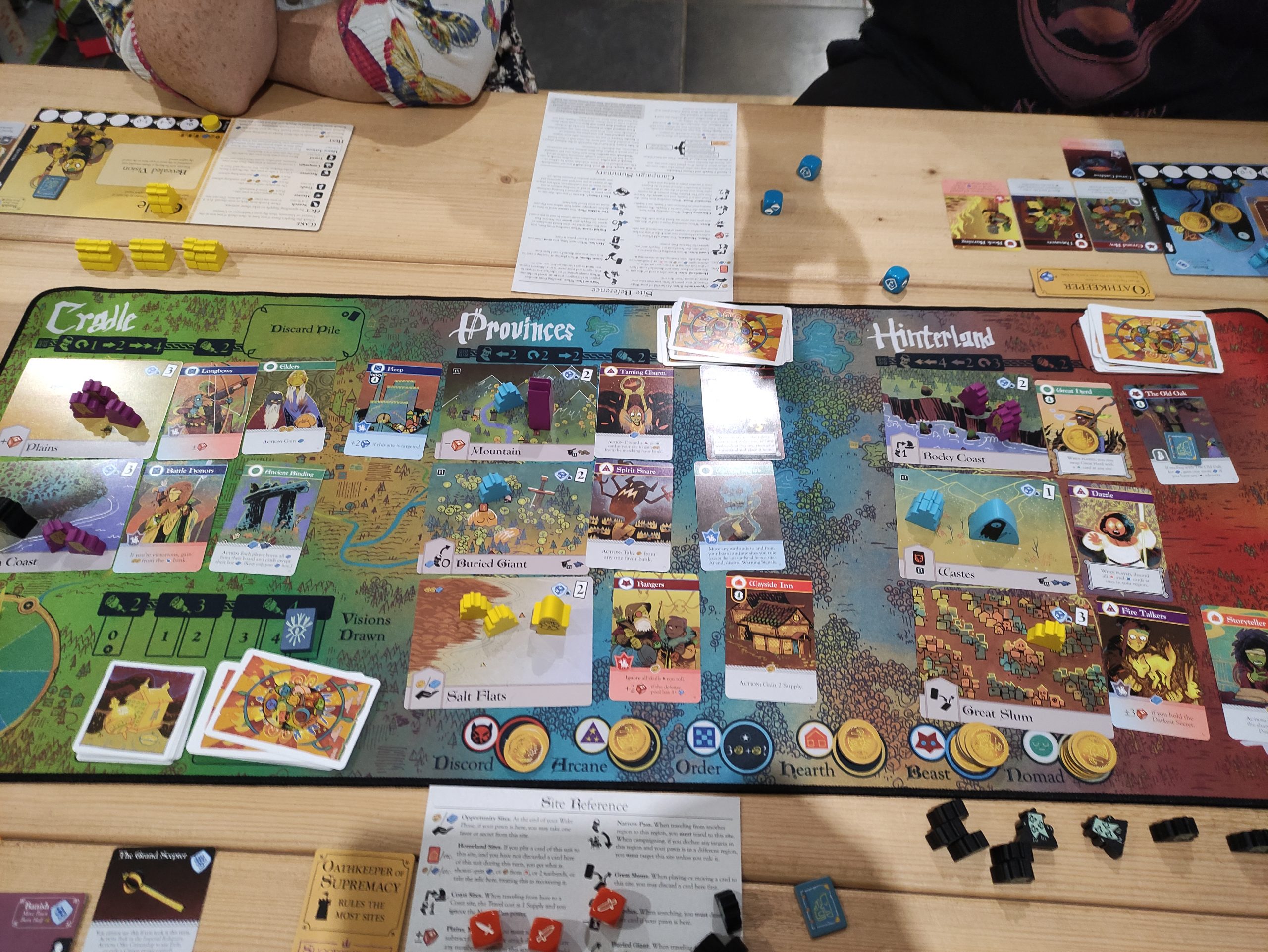 Par contre, l’implication de cela est que lorsque le jeu est terminé, la phase de rangement est plus longue, car il y a une série d’actions à réaliser (une feuille A4 de choses à faire) pour que la partie suivante soit la suite de celle terminée. Les sites seront ceux du vainqueur, les cartes des habitants seront plus souvent du genre majoritaire du vainqueur, des bâtiments sont construits en son honneur ou tombent en ruine car ils étaient liés au précédent maître de Oath. Bref, c’est sympa et malin, mais quand on termine à minuit et que le rangement (surtout la première fois) dure 30 minutes, c’est un peu moins fun.