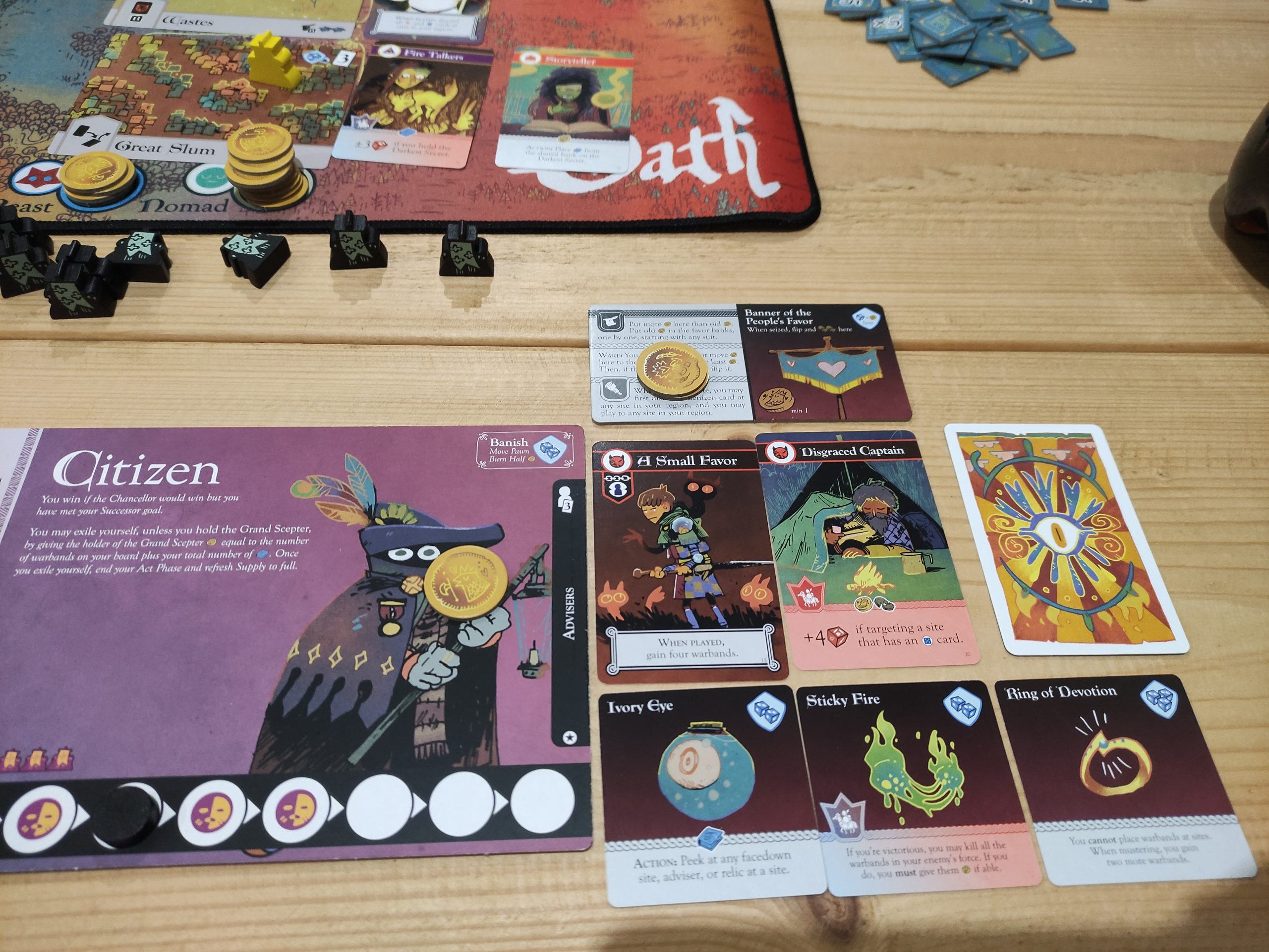 Dans les grandes lignes, il y a un empire avec un Chancelier, qui en début de jeu contrôle 3 sites connus, et des joueurs Rebelles (les Exilés) qui veulent contrer son hégémonie et prendre le pouvoir sur Oath. Chacun a un objectif déclencheur de fin de jeu (et de victoire) différent et il est possible de faire d’un exilé un citoyen (qui intègre l’empire avec ses troupes) et vice-versa. Cette gestion du jeu avec ses conditions de fin flottantes, nécessitant des actions combinées des joueurs pour empêcher l’un ou l’autre de gagner au début de son tour, avec des retournements d’alliance et de forcer la main pour devenir citoyen (et sauver l’empire) sont tout simplement le plus agréable du jeu.