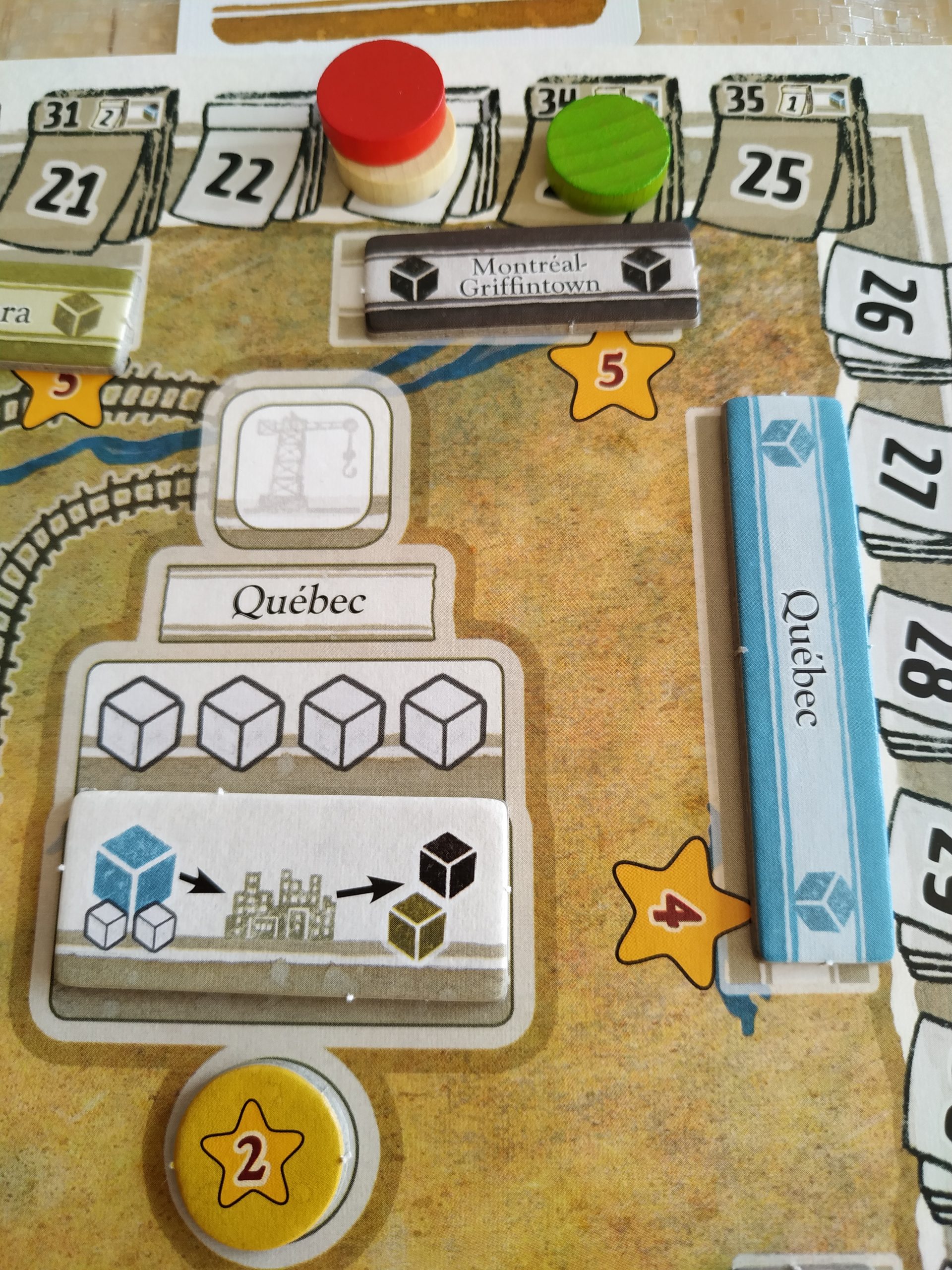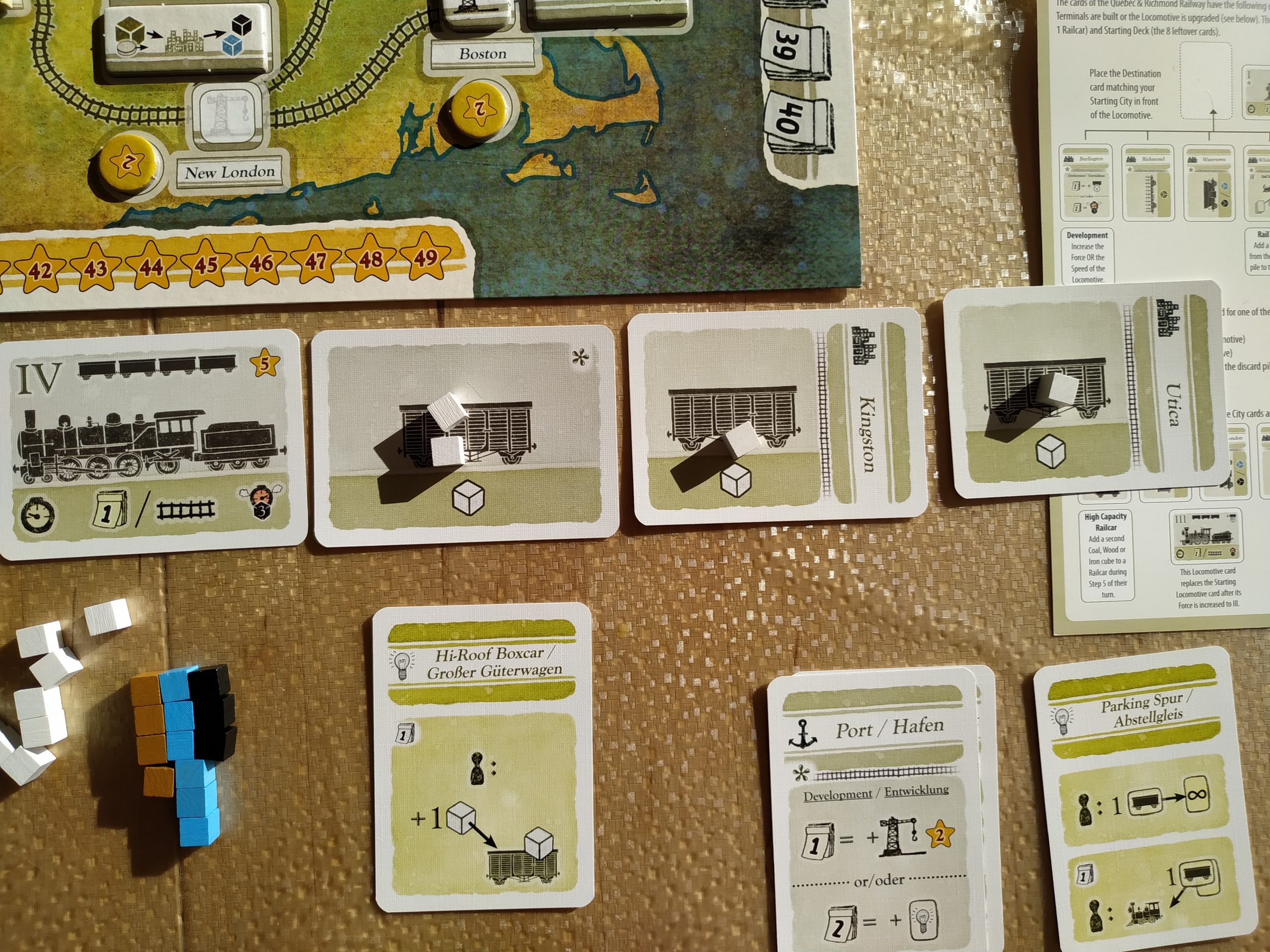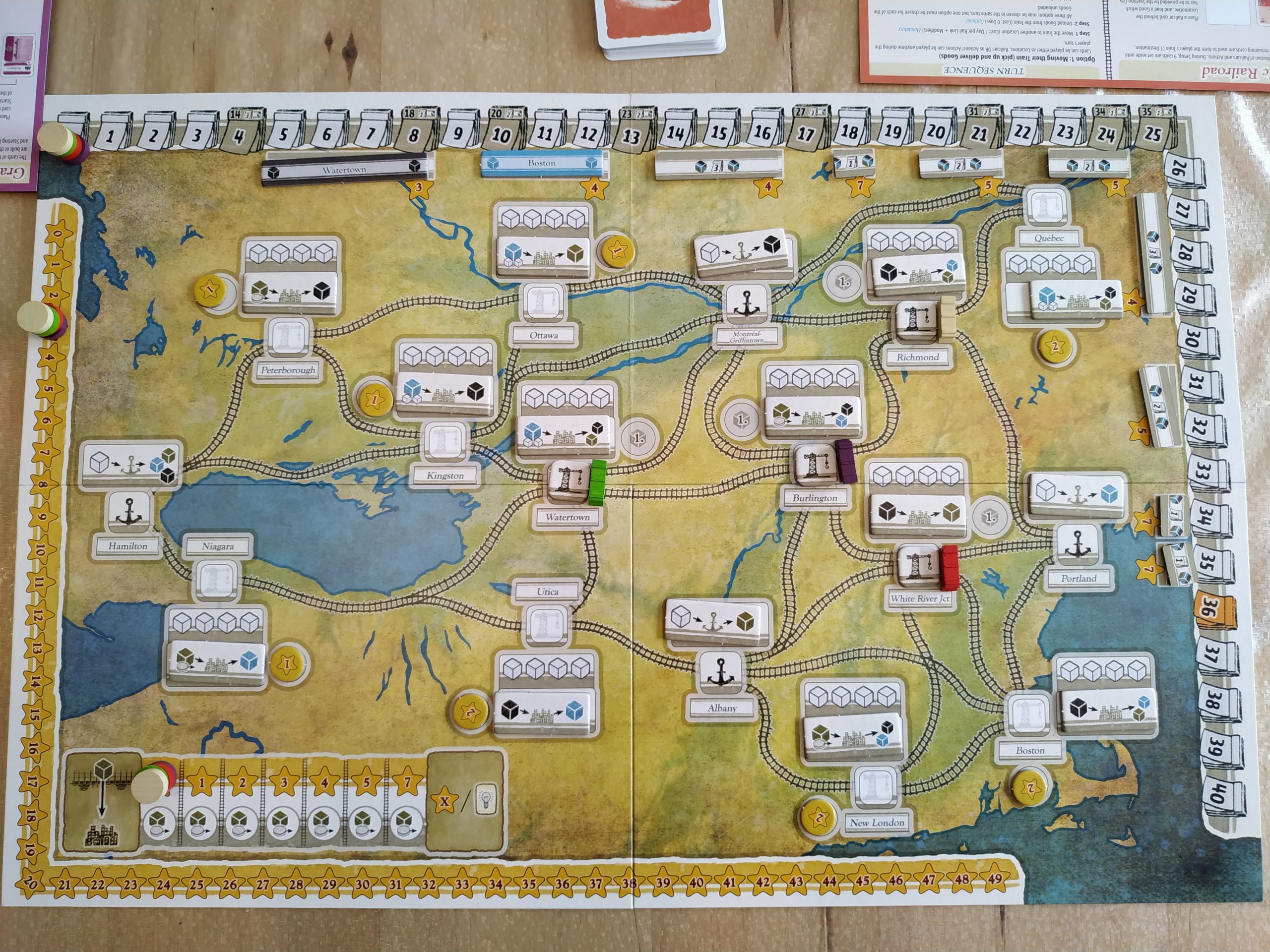 The Grand Trunk Journey de Claude Sirois, édité chez Spielworxx, nous propose de participer au développement du chemin de fer canadien, partant de 4 villes pour transporter des ressources entre celles-ci et des ports. Au fil du jeu, d’autres villes vont s’ouvrir au rail sous l’impulsion des joueurs. Une gestion de cartes (en circuit fermé) vous force à anticiper les coups suivants, tout en gérant vos actions. Chaque tour vous coûte en jours et celui en ayant dépensé le moins sera le joueur suivant (façon Olympios). Bien que proches, les joueurs ont des combinaisons de cartes différentes, vous incitant à changer de couleur à chaque partie pour varier les modes de jeu. Des configurations de base existent pour varier les parties.