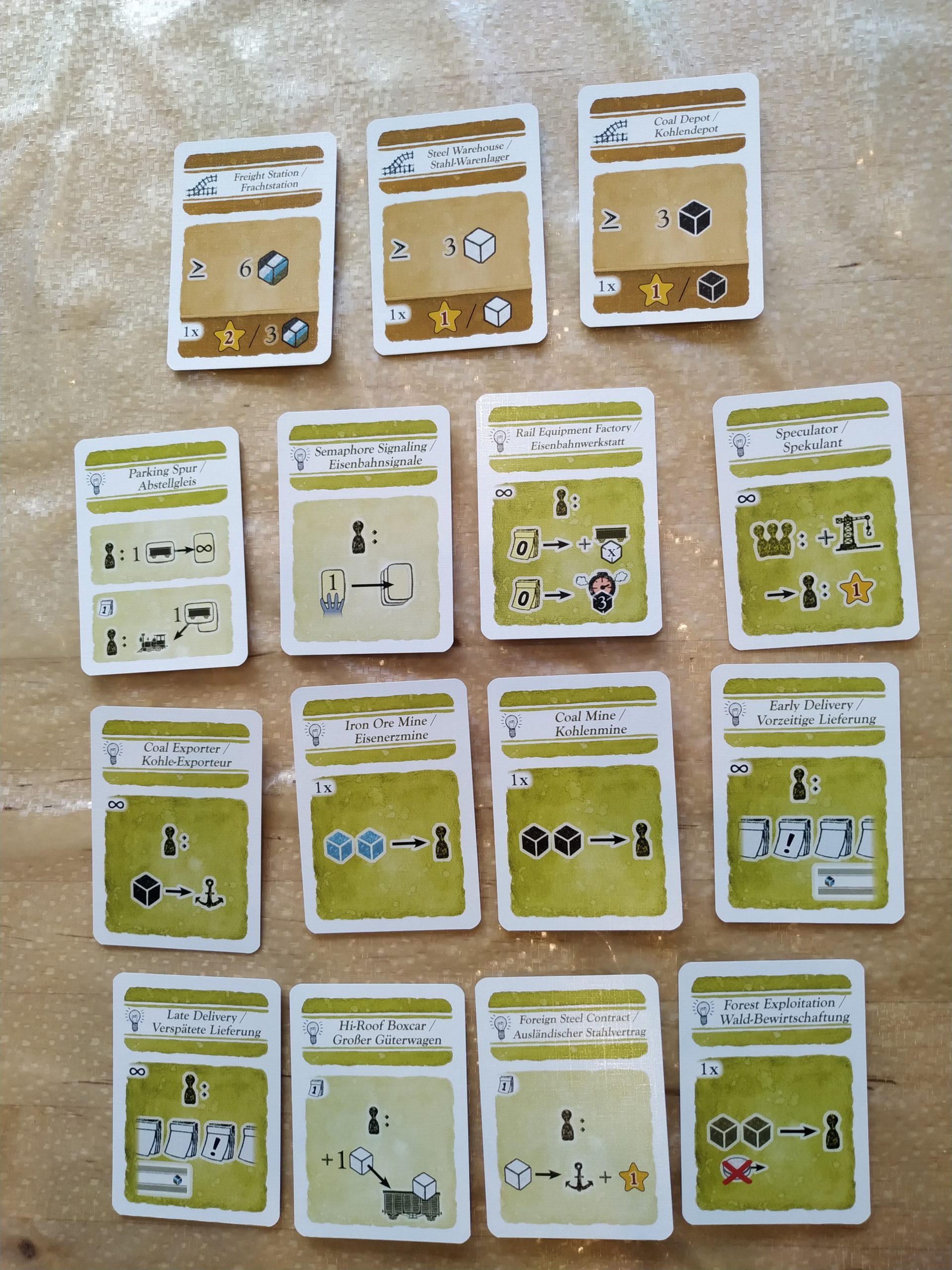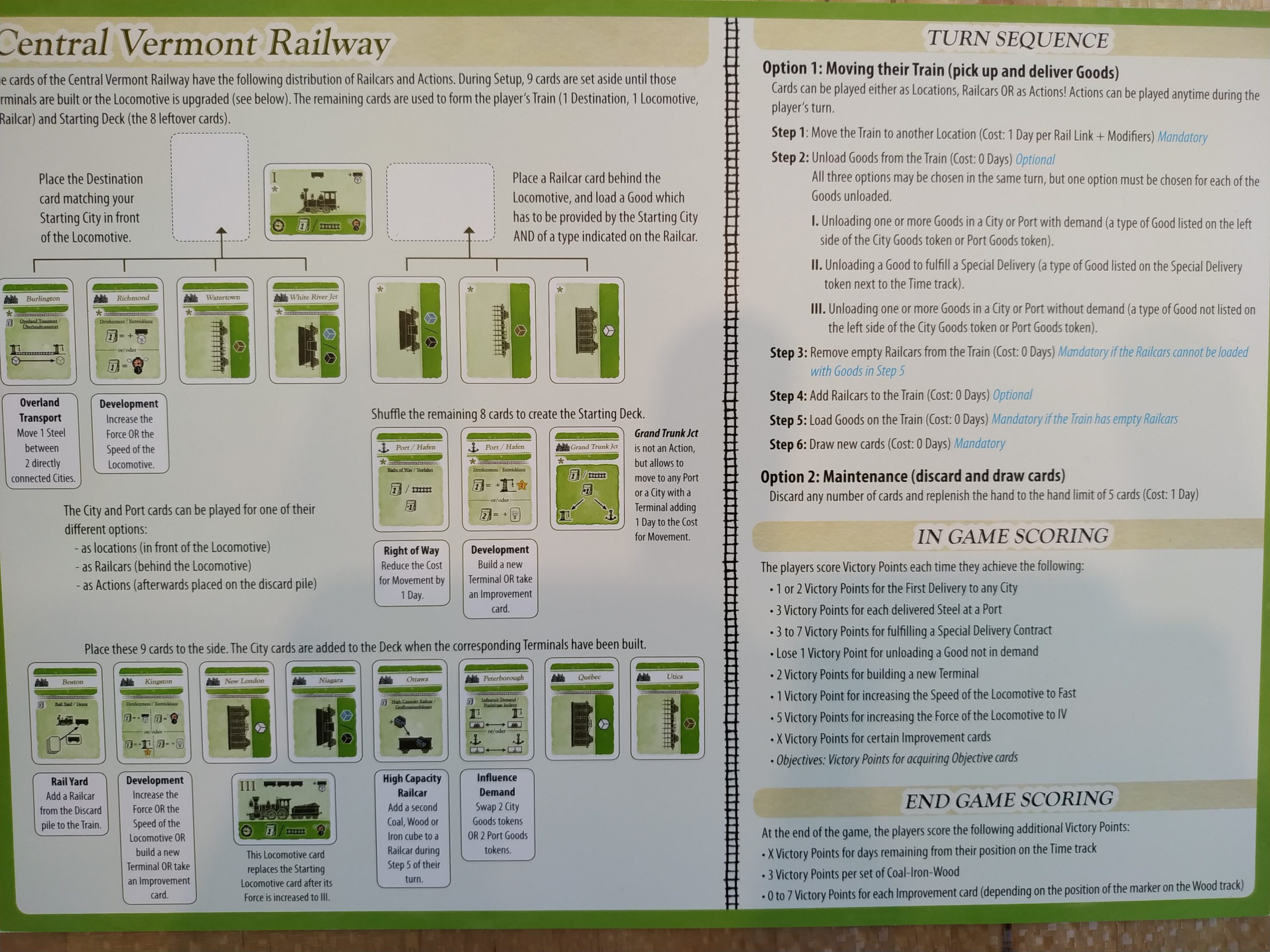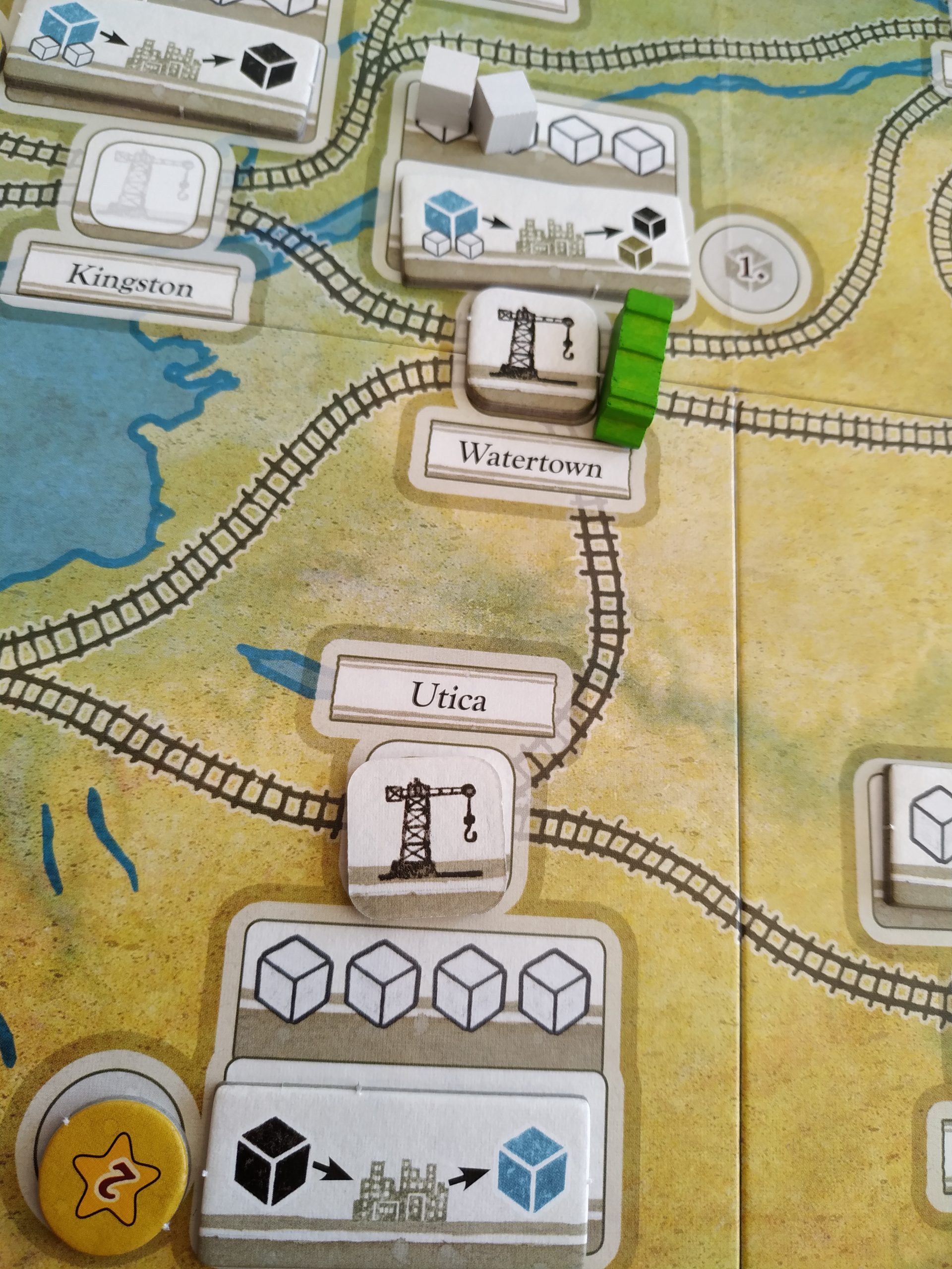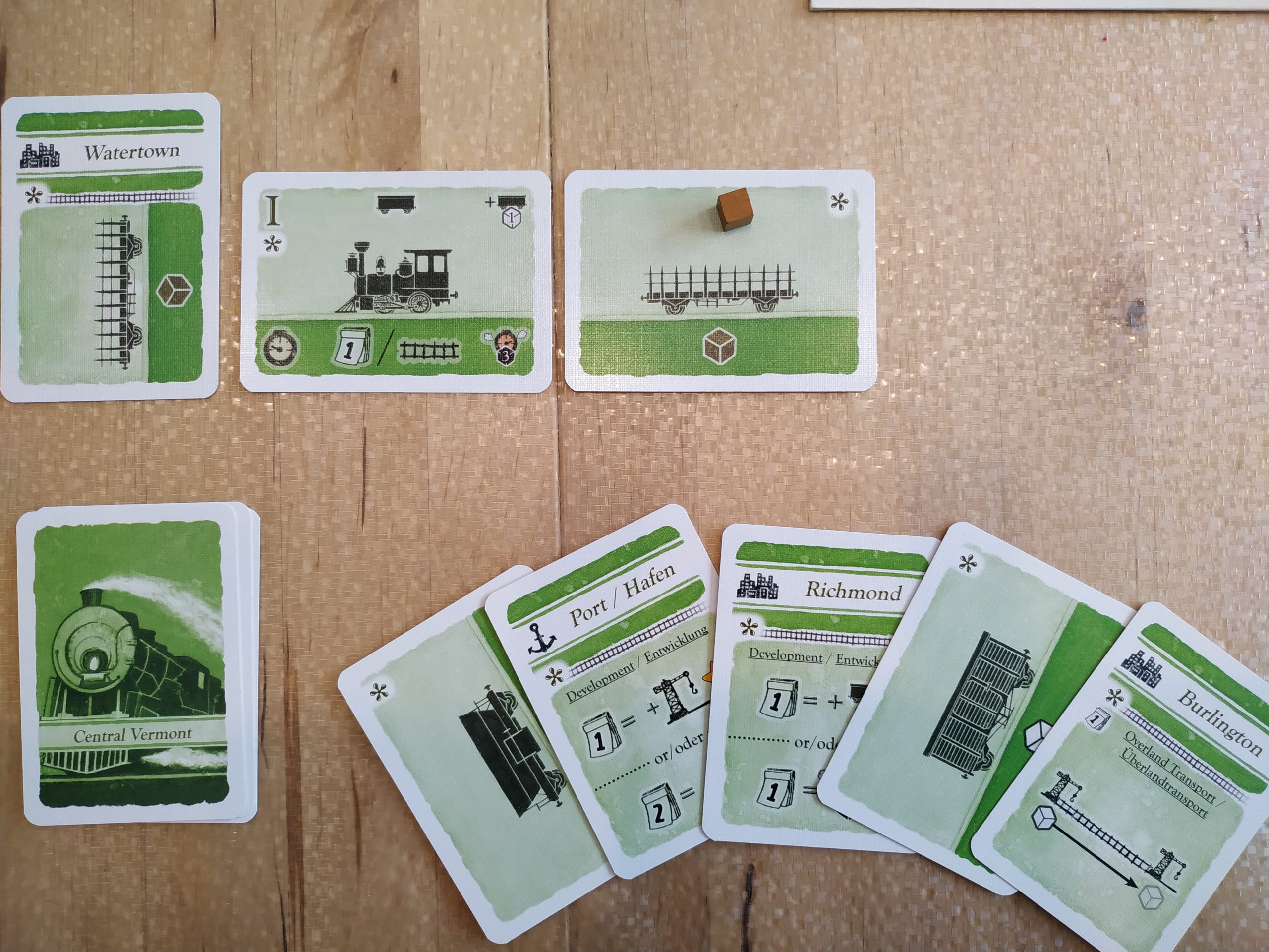 The Grand Trunk Journey de Claude Sirois, édité chez Spielworxx, nous propose de participer au développement du chemin de fer canadien, partant de 4 villes pour transporter des ressources entre celles-ci et des ports. Au fil du jeu, d’autres villes vont s’ouvrir au rail sous l’impulsion des joueurs. Une gestion de cartes (en circuit fermé) vous force à anticiper les coups suivants, tout en gérant vos actions. Chaque tour vous coûte en jours et celui en ayant dépensé le moins sera le joueur suivant (façon Olympios). Bien que proches, les joueurs ont des combinaisons de cartes différentes, vous incitant à changer de couleur à chaque partie pour varier les modes de jeu. Des configurations de base existent pour varier les parties.