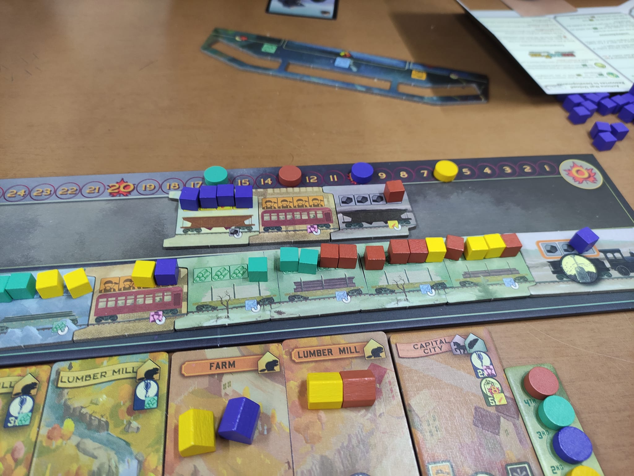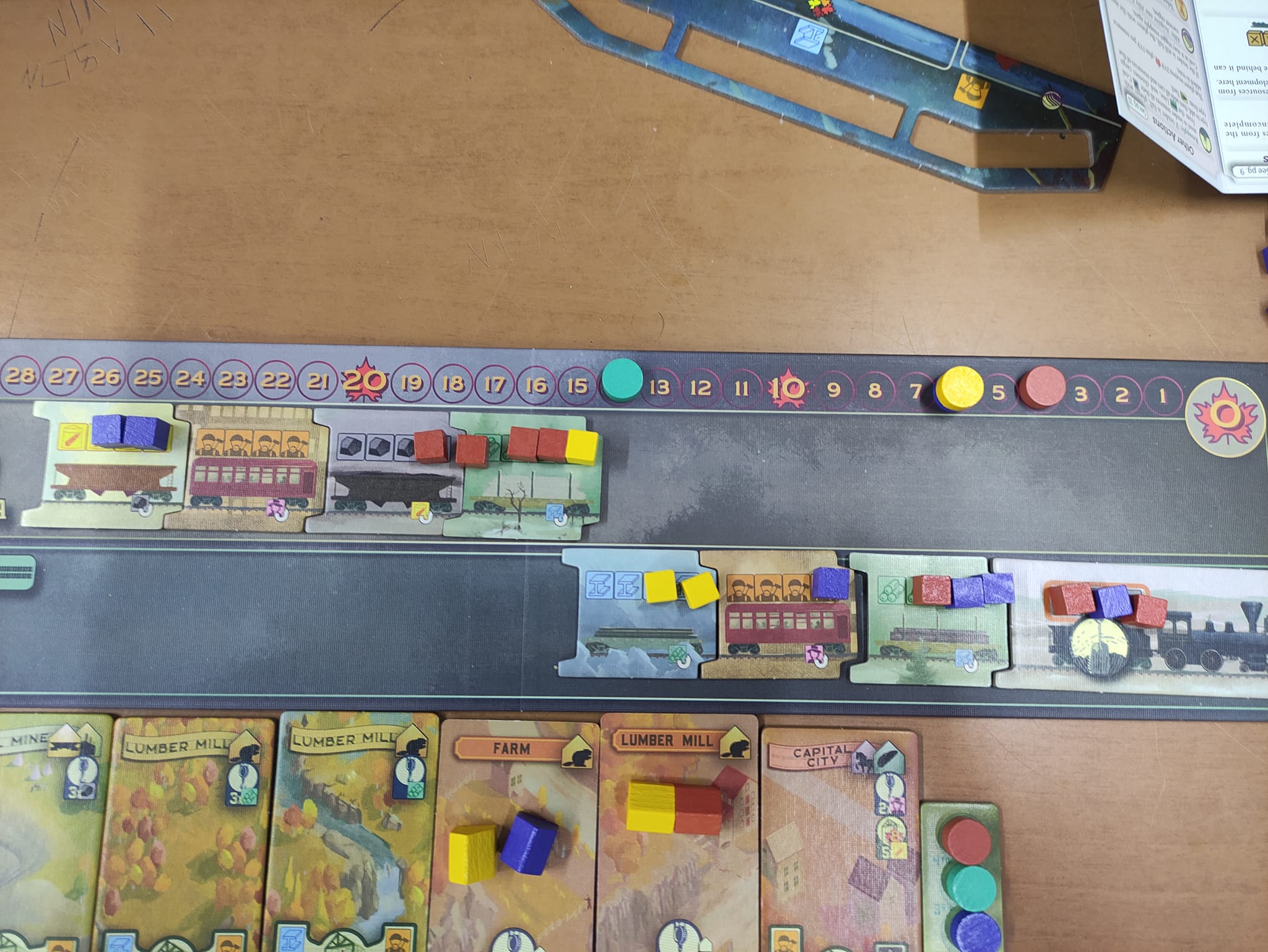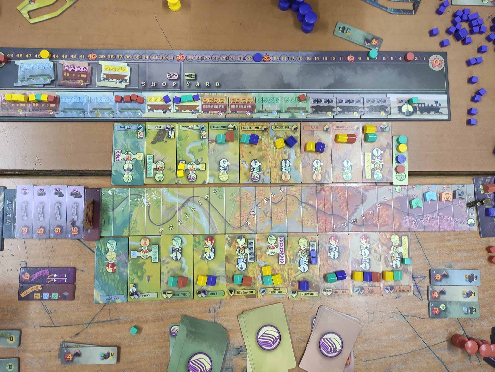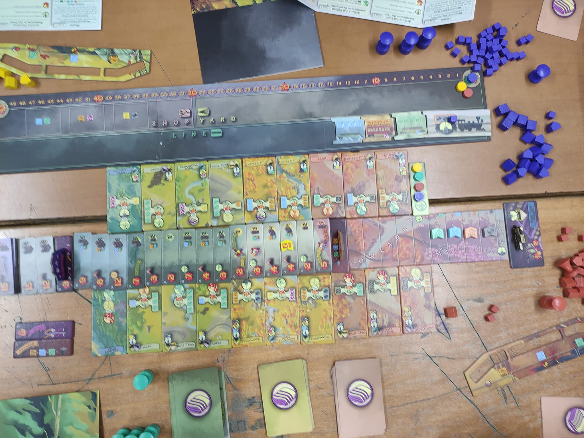 Le train arrivé au bout du chemin, on choisira secrètement combien de fer/bois/hommes on investit dans la construction et selon les demandes du terrain (et le bonus actuel sur un type de biens), on verra de combien de zones on peut avancer. Le plus généreux prendra une tuile de terrain dégagée (récoltant PV et bonus) en échange de ses ressources investies. On continuera avec les autres sur le même système tant qu’il y a des tuiles libérées, mais celui qui ne reçoit rien ne paiera rien.