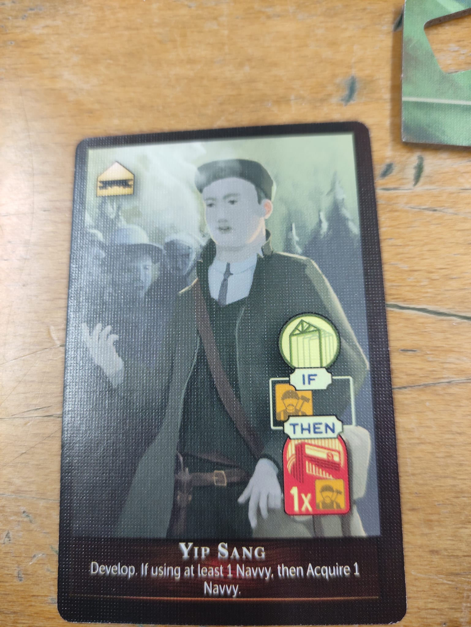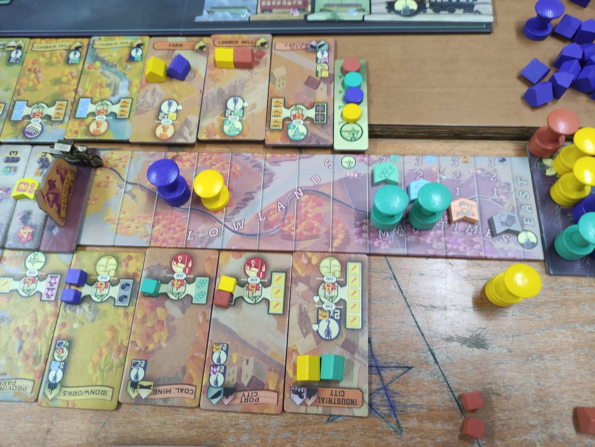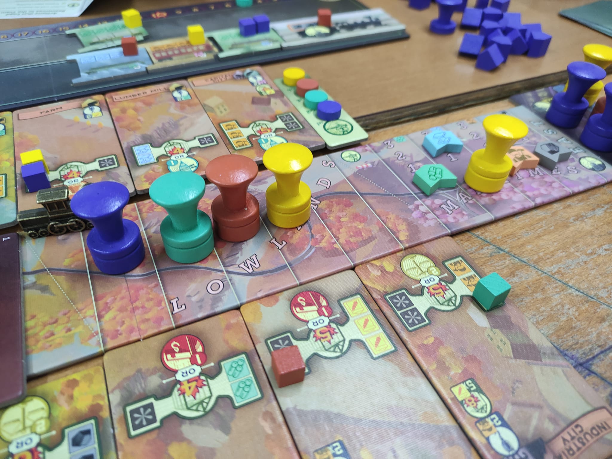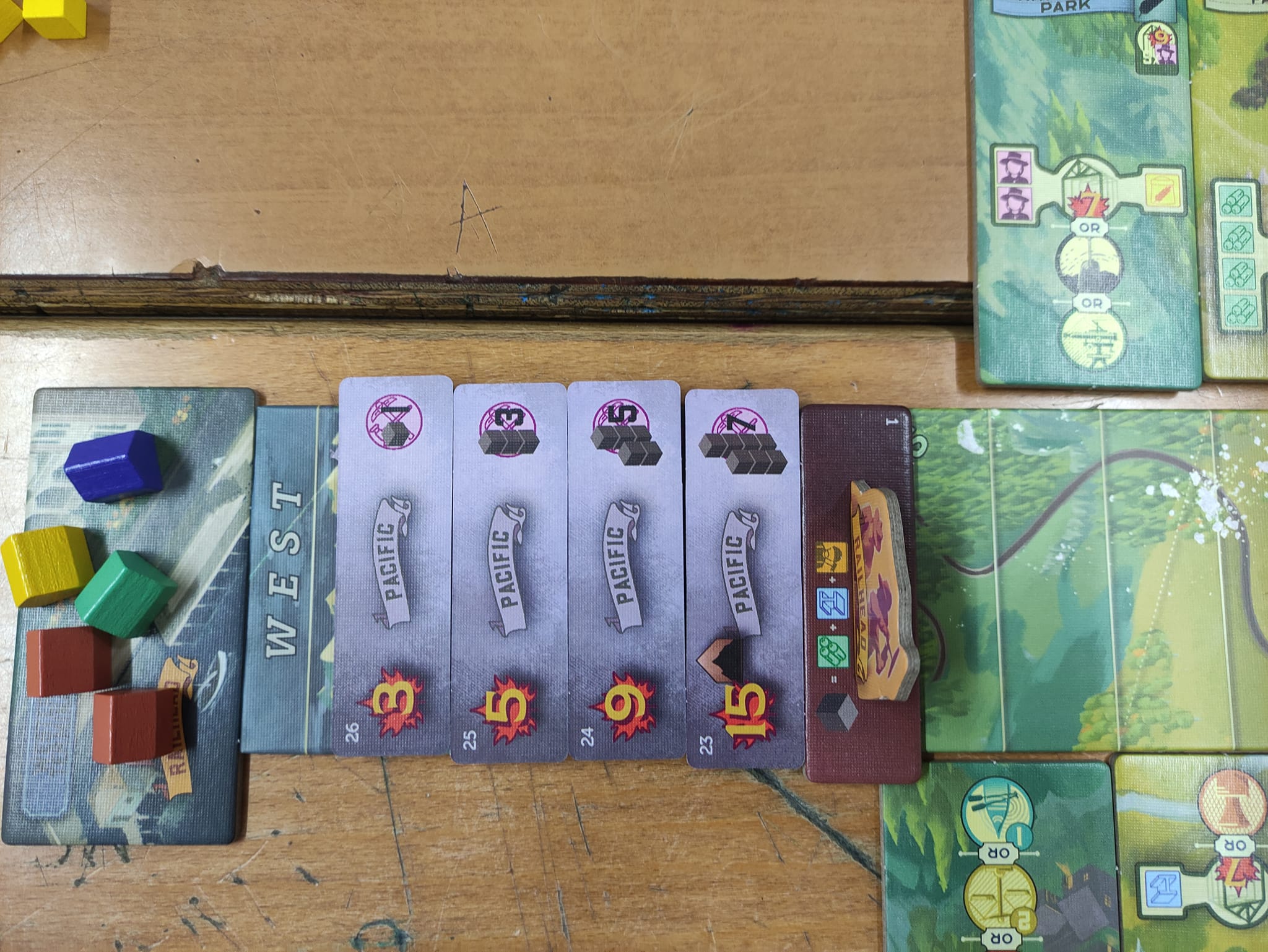 Le train arrivé au bout du chemin, on choisira secrètement combien de fer/bois/hommes on investit dans la construction et selon les demandes du terrain (et le bonus actuel sur un type de biens), on verra de combien de zones on peut avancer. Le plus généreux prendra une tuile de terrain dégagée (récoltant PV et bonus) en échange de ses ressources investies. On continuera avec les autres sur le même système tant qu’il y a des tuiles libérées, mais celui qui ne reçoit rien ne paiera rien.