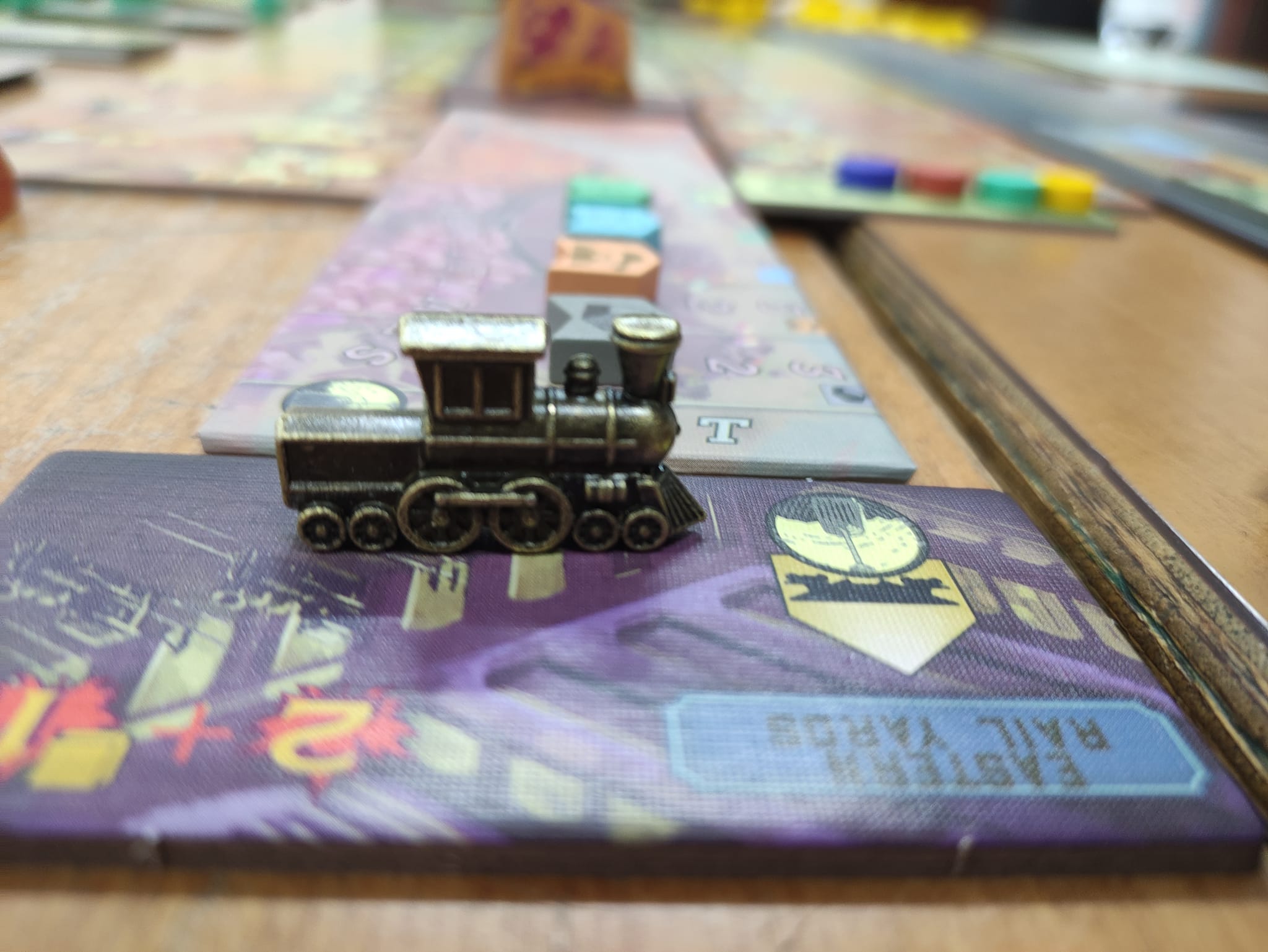 Tous ces endroits pourront être développés au fur et à mesure que le jeu avancera, en partant de la gare de triage de l’est, selon leurs besoins, comme autant de villes champignons que nous aideront à développer. Le train contient quelques wagons, le strict nécessaire pour placer des voies, soit du bois, du fer et des hommes, que nous amenons au bout de la voie actuelle et que l’on utilisera pour la faire progresser.