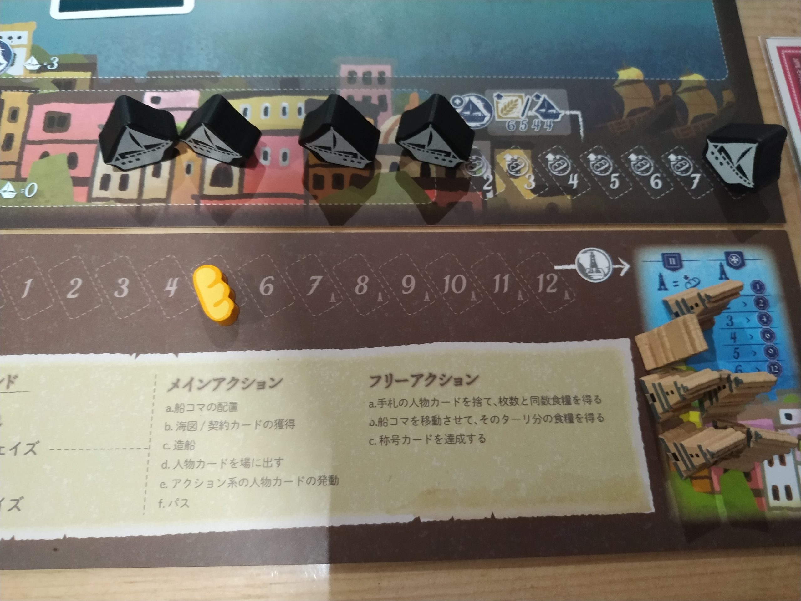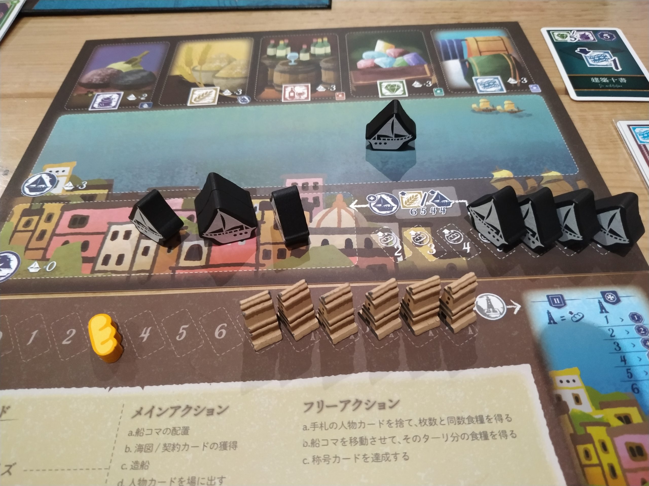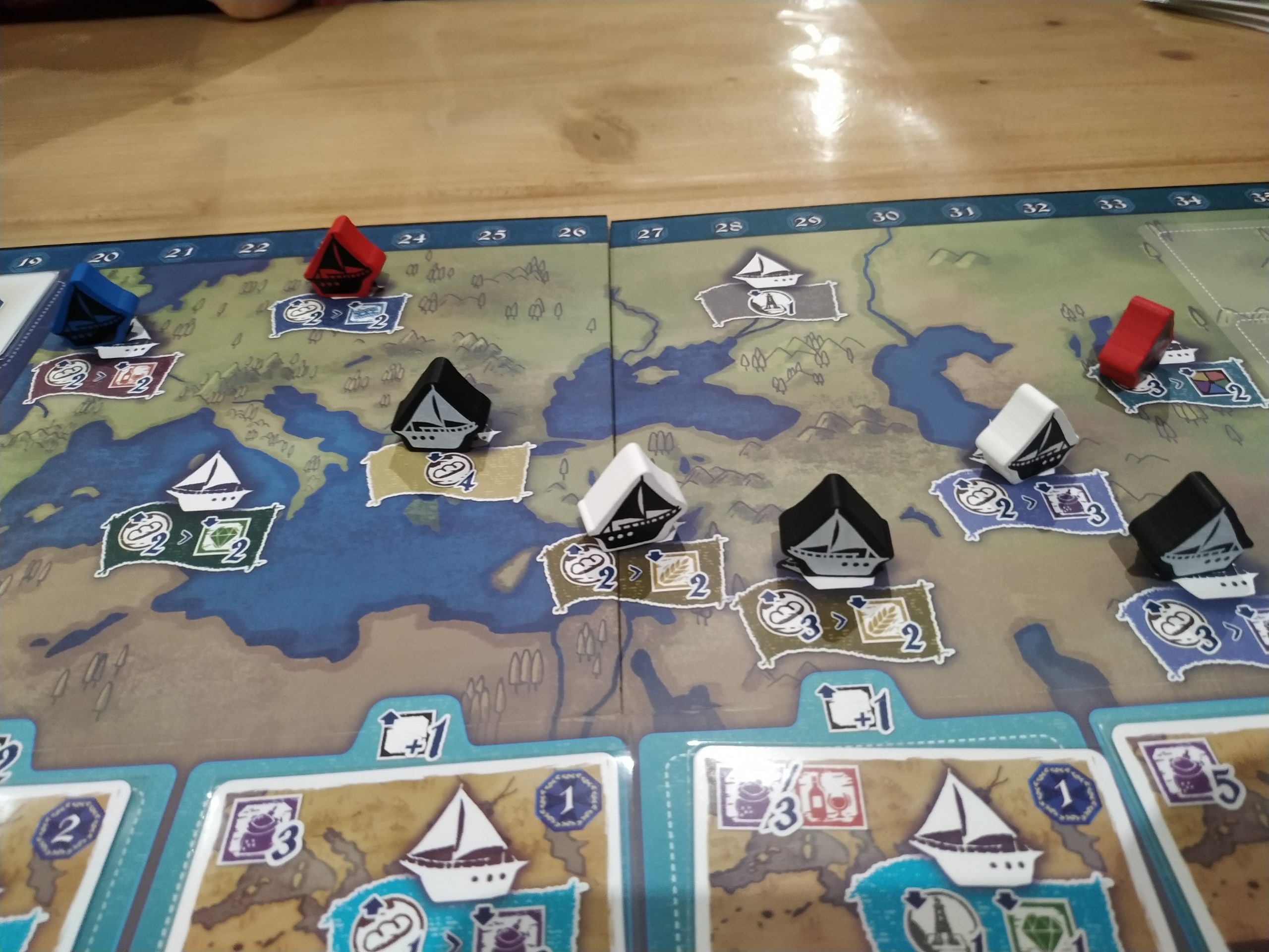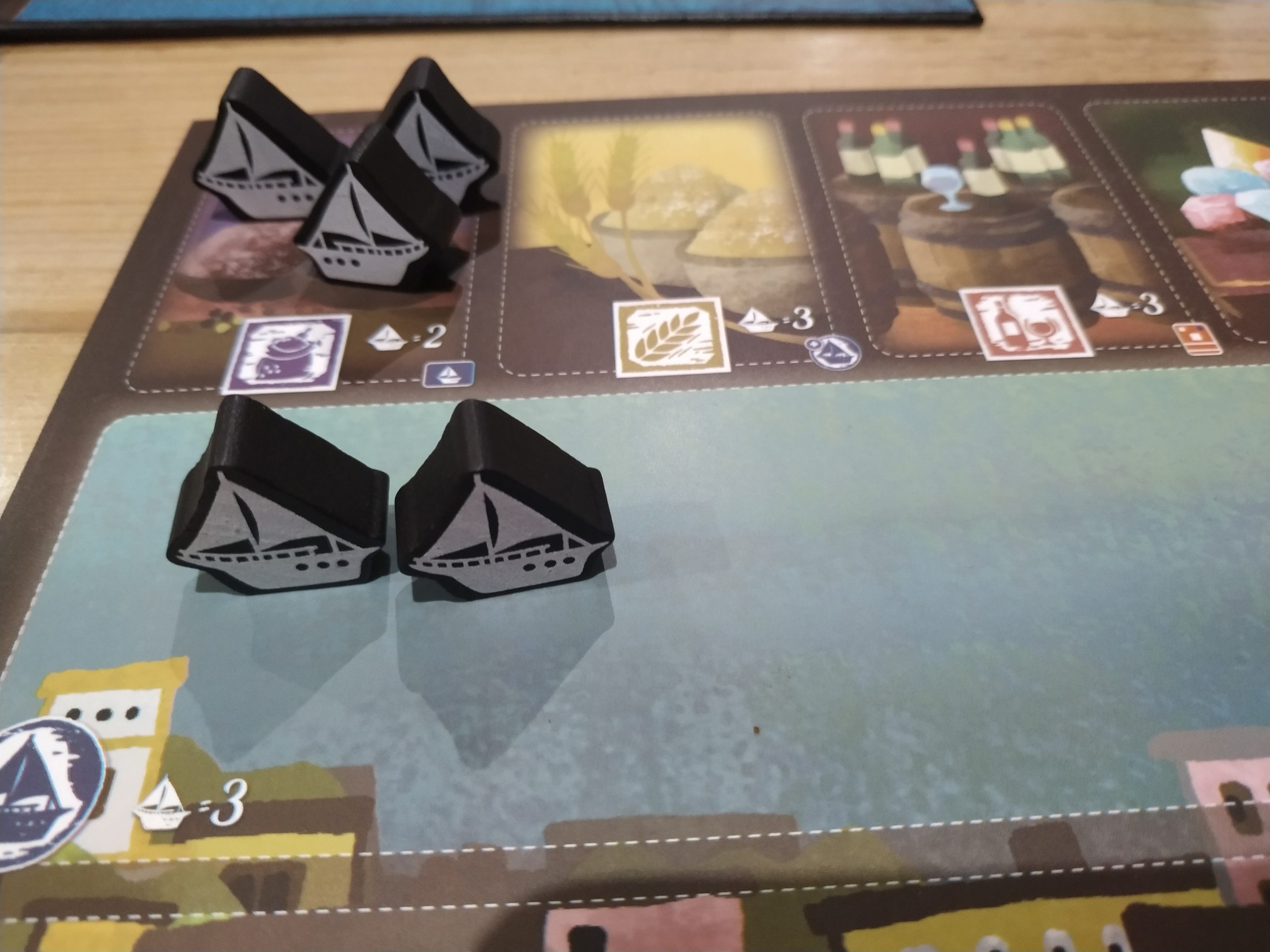 Ce qui est génial de simplicité, c’est que les bateaux (6) que l’on a au début de jeu (et qui pourront être 12 en fin de jeu) servent aussi de marqueur de ressource. Par exemple, lorsque je place un bateau sur le plateau qui transforme 2 pains (food) en 2 vin (bloquant la case pour les autres), je glisse 2 bateaux de l’espace mer vers la case vin. Lorsque je devrai payer du vin, je descendrai un ou plusieurs bateaux vers l’espace mer, chacun ramenant 3 vins. Toute ressource ramenée non utilisée pour payer mon achat (exemple une carte à 5 vins, il reste 1) sera transformée en pain. Ces bateaux redeviennent alors disponibles pour payer d’autres actions ou représenter d’autres ressources. Vous ferez ainsi moins d’actions lors de la première manche (6 bateaux) que lors de la dernière (possiblement 12, certainement au moins 9 ou 10 si vous n’avez pas trop mal joué).