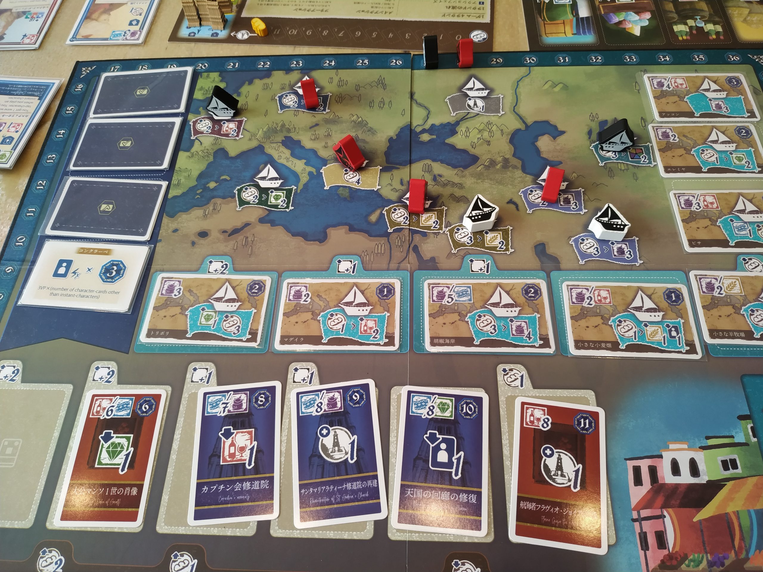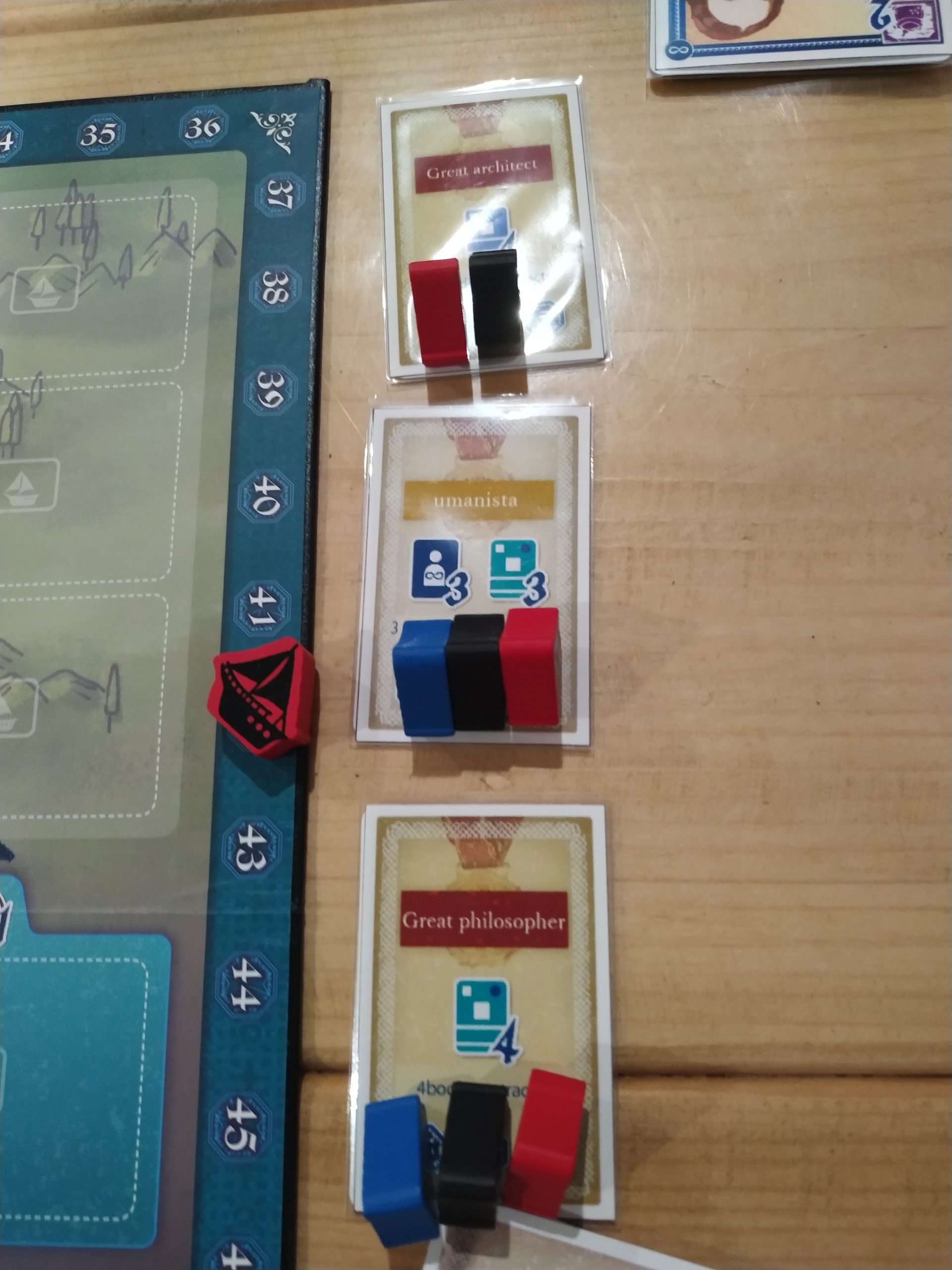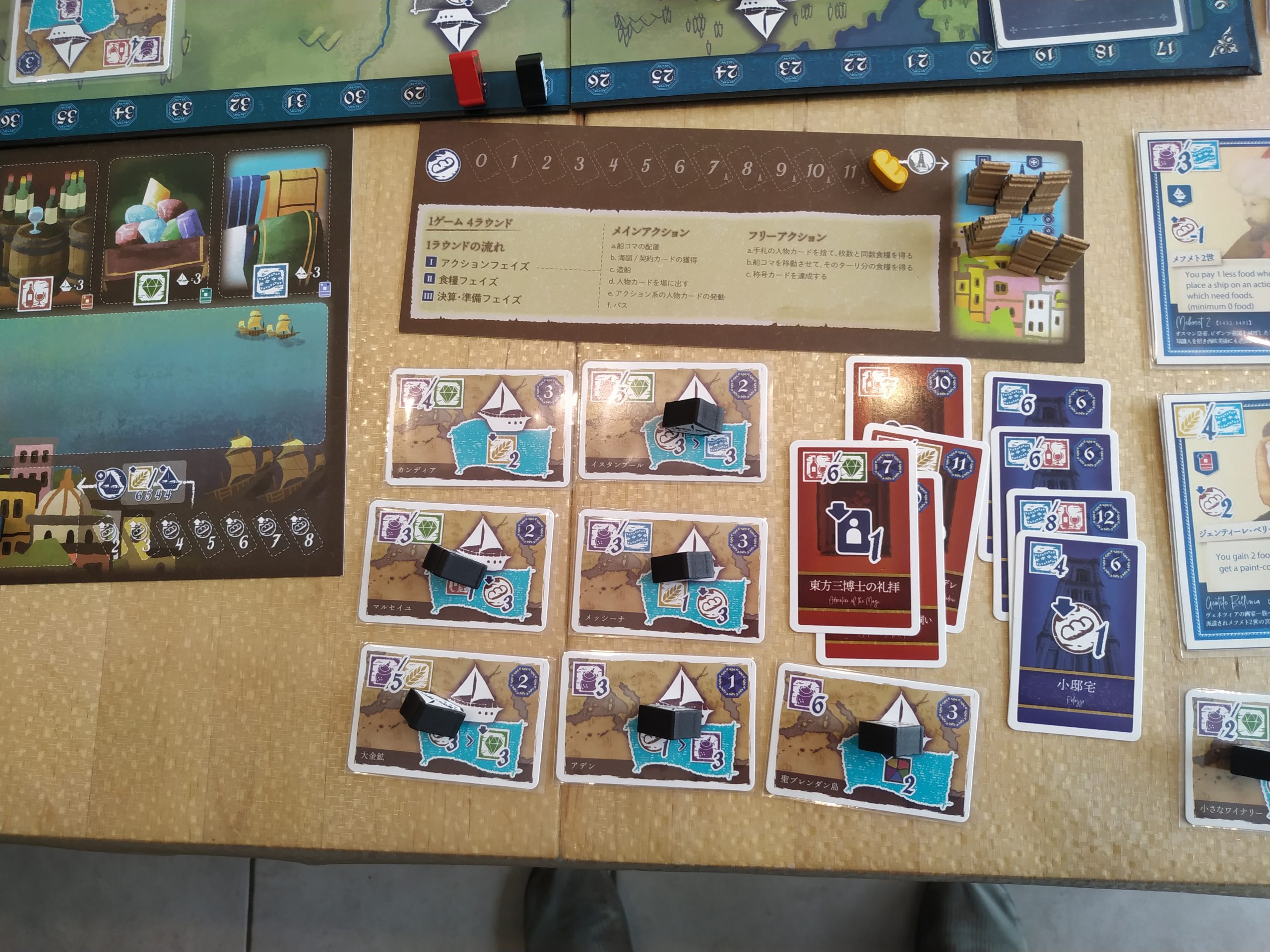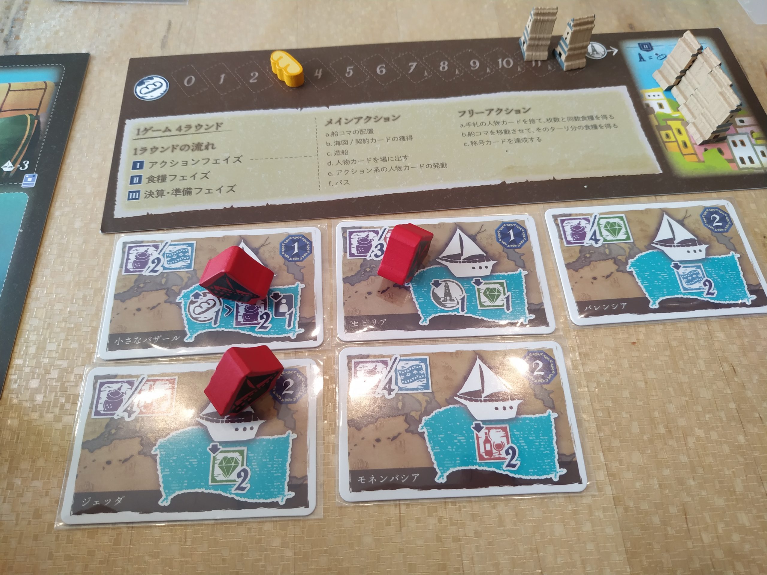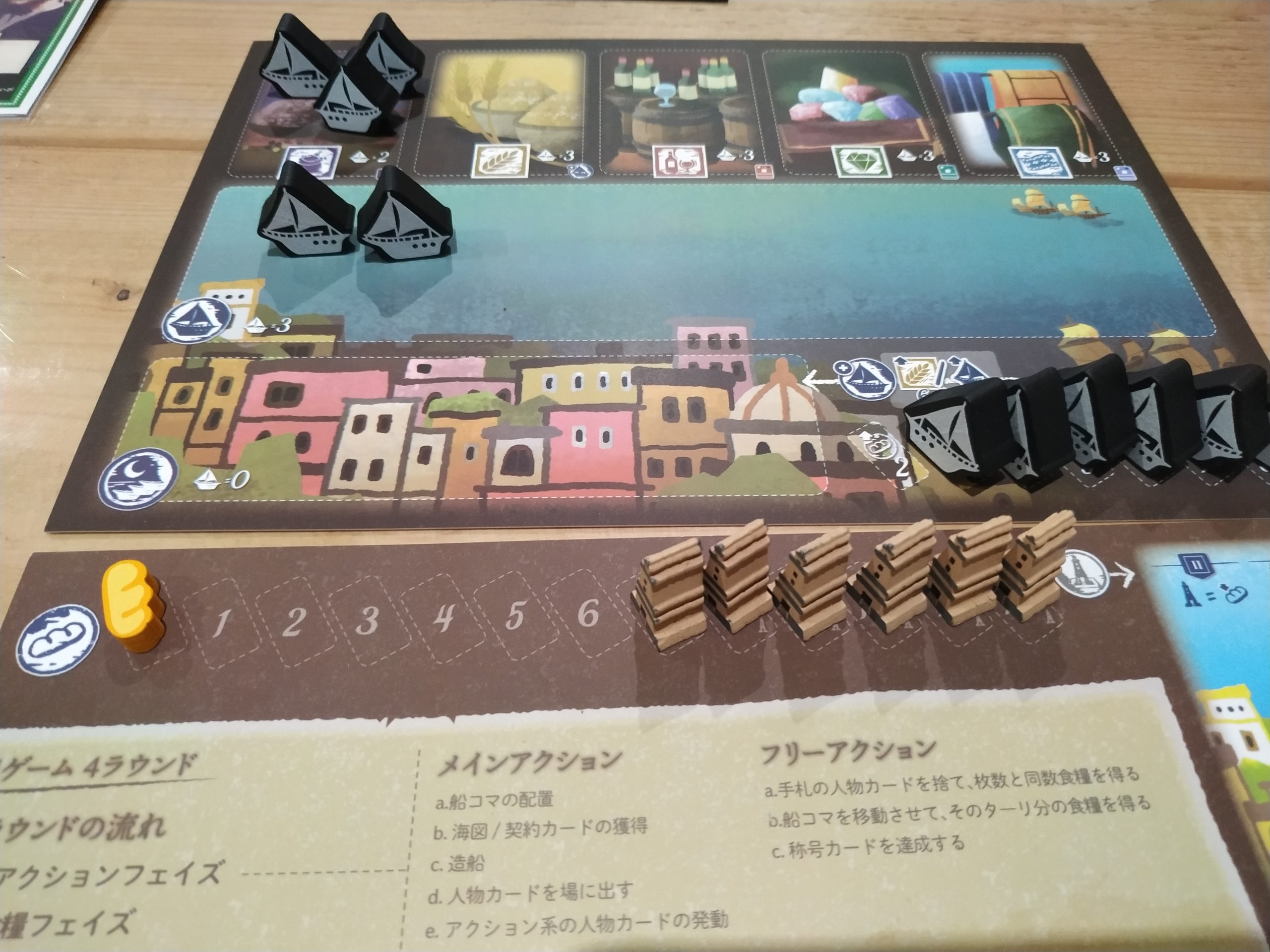 Ce qui est génial de simplicité, c’est que les bateaux (6) que l’on a au début de jeu (et qui pourront être 12 en fin de jeu) servent aussi de marqueur de ressource. Par exemple, lorsque je place un bateau sur le plateau qui transforme 2 pains (food) en 2 vin (bloquant la case pour les autres), je glisse 2 bateaux de l’espace mer vers la case vin. Lorsque je devrai payer du vin, je descendrai un ou plusieurs bateaux vers l’espace mer, chacun ramenant 3 vins. Toute ressource ramenée non utilisée pour payer mon achat (exemple une carte à 5 vins, il reste 1) sera transformée en pain. Ces bateaux redeviennent alors disponibles pour payer d’autres actions ou représenter d’autres ressources. Vous ferez ainsi moins d’actions lors de la première manche (6 bateaux) que lors de la dernière (possiblement 12, certainement au moins 9 ou 10 si vous n’avez pas trop mal joué).