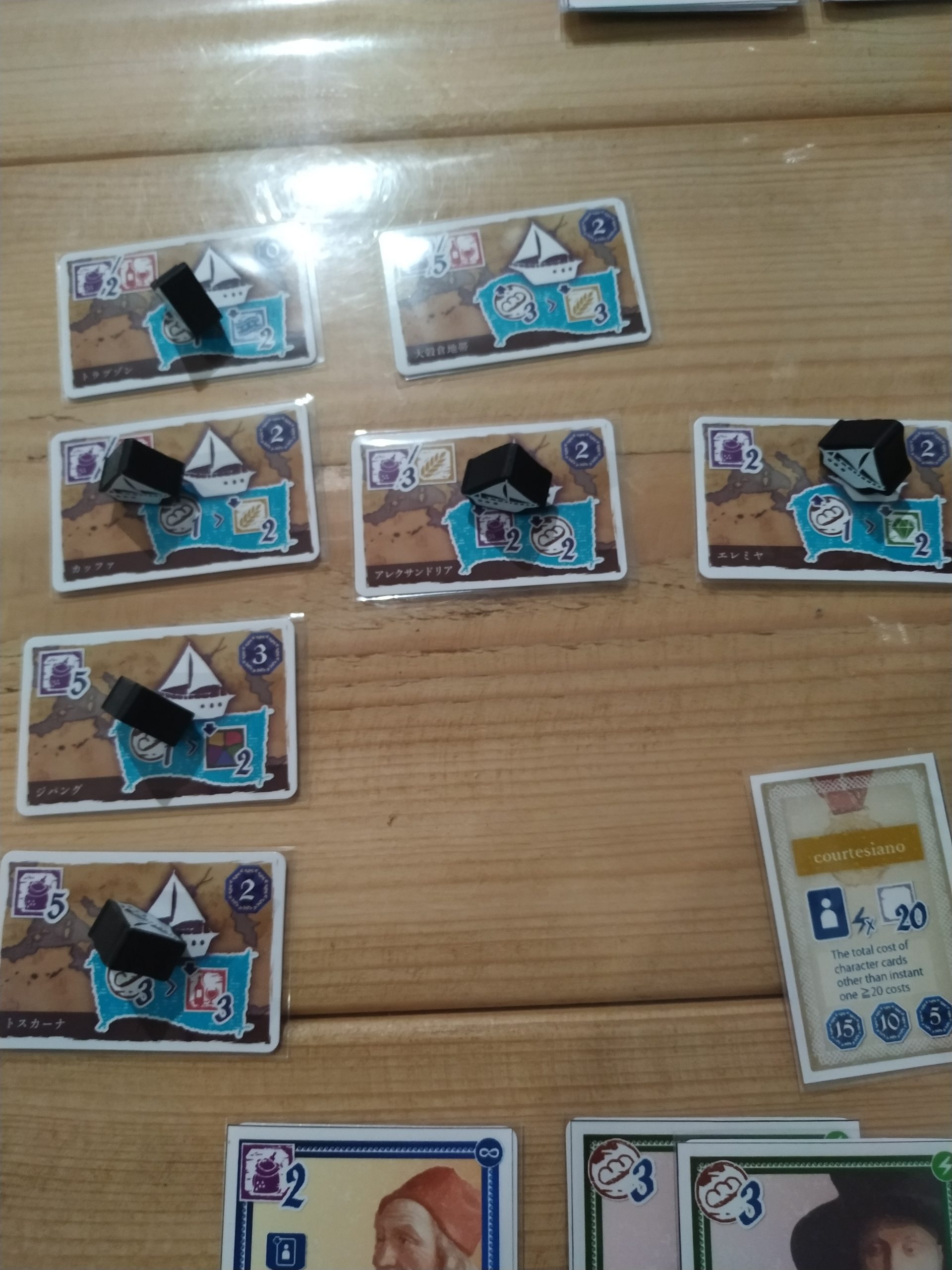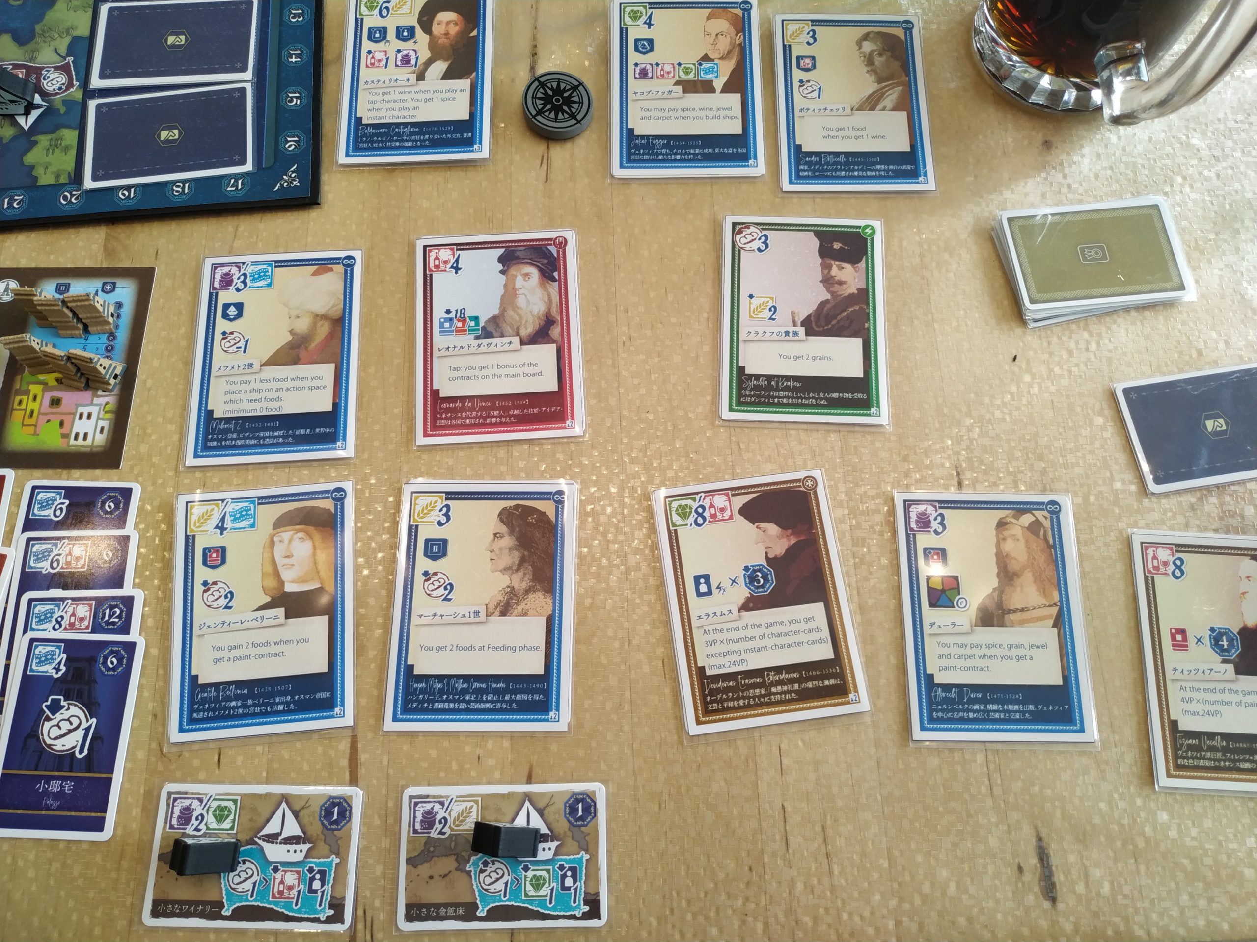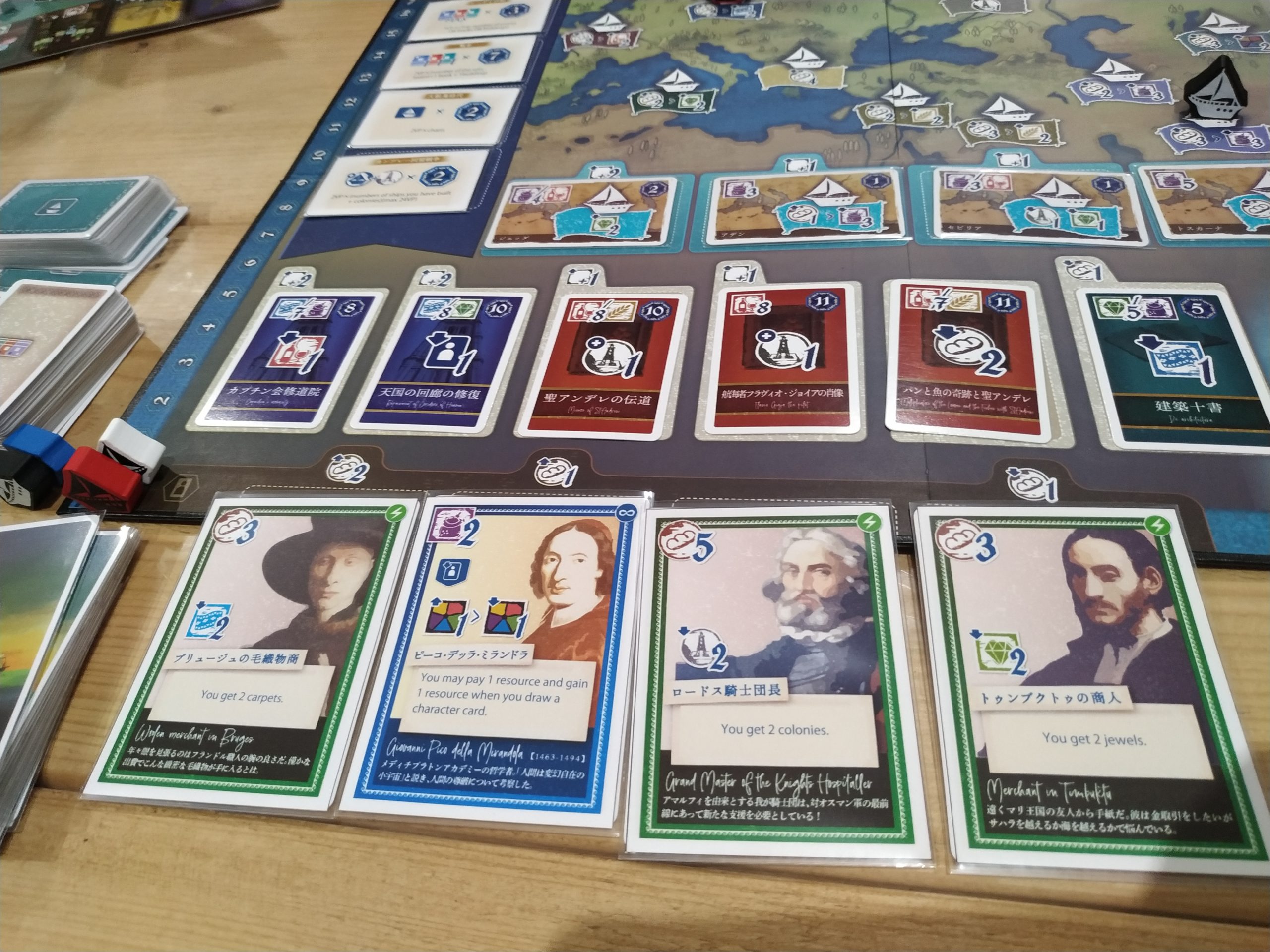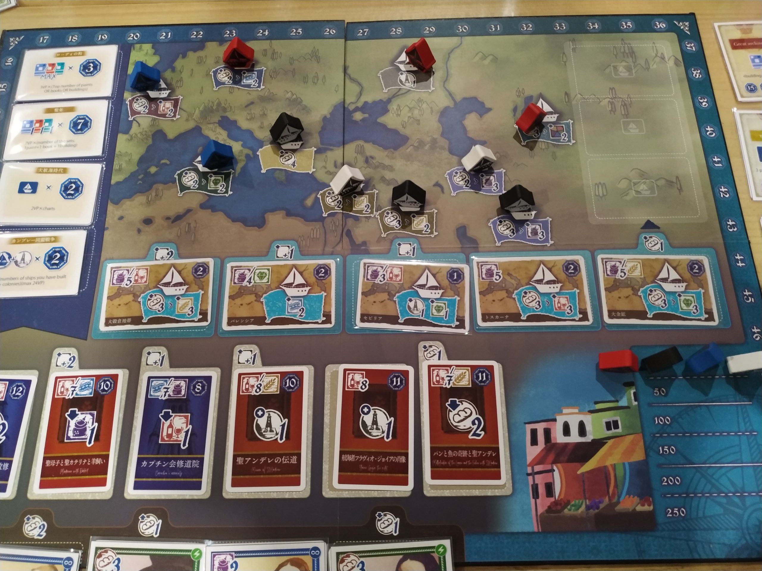 Ce qui est génial de simplicité, c’est que les bateaux (6) que l’on a au début de jeu (et qui pourront être 12 en fin de jeu) servent aussi de marqueur de ressource. Par exemple, lorsque je place un bateau sur le plateau qui transforme 2 pains (food) en 2 vin (bloquant la case pour les autres), je glisse 2 bateaux de l’espace mer vers la case vin. Lorsque je devrai payer du vin, je descendrai un ou plusieurs bateaux vers l’espace mer, chacun ramenant 3 vins. Toute ressource ramenée non utilisée pour payer mon achat (exemple une carte à 5 vins, il reste 1) sera transformée en pain. Ces bateaux redeviennent alors disponibles pour payer d’autres actions ou représenter d’autres ressources. Vous ferez ainsi moins d’actions lors de la première manche (6 bateaux) que lors de la dernière (possiblement 12, certainement au moins 9 ou 10 si vous n’avez pas trop mal joué).