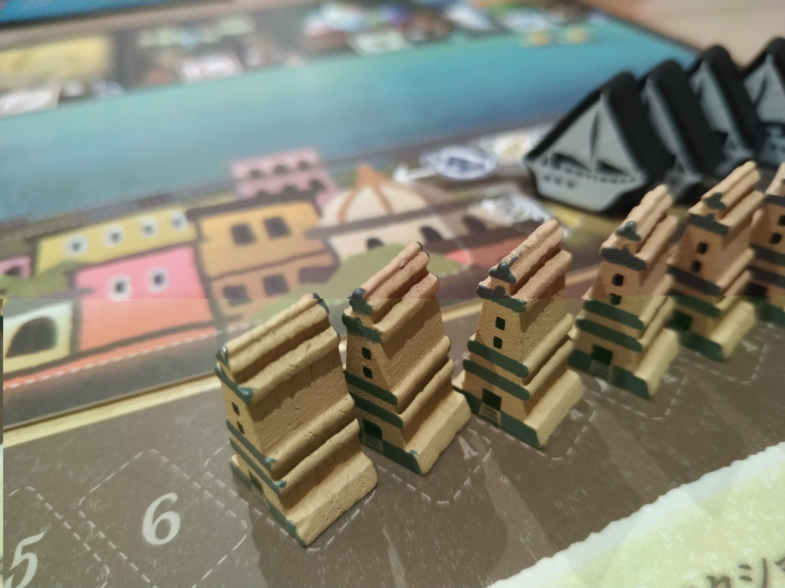 Malgré l’absence d’Essen et de son village japonais, nous avons la chance de toucher à Amalfi, envoyé depuis l’autre côté de la terre avec des print papier en anglais des cartes (dont la couleur est moins chatoyante) que nous plaçons sous sleeve. De jolis bateaux, un matériel sobre mais efficace et surtout des règles d’une déroutante simplicité accompagnent un jeu annoncé à 2 h (au moins) à 4 joueurs. On s’installe vite à table et les explications vont bon train ou plutôt ne font pas de vague 🙂 .