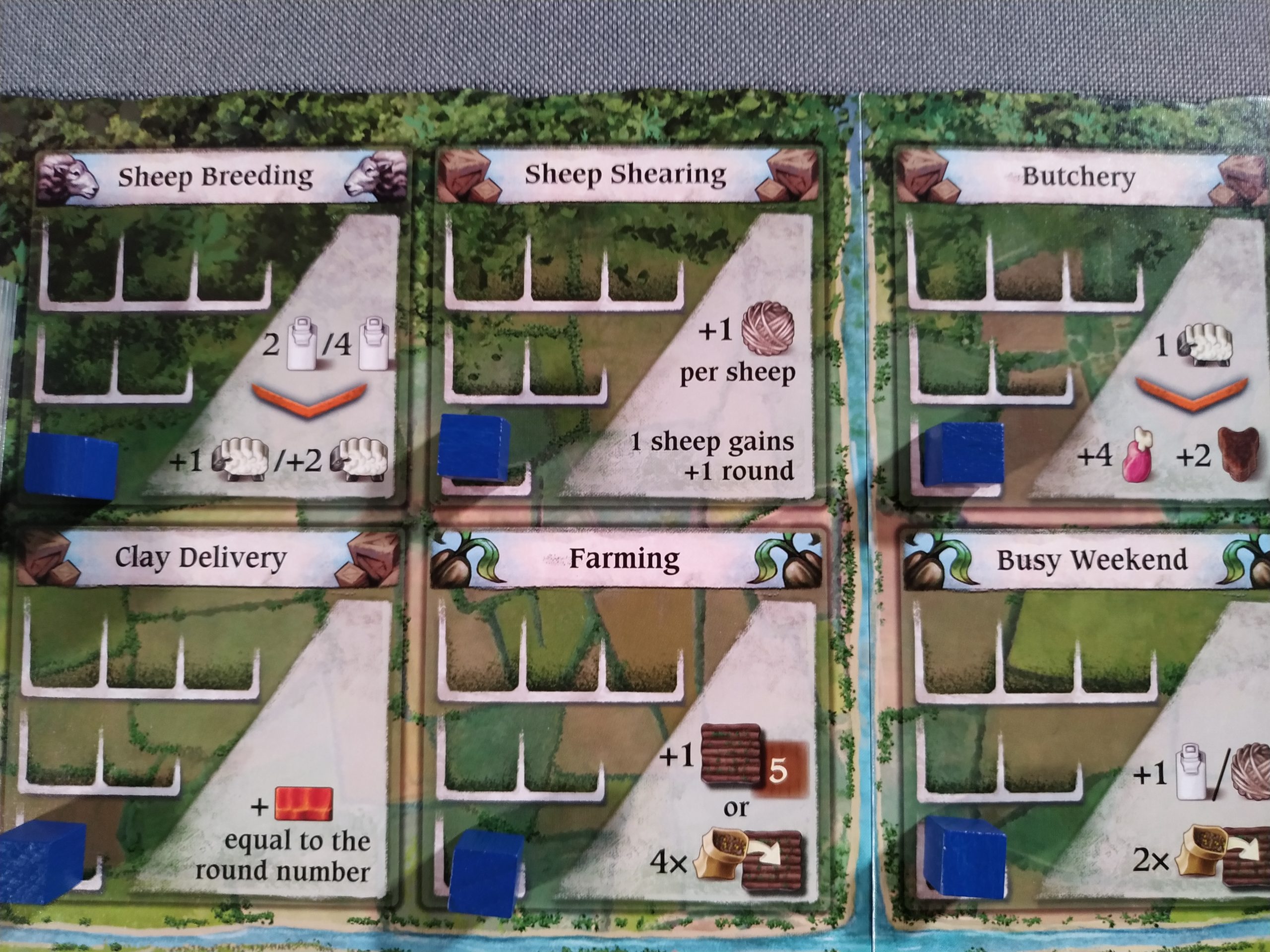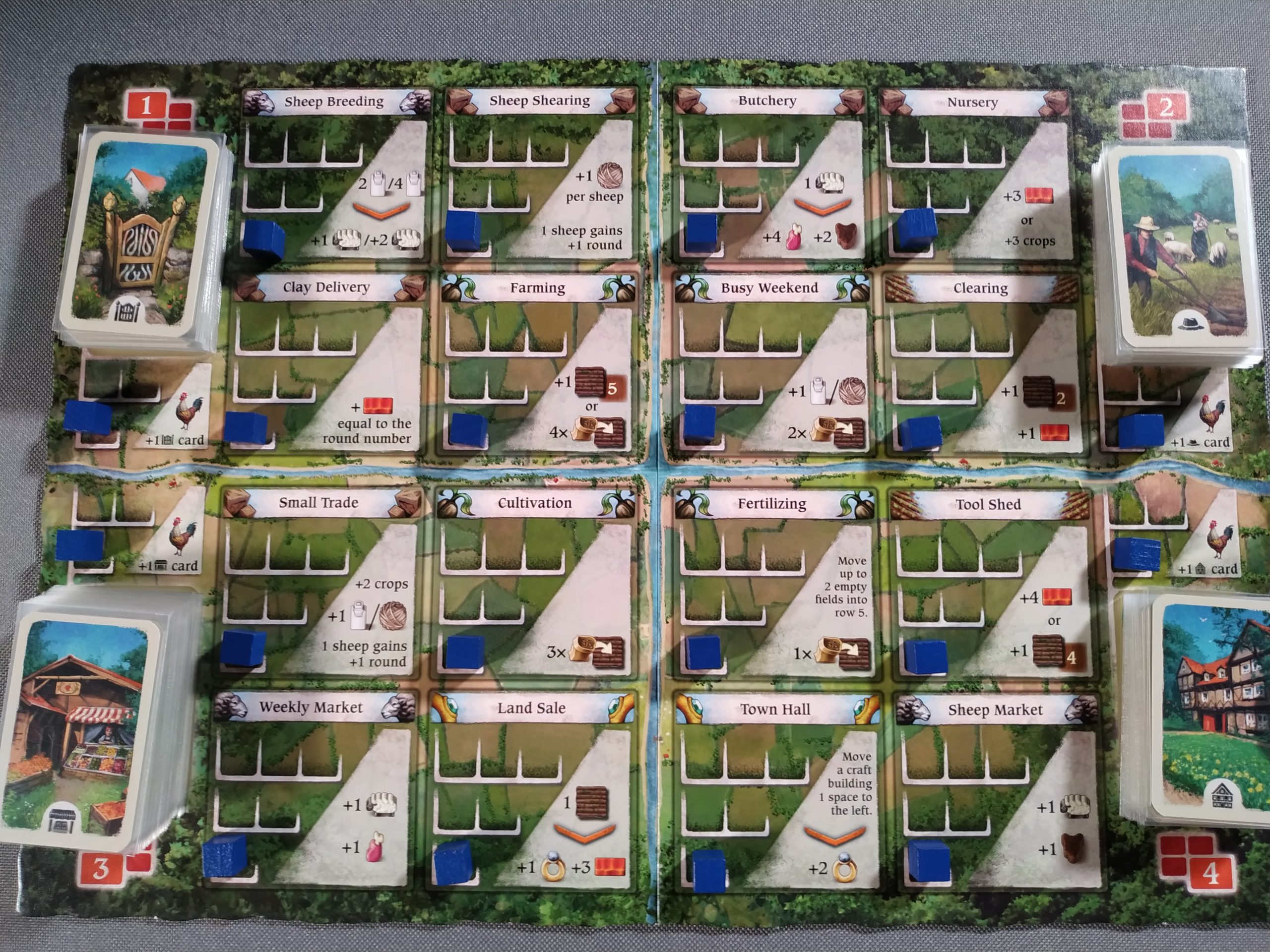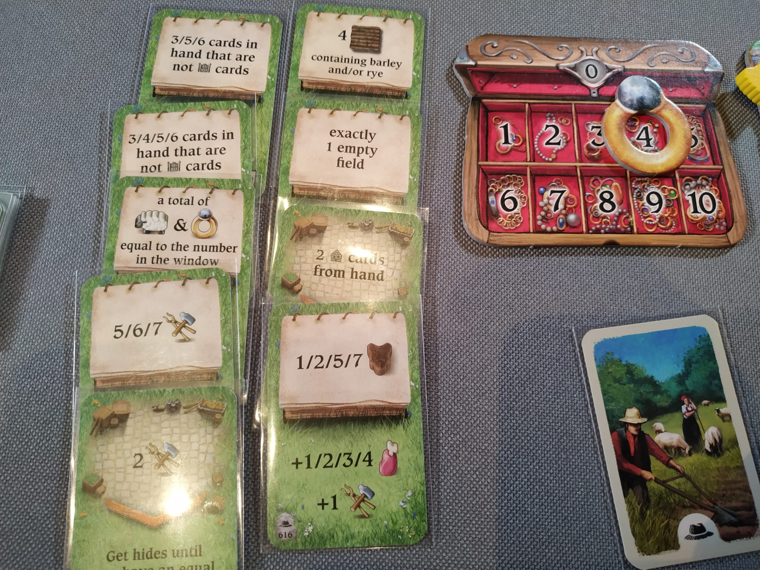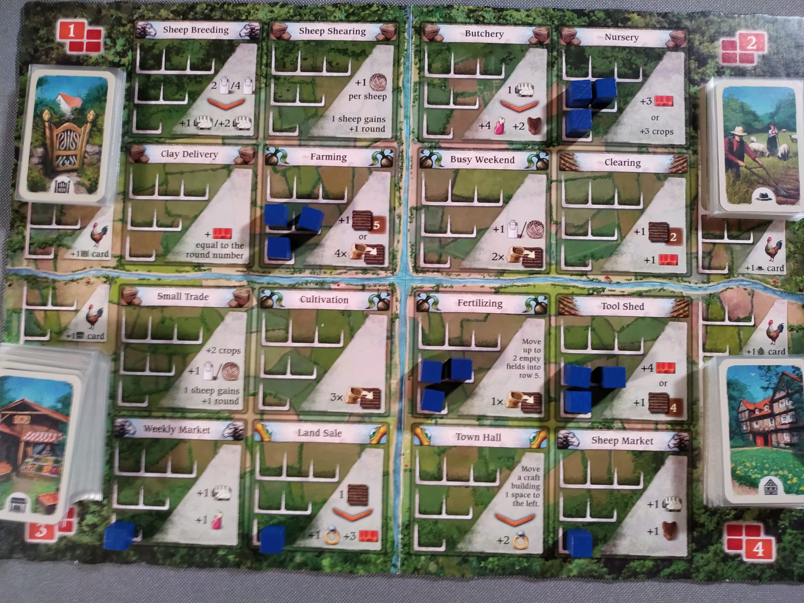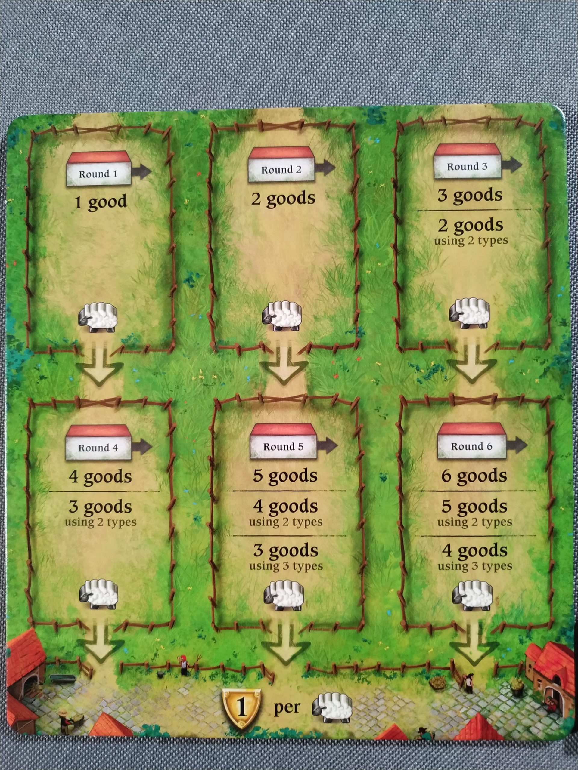 Fin de partie après 2h10 assez agréables, aux scores variés : 108-100-95-67. Le premier et le 3ième ont joué principalement la maison (plus de 50 % de leurs PV) tandis que les deux autres ont joué les cartes. La grande différence entre le 2ième et le 4ième (et ce qui fait que le 2ième n’est pas premier), c’est la chance. Le problème des cartes par rapport à la maison est que leur pouvoir et validation dépend de leur tirage. Le quatrième fini avec plus de 6 cartes infaisables en main, quand le deuxième fait 14 points sur l’avant dernière carte tirée. Si sa dernière avait été réalisable (en valorisant la laine qu’il avait en stock par exemple) il aurait pu passer devant.