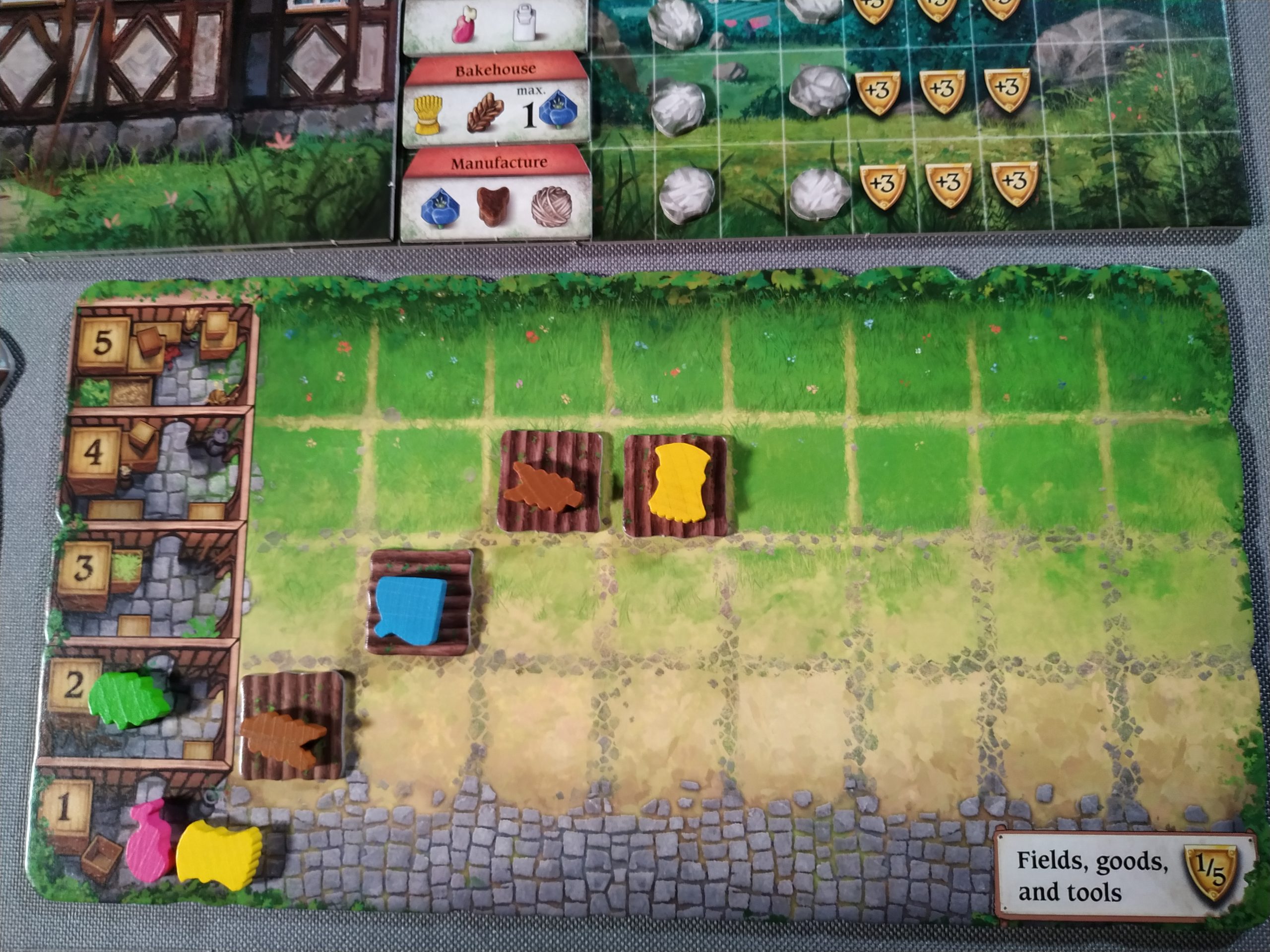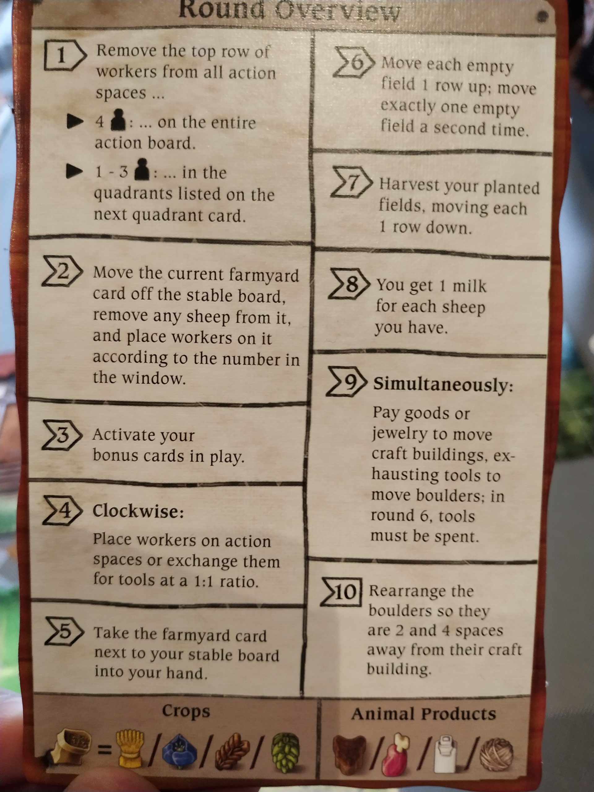Des productions automatiques (le lait avec les moutons et les cartes de prod posées) permettent un afflux de ressource supplémentaire. La gestion du premier joueur (super important) n’est pas automatique, mais liée à la prise d’une carte supplémentaire dans sa main. Le premier joueur de la phase précédente sera ainsi le dernier à avoir pioché une carte.