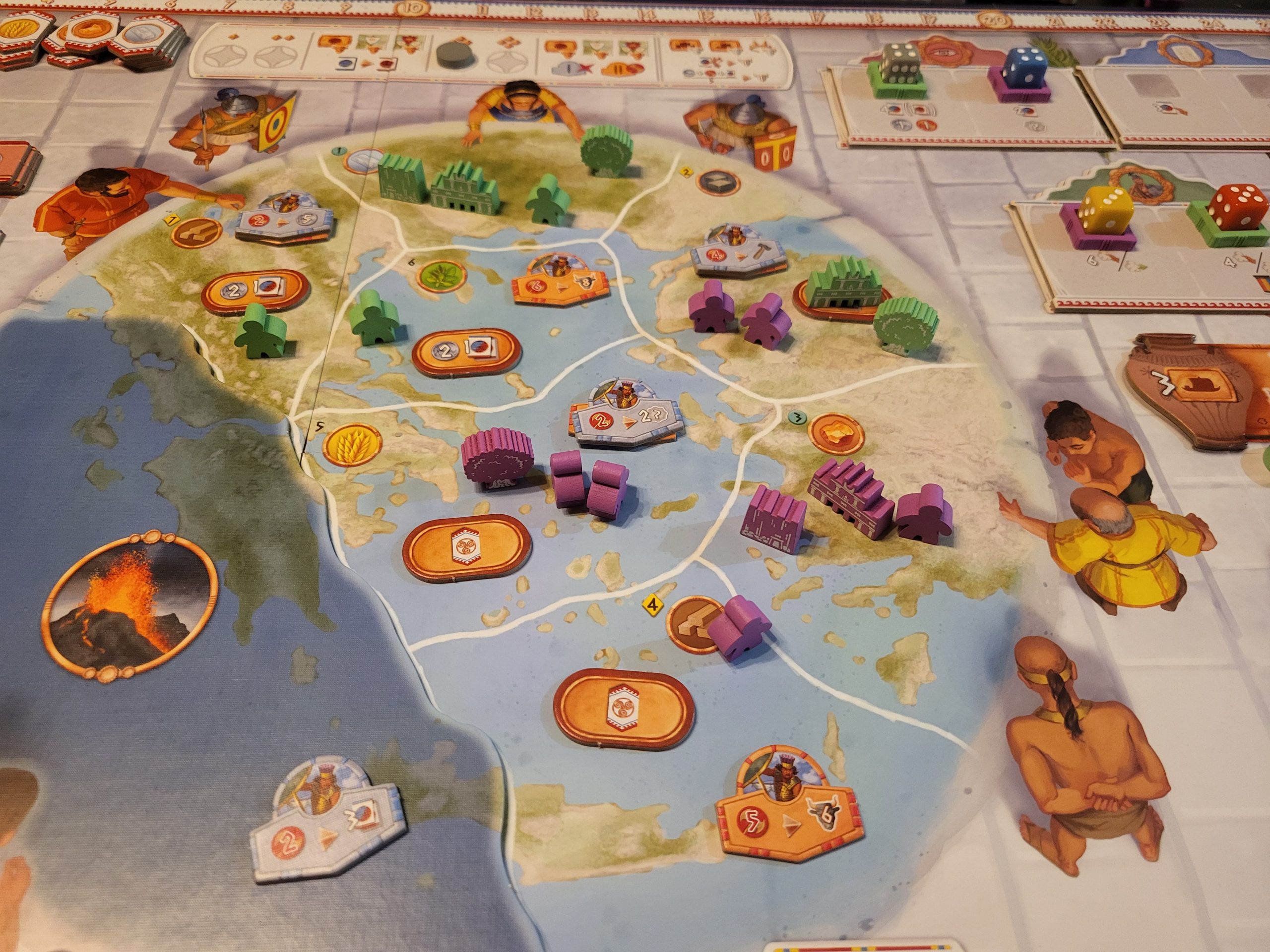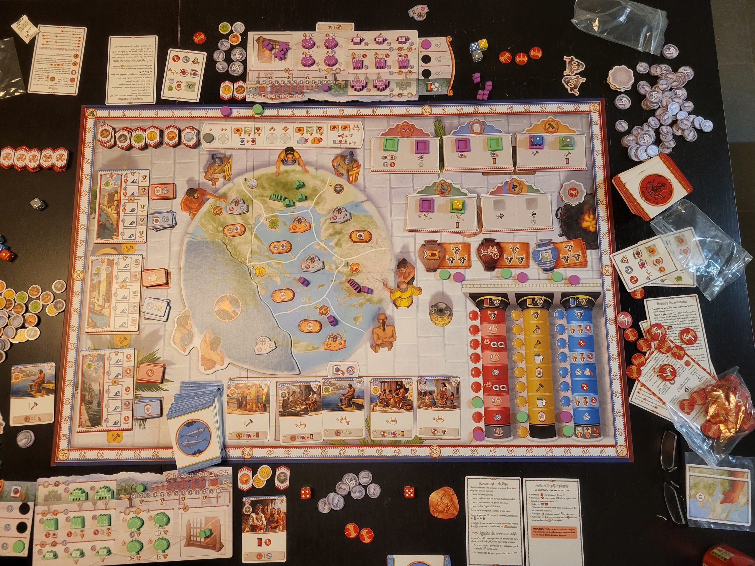 Ayant la chance d’avoir une des rares copies VF de Minos (merci les Pixies), je ne tarde pas à lire les règles et organiser une partie. Hasard du calendrier, on se retrouve finalement à deux pour ce premier run.  Comme cette config est clairement supportée (la faces du plateau pour 3 avec réduction de zone), cela ne pose aucun problème, d’autant que j’avais un drôle de pressentiment…
