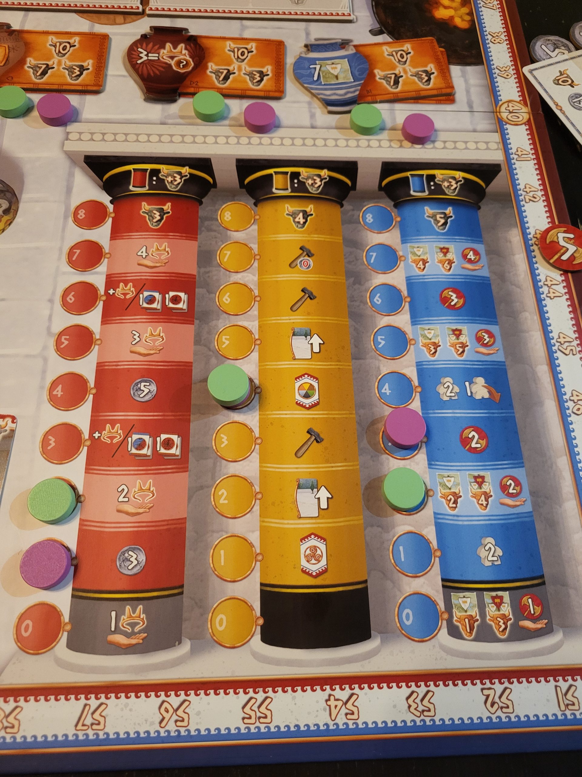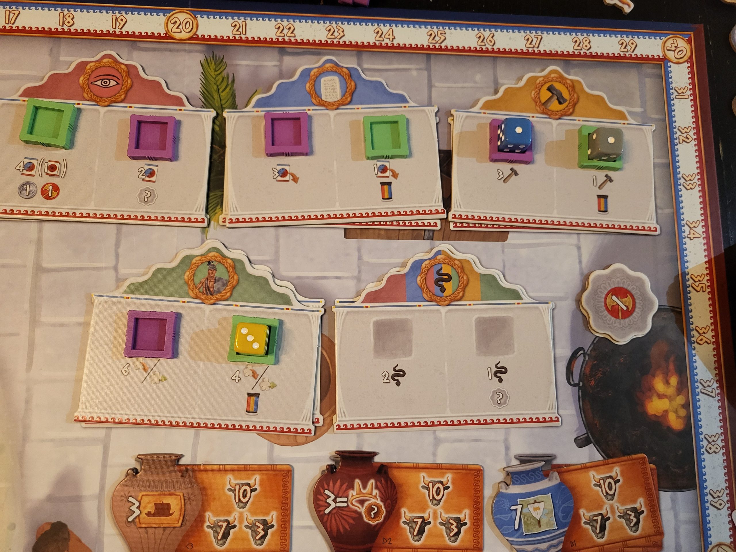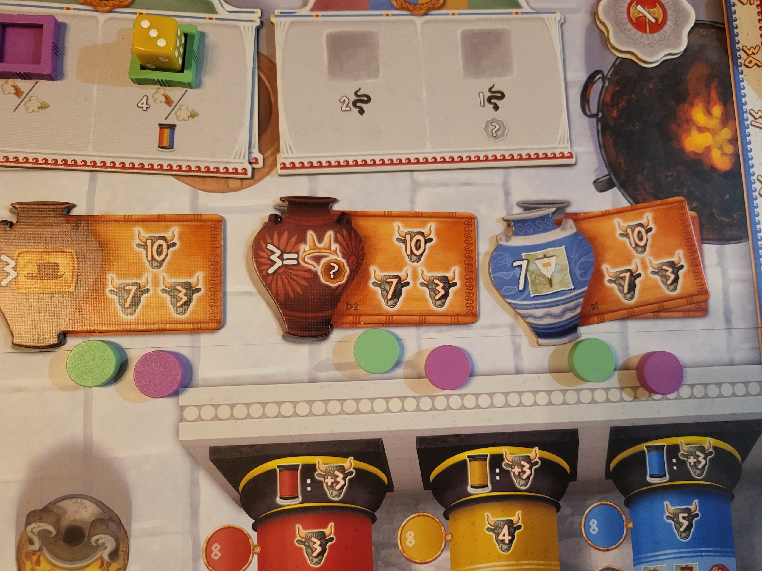 Il y a 3 objectifs à atteindre (des vases) valant 10 ou 3 PV (à 2) selon l’ordre de réalisation. En jouant à 2 que ce soit l’un ou l’autre qui le réalise en premier, cela génère un delta de 14 PV (et sans doute ce qui m’apportera la victoire en ayant été premier avant mon adversaire sur un objectif tandis qu’il était focus sur une autre partie du jeu). Ces objectifs permettent la petite interaction en mode course des joueurs, qui fait que l’on s’intéresse quand même à leur partie.