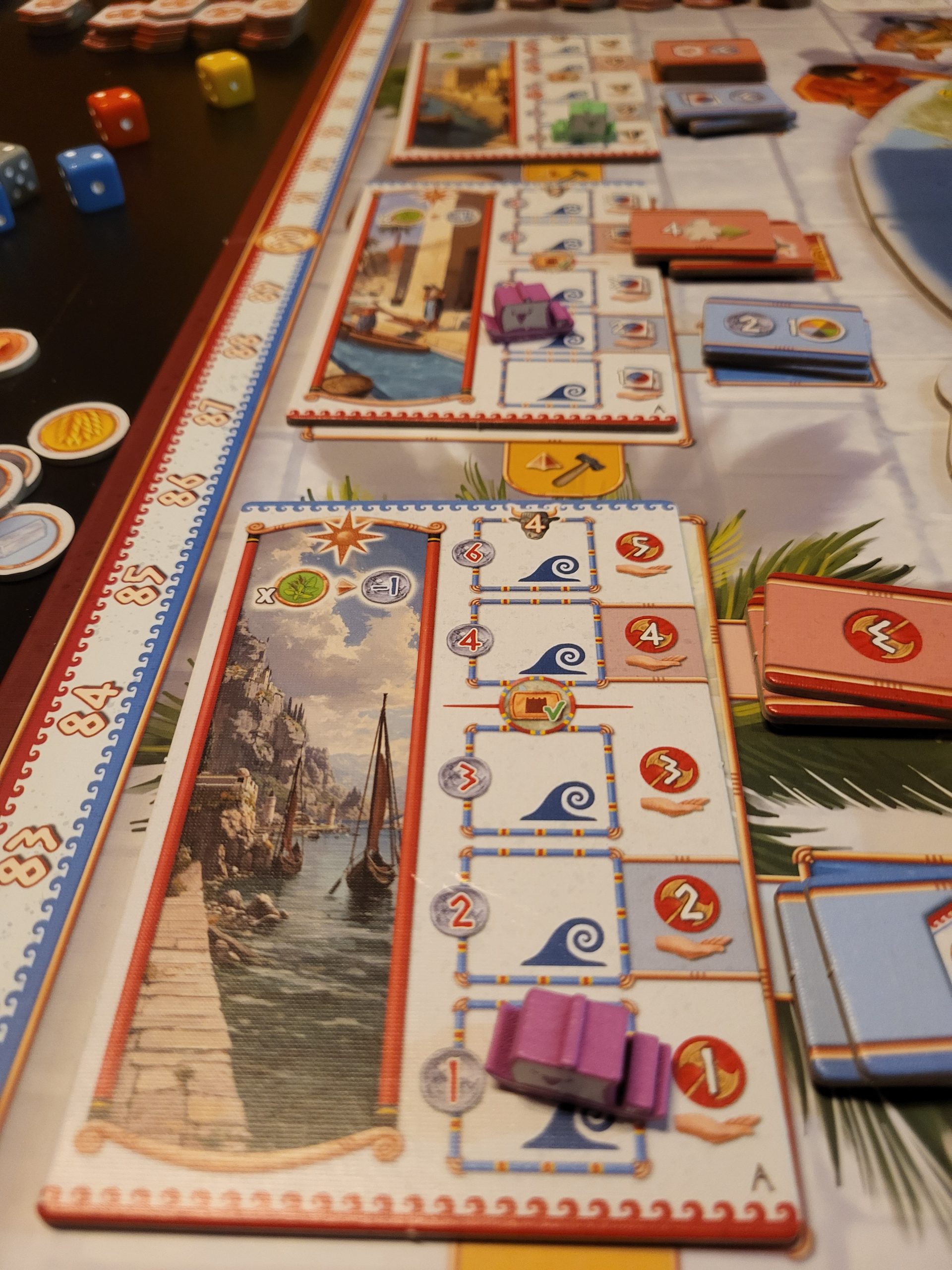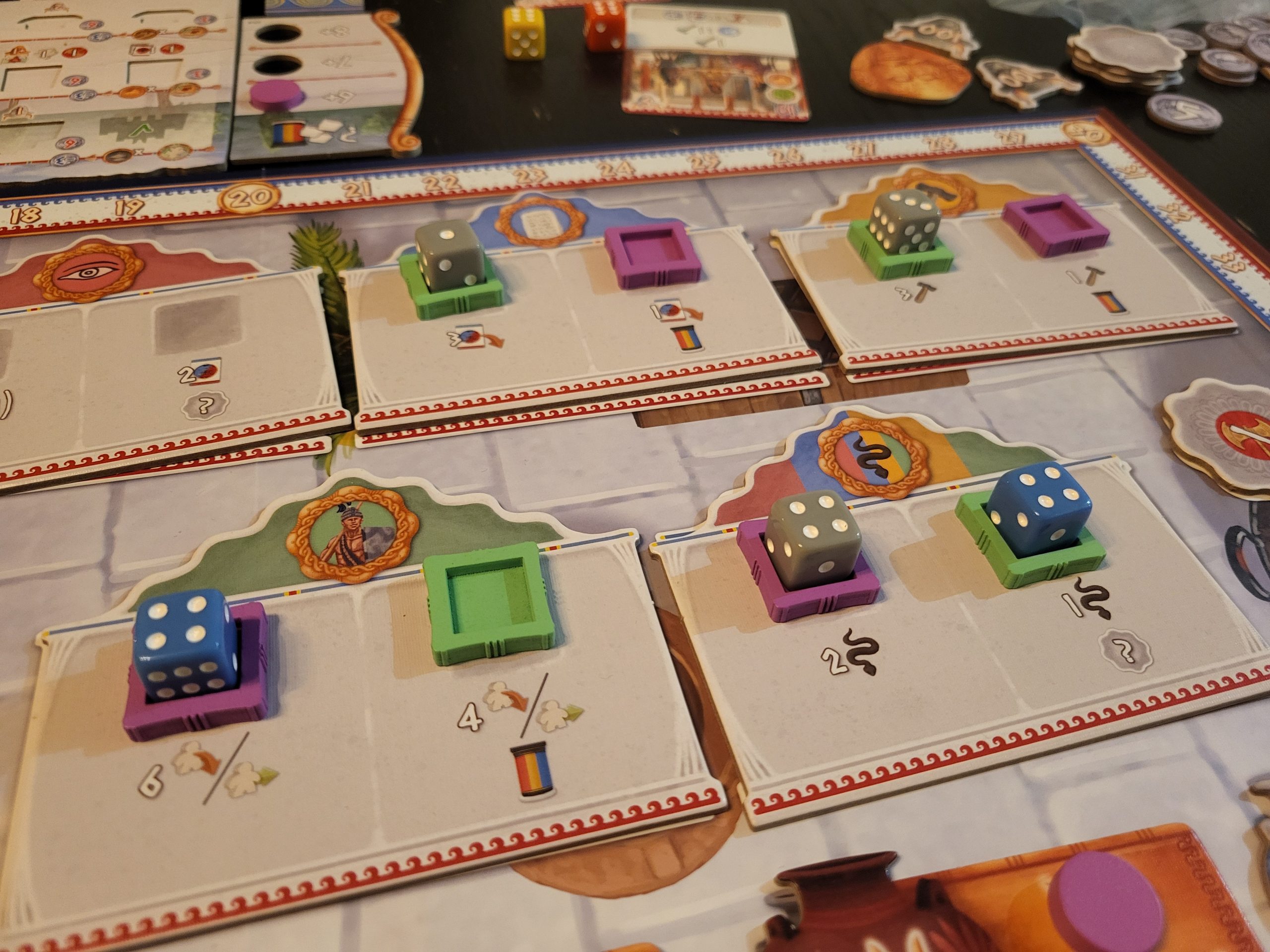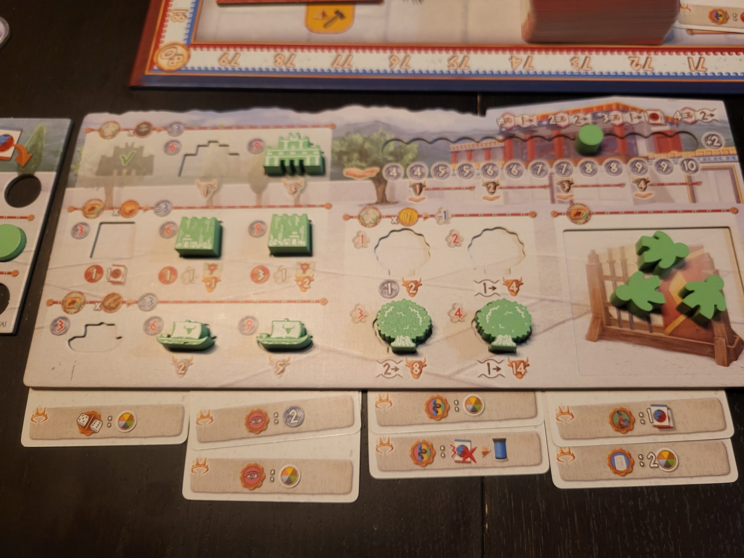 Il faut maintenant parler de la deuxième partie du jeu qui amène du Downtime (oui, car il y en a deux) : L’activation des actions via les dés. Lorsque vous retirez vos dés du plateau, vous gagnez des points pour réaliser un type d’action. Parfois il y a un bonus (comme progresser sur une piste colorée), mais vite dans le cours du jeu, vous aurez des bonus complémentaires représentés par des cartes sous votre palais. Elles sont conditionnées à une valeur de dé ou une zone d’action, mais vous pourrez en activer éventuellement 4 en milieu de partie. Chacune donnant un bonus plus ou moins complexe, comme vous les activez chacune avant ou après votre action principale, cela mène à une réflexion pour profiter au mieux du bonus. Mais ce n’est pas tout, car quand vous jouez une carte de votre main, cette dernière dispose d’une action immédiate (qui pourrait de jouer une autre carte). On se retrouve ainsi à faire en chaîne une série d’actions, à tel point qu’on en oublie parfois quelle est l’action initiale du dé (et si on l’a terminée ou pas). Il vaut mieux qu’un autre joueur vous suive dans vos actions enchaînées pour éviter les erreurs et vous rappeler où vous en êtes. Ceci prend du temps, d’où le downtime pour les autres qui n’en ont que peu à faire (et il faut être focus pour suivre un autre joueur).