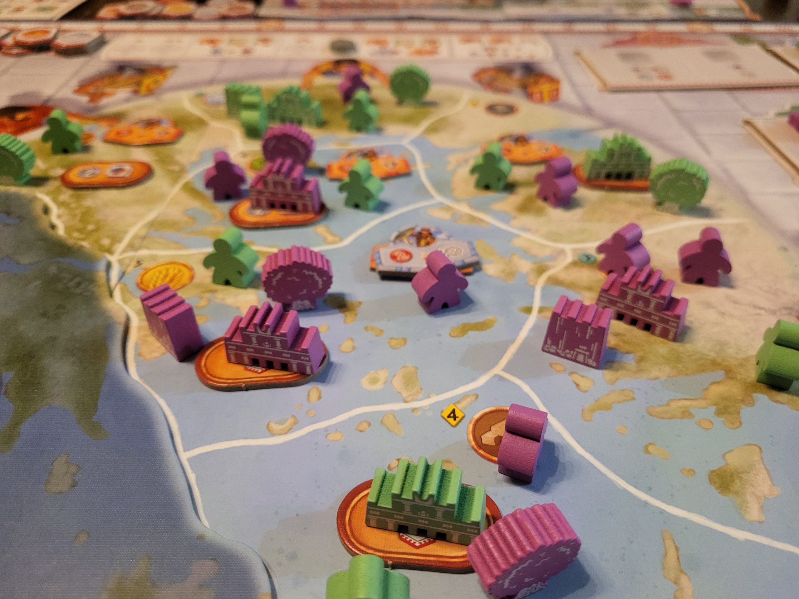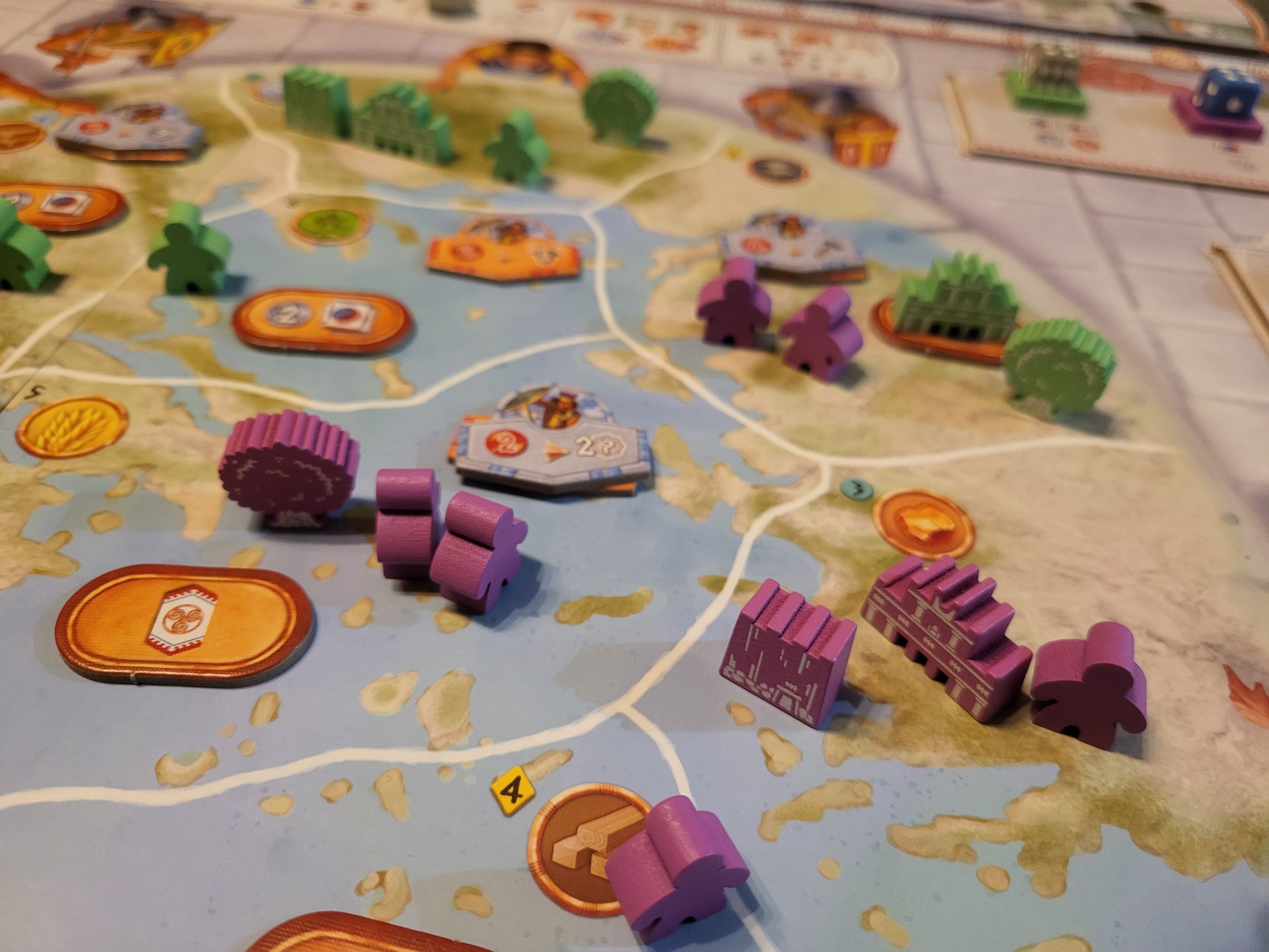 Fin de manche, on active toutes ses productions. Fin de manche 2 et 4 on gagne des PV selon ses développements et positions sur la map. Fin de manche 4 on compte tous les PV éparpillés dans le jeu.