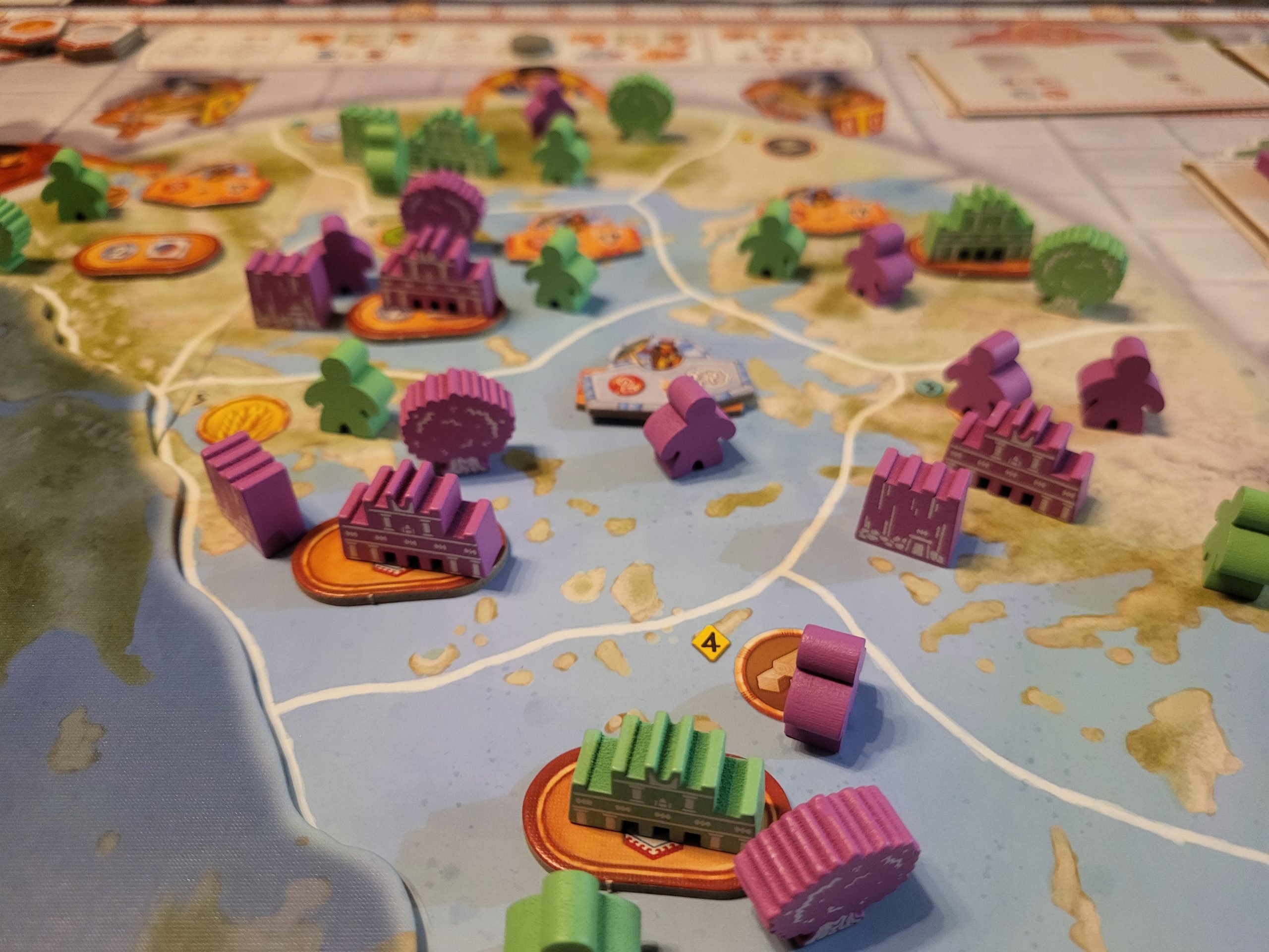 Les actions possibles se concentrent sur deux parties du jeu : le développement de son palais en plaçant des cartes bonus dessous ET la prise de contrôle et de constructions sur la map. Du coup les actions sont globalement :