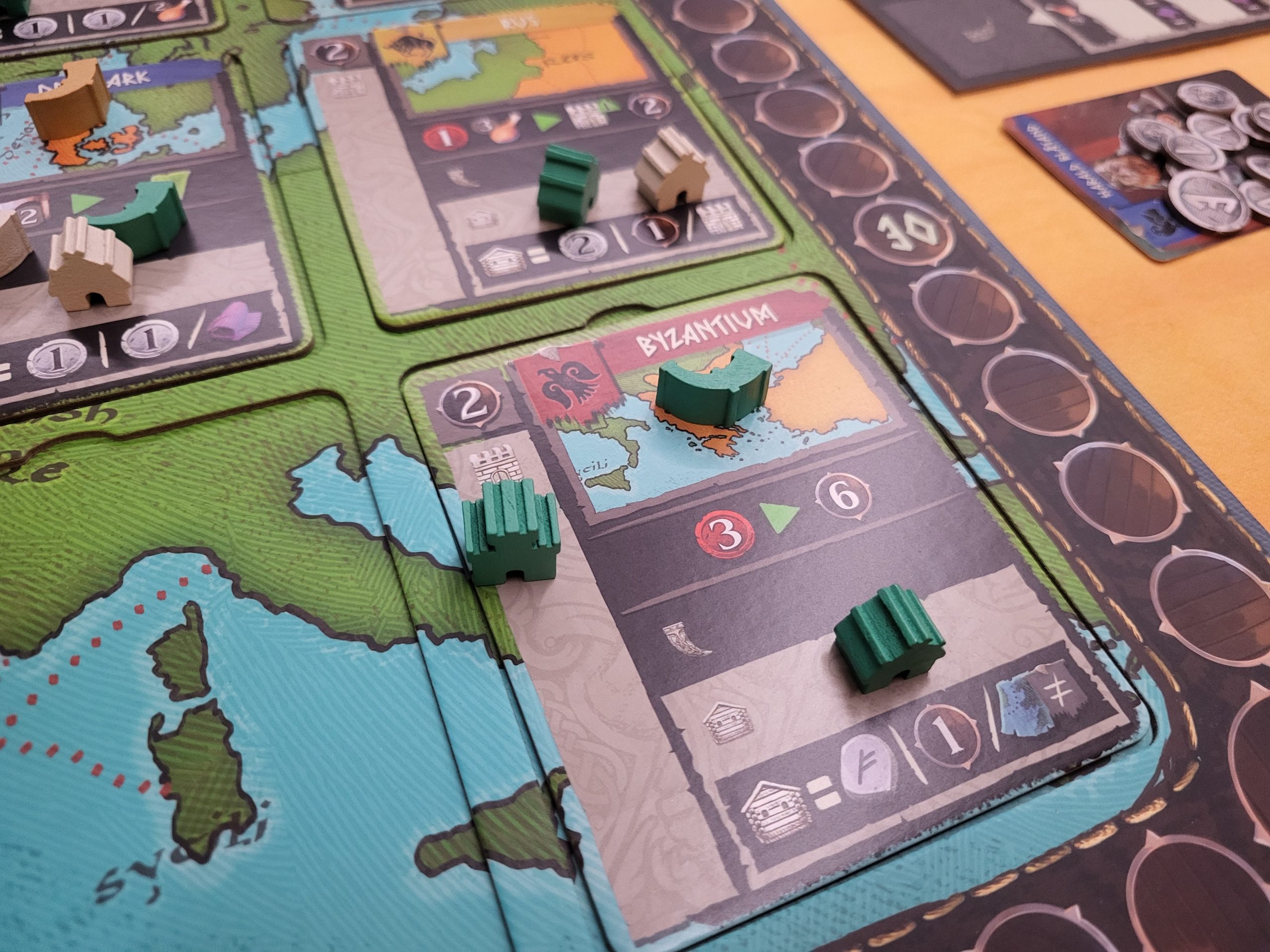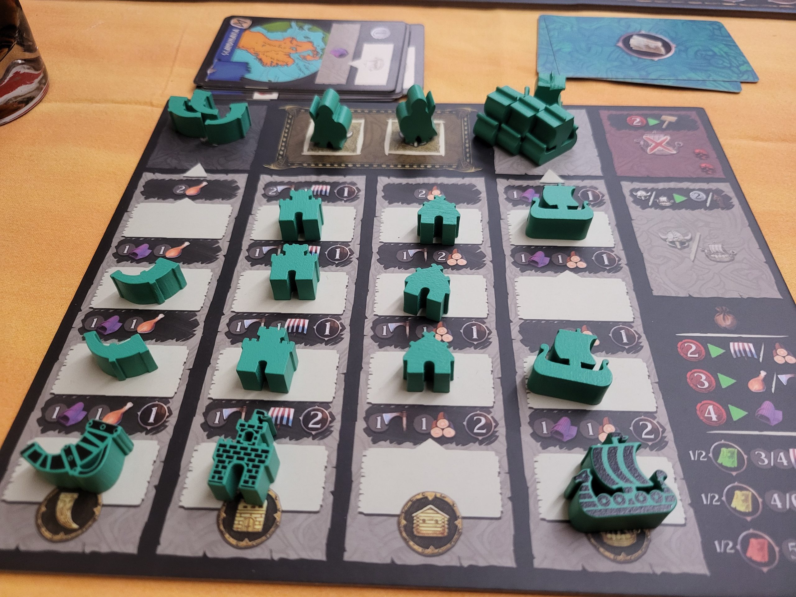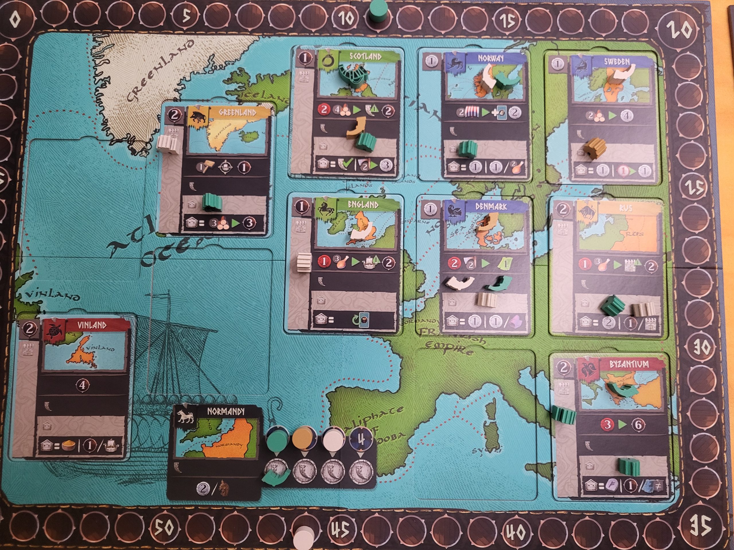 En fin de manche, on revoit l’ordre du tour (via la Normandie), on produit avec ses maisons de colons et on reçoit des PV selon les ressources rares récoltées (gemmes, runes, épices). Comme l’ordre du tour est important en cas d’égalité, le passage en Normandie semble valoir la peine. Hélas, le premier joueur peut activer à chaque manche la Normandie en premier, bloquant sa position ad vitam. J’aurais aimé interdire cette action comme premier coup de chaque manche, comme cela se fait parfois.