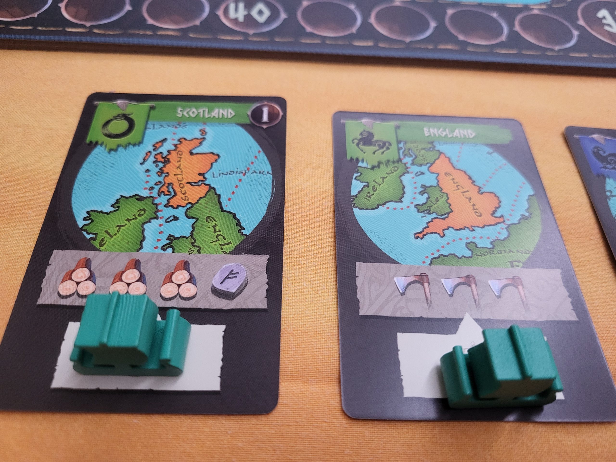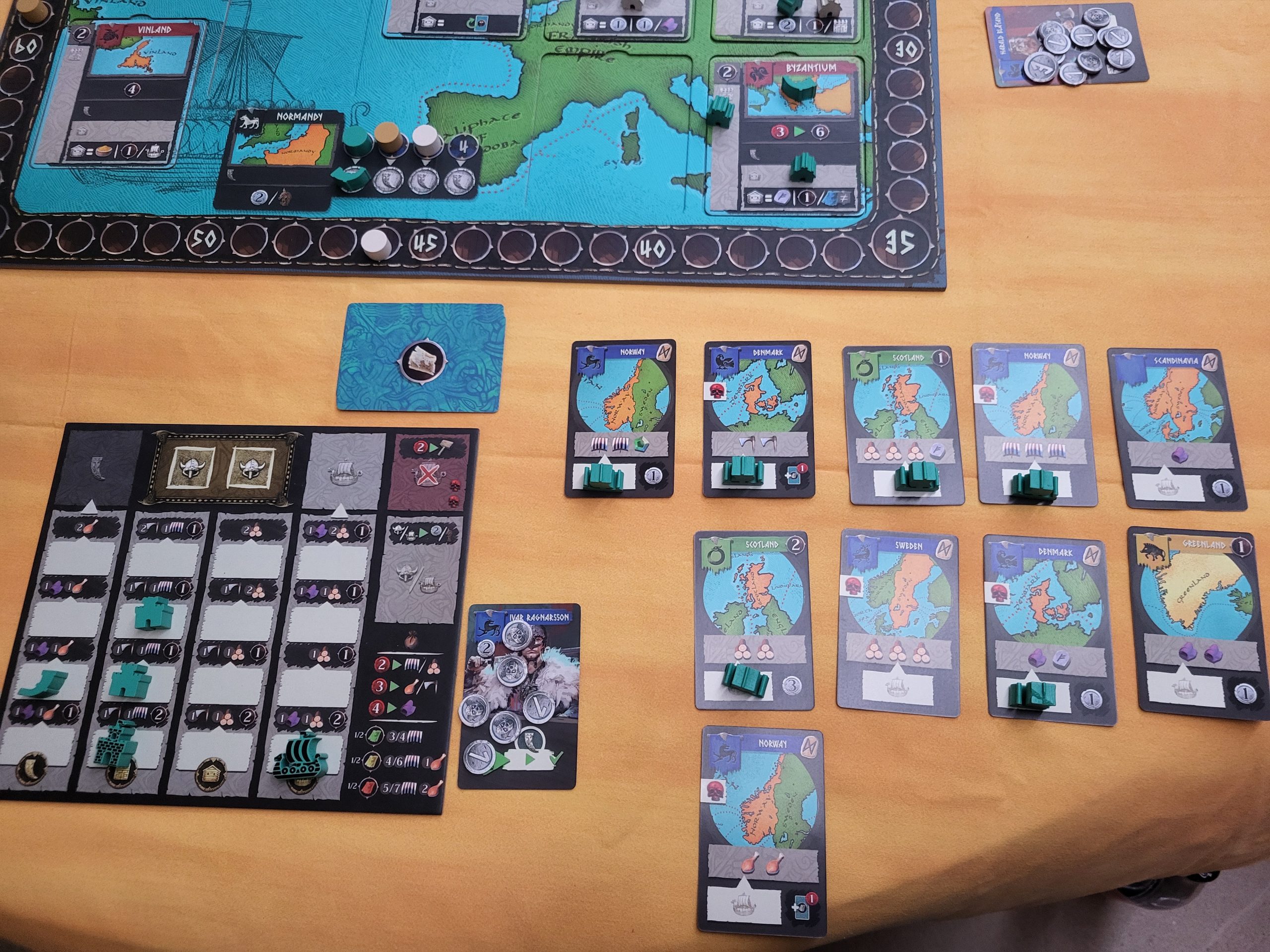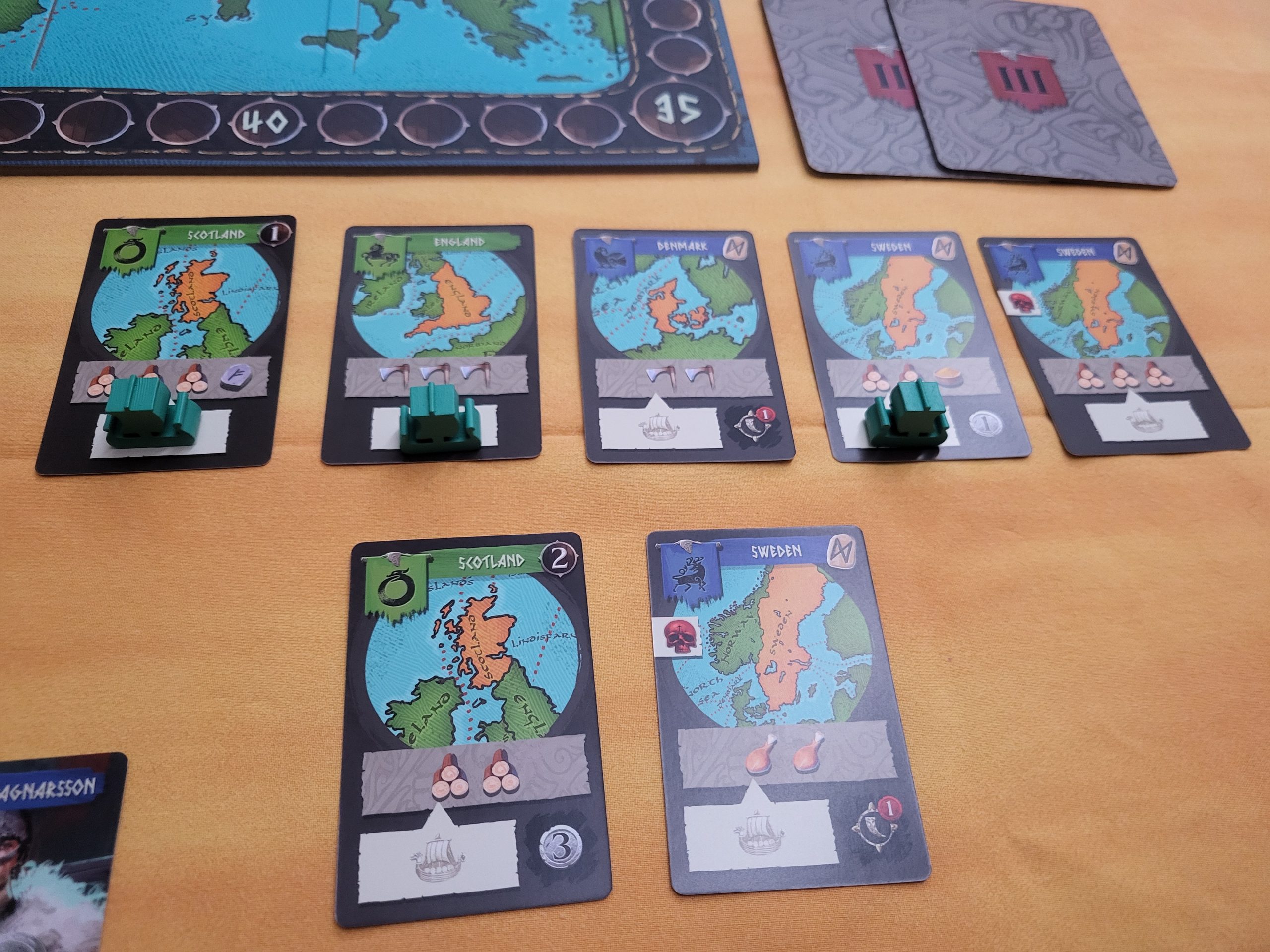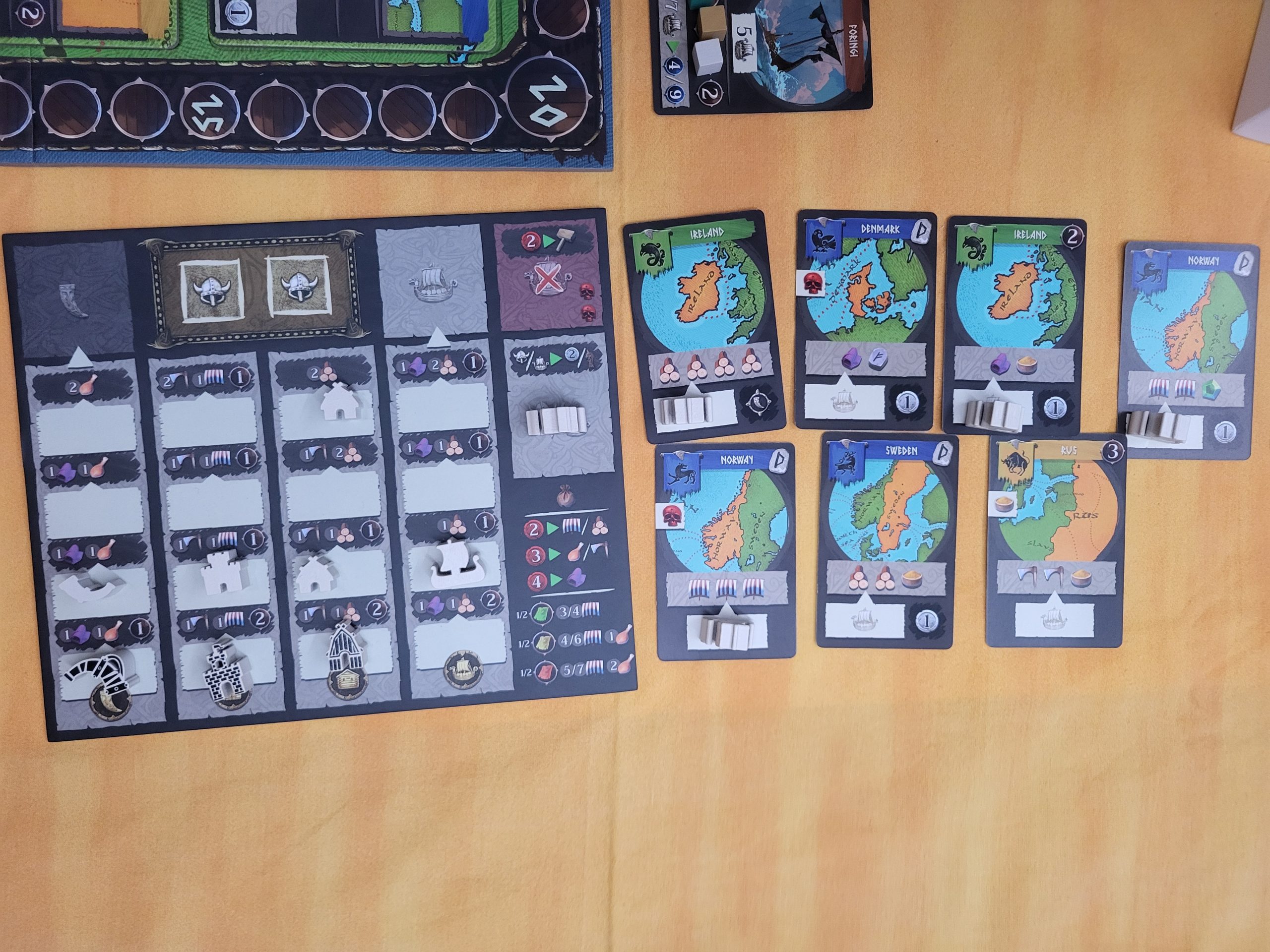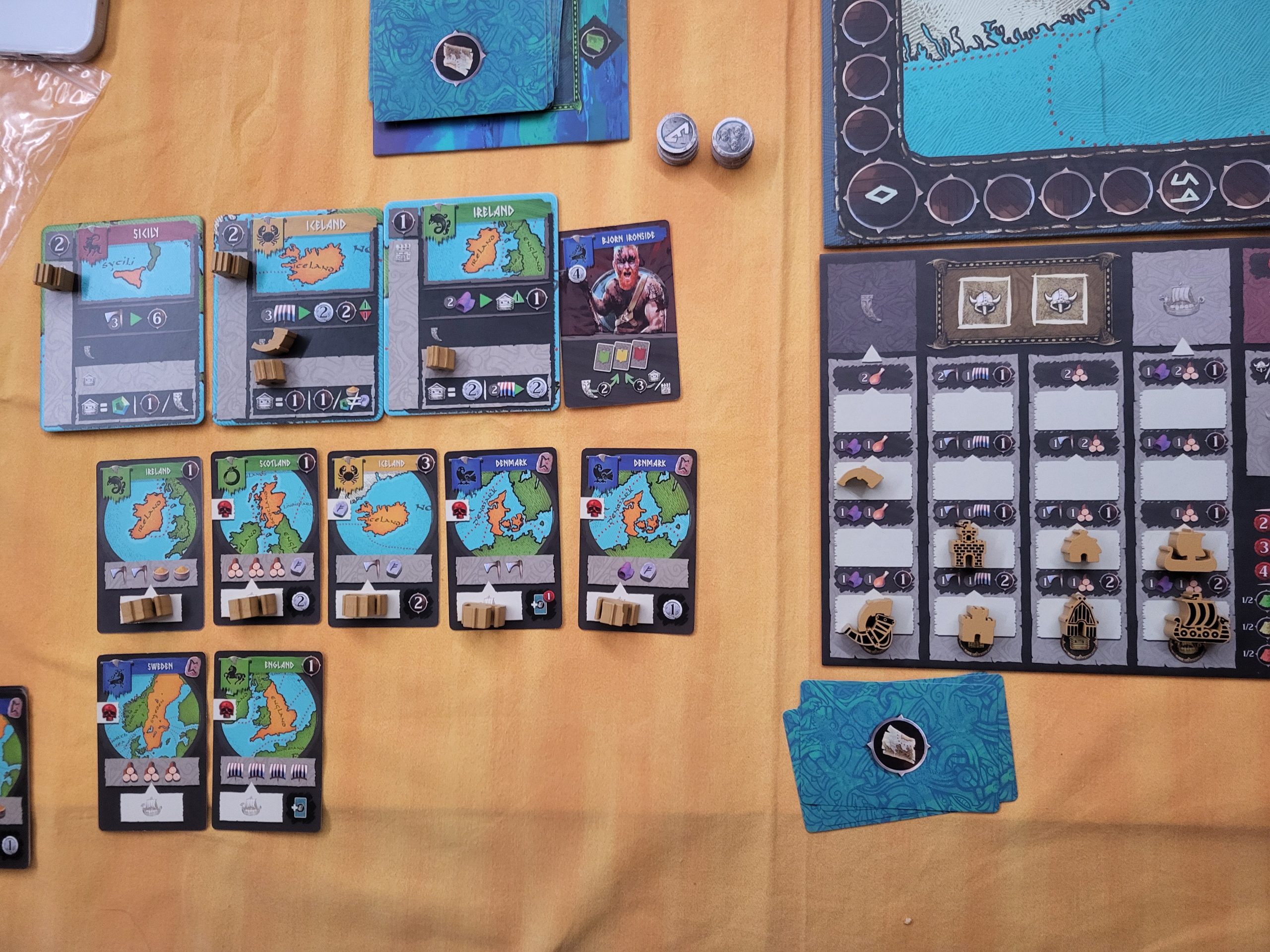 Première phase : chaque joueur entame un stop ou encore en révélant ses cartes. Sur chacune, il peut placer un bateau et/ou un diseur de loi, dans la limite du stock disponible. Attention, si deux crânes rouges sont révélés, un bateau disponible est endommagé. Si l’on n’a plus de bateaux en stock avant de révéler un éventuel deuxième crâne rouge, on doit s’arrêter. On envoie alors ses diseurs de loi sur les pays associés aux cartes, dans l’un de ses forts ou encore en Normandie, tandis que les bateaux ont éventuellement une petite production, mais surtout donnent accès à des ressources pour toute la manche. Un peu comme les cartes de production de Seven Wonders, sauf que les cartes varient d’une manche à l’autre.