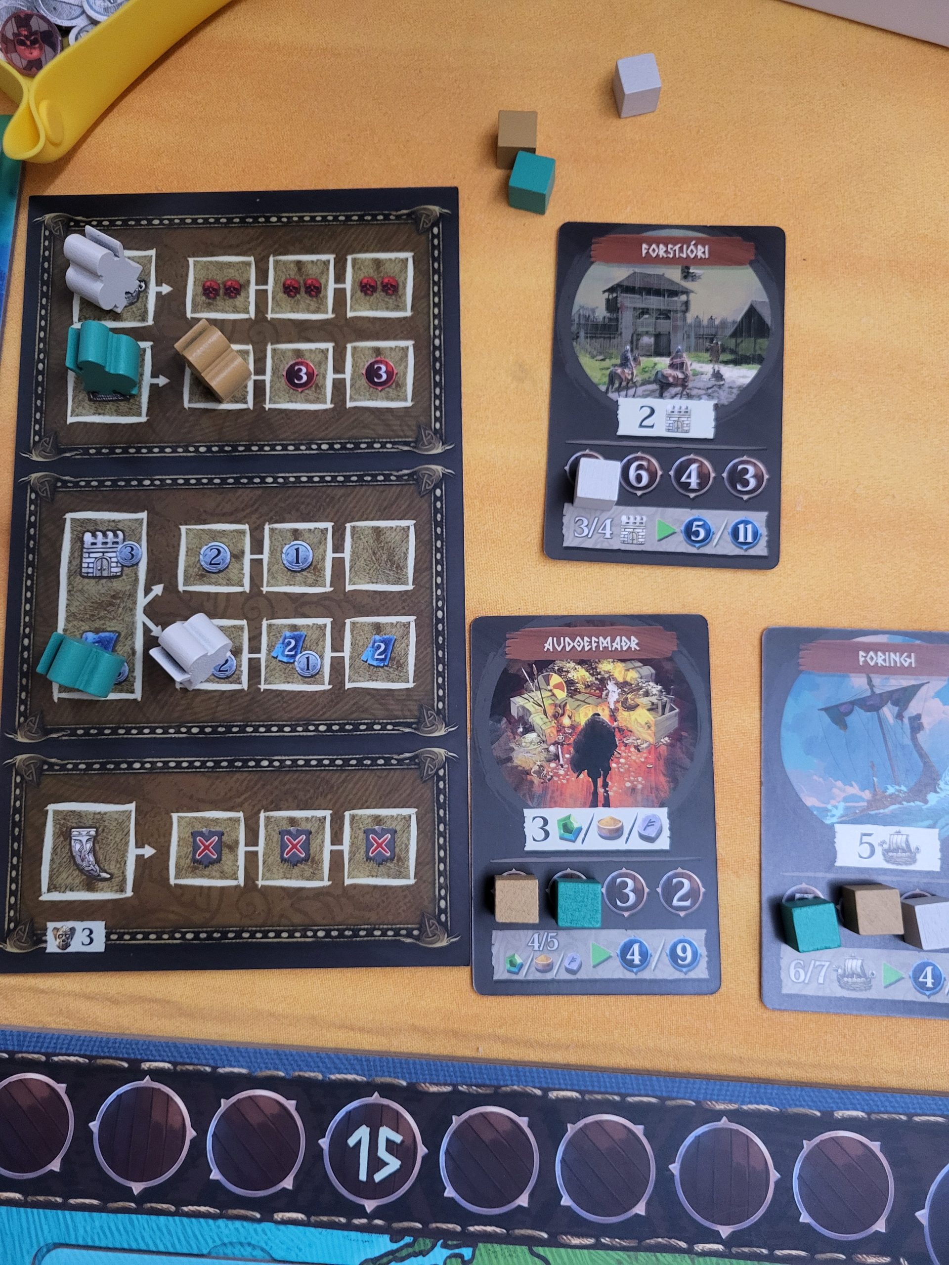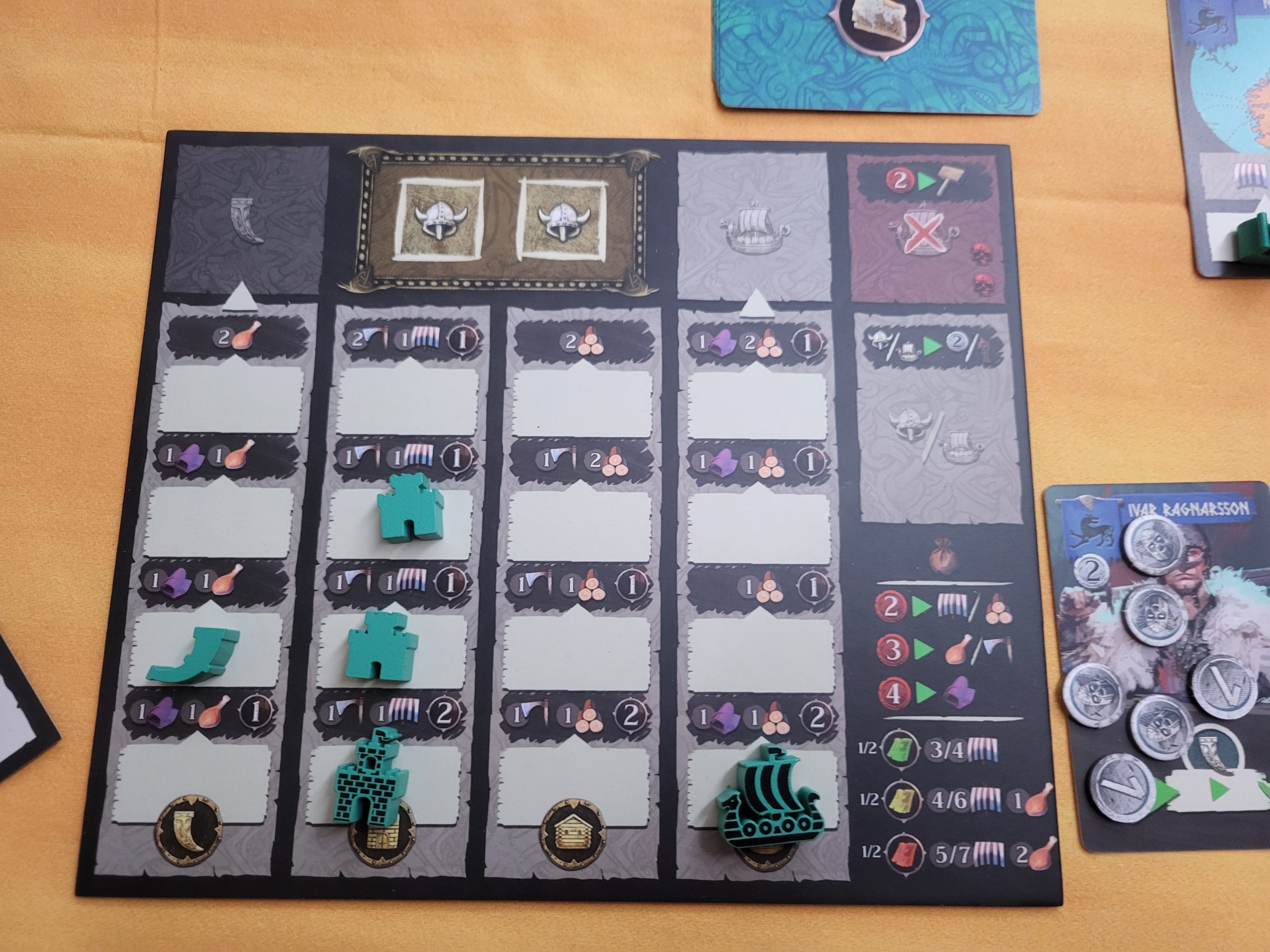 C’est ce Jarl qui permet de construire de nouveaux objets ou de récupérer des cartes de nouveaux pays (plus fortes et rapportant des PV). C’est le cœur du jeu pour vos développements, et c’est là que l’on calibre ses bateaux de ressources. Car si, en une action, vous parvenez à remonter l’échelle de production jusqu’à rendre disponibles plusieurs objets, vous avez bien joué. Ce n’est pas simple, car il faut avoir pioché les bonnes cartes pour disposer des ressources nécessaires. Il est bien possible d’acheter des ressources supplémentaires, mais une seule par action… et l’on en voudrait souvent plusieurs.