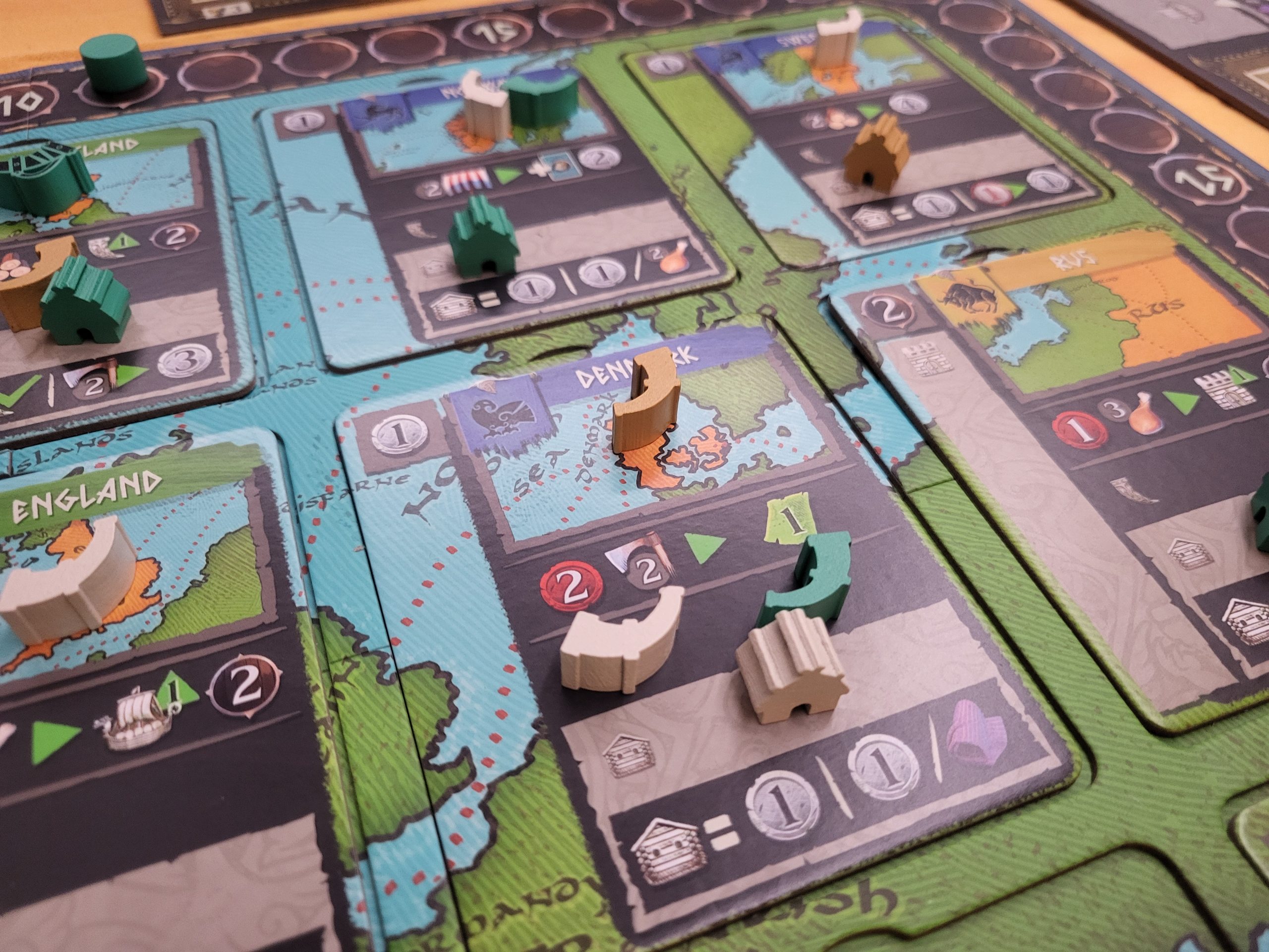 Le plateau commun représente une carte de l’Europe sur laquelle on va progressivement faire apparaître les pays avec lesquels commercer, au fil des cinq manches. Chaque plateau joueur contient principalement des objets à produire, ainsi que des bateaux, des « diseurs de loi » (lögsögumaður ou lagman, celui qui rappelait la loi au Thing), un chef viking pour l’asymétrie, et un paquet de cartes de base. Ces cartes correspondent aux trois pays d’origine des Vikings : Suède, Norvège et Danemark.