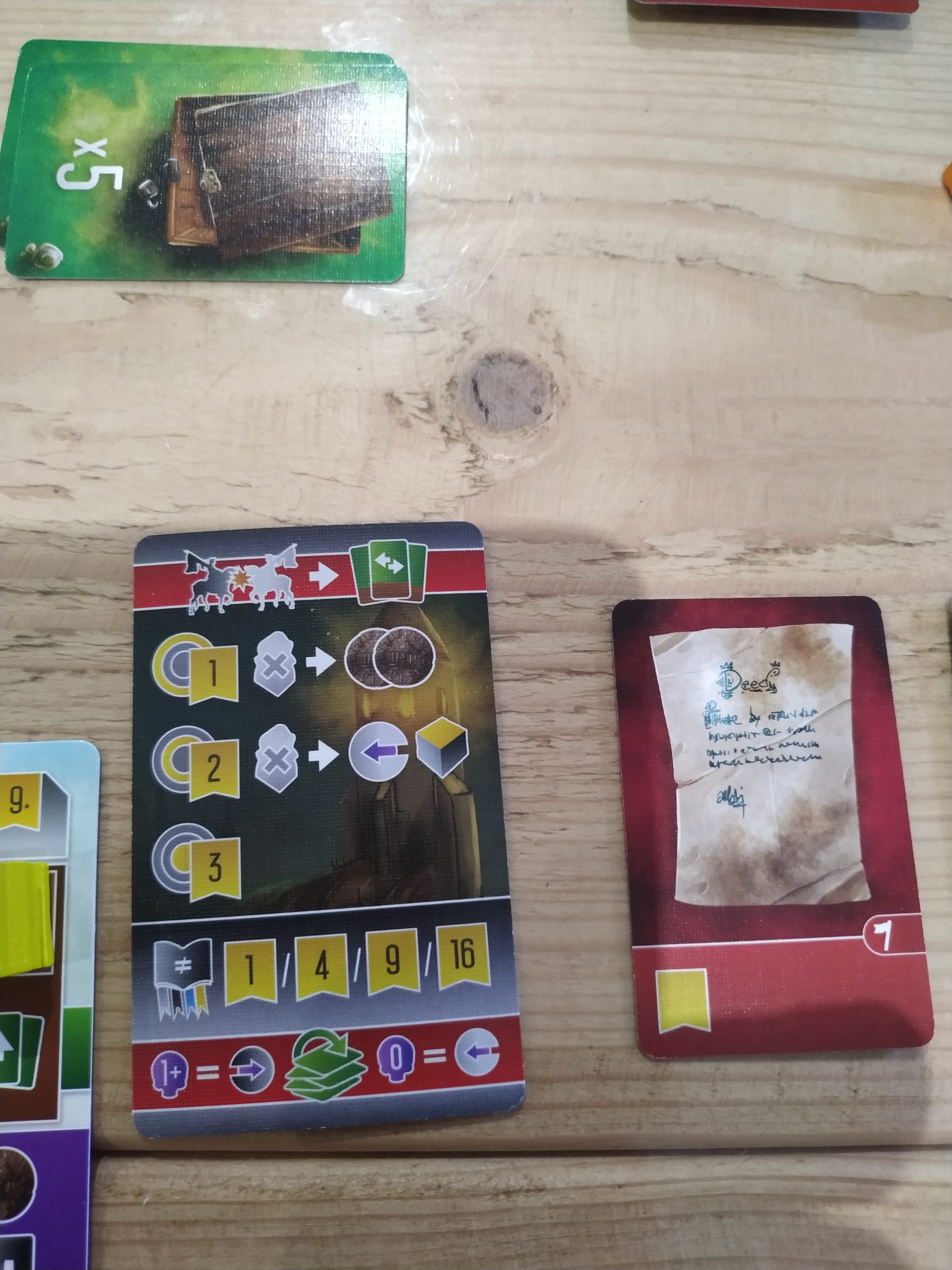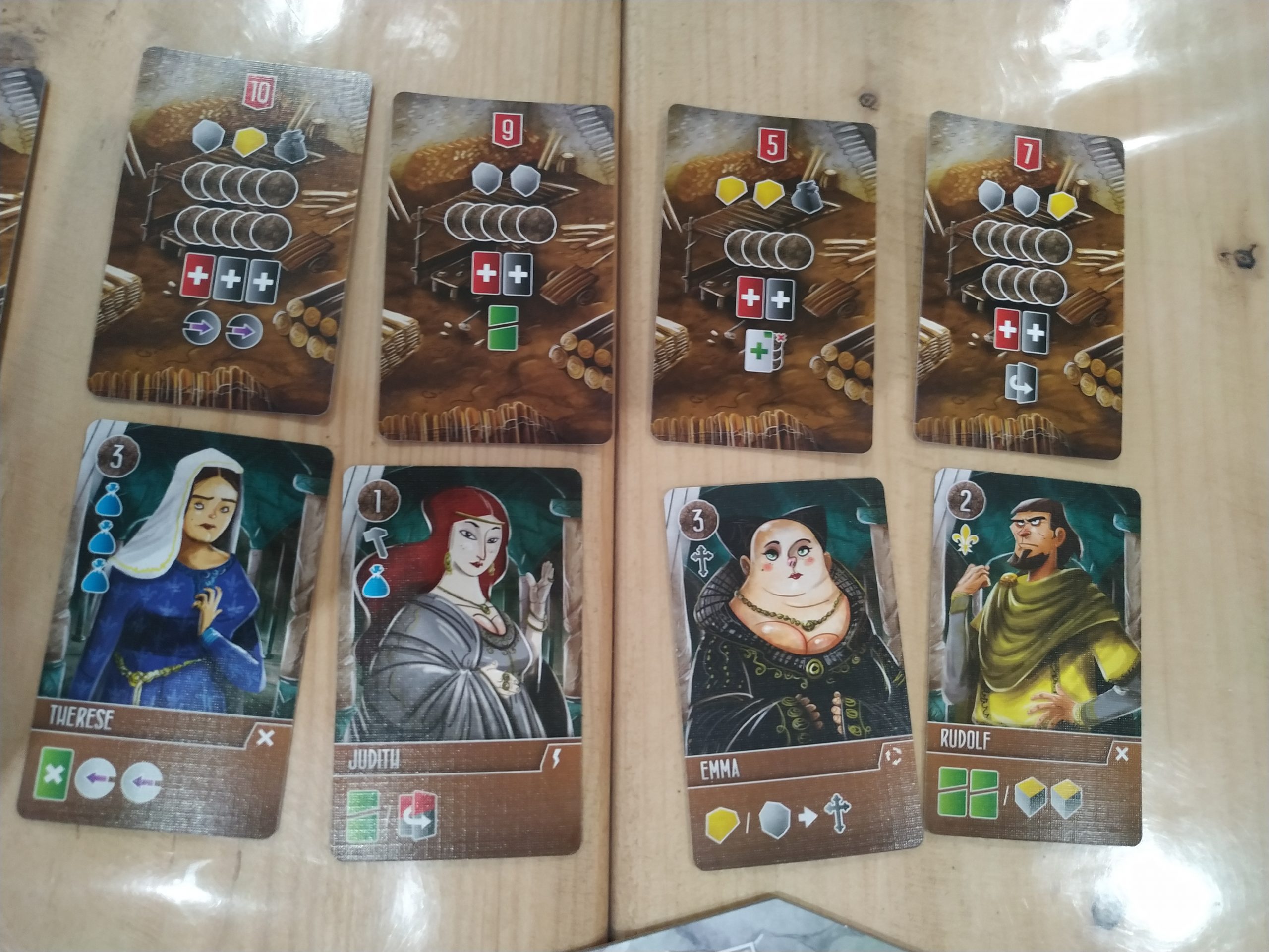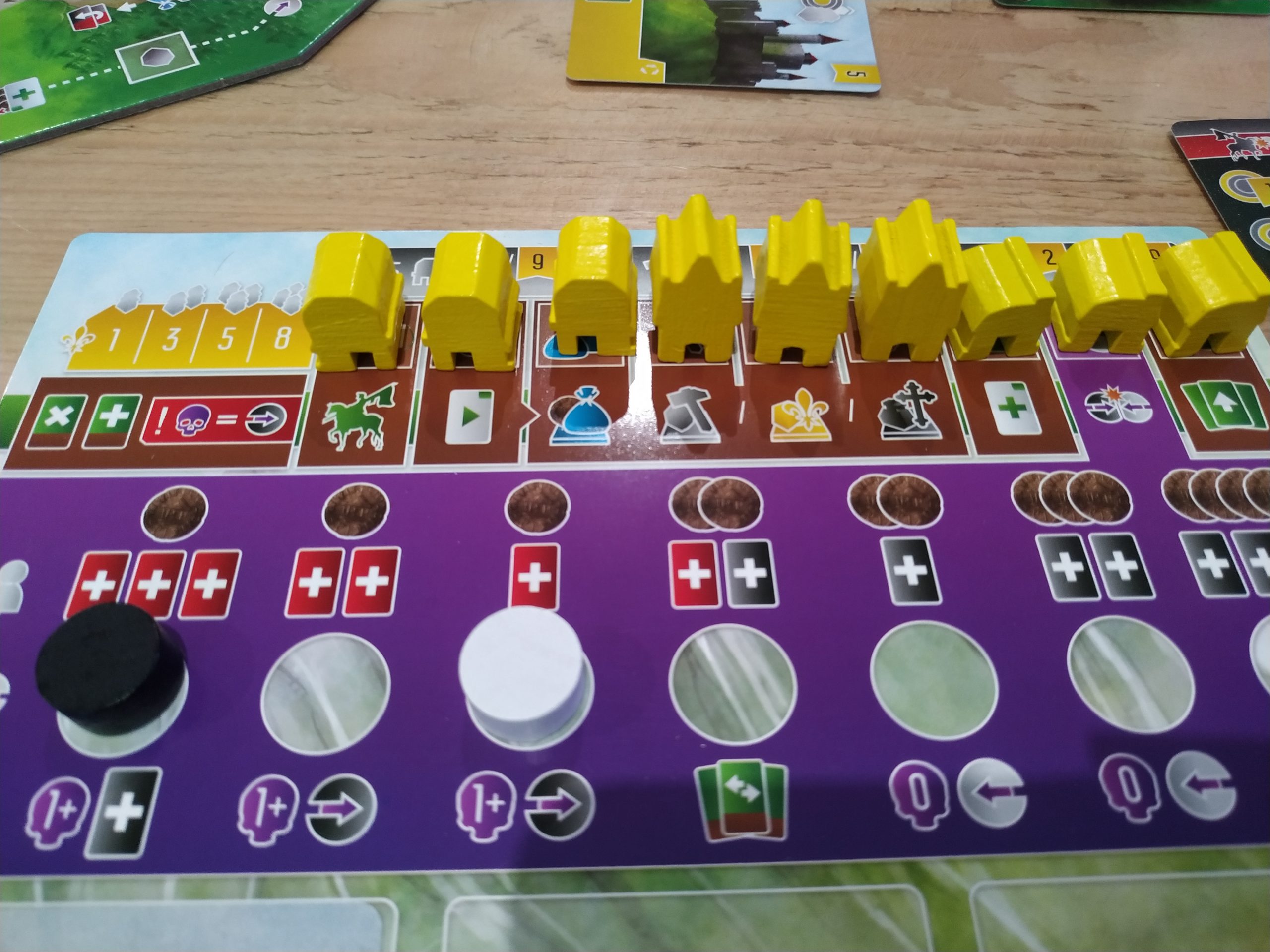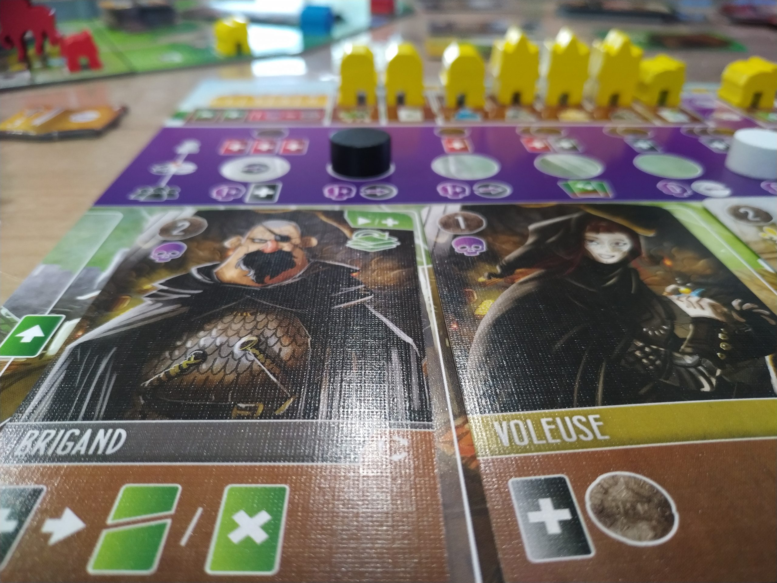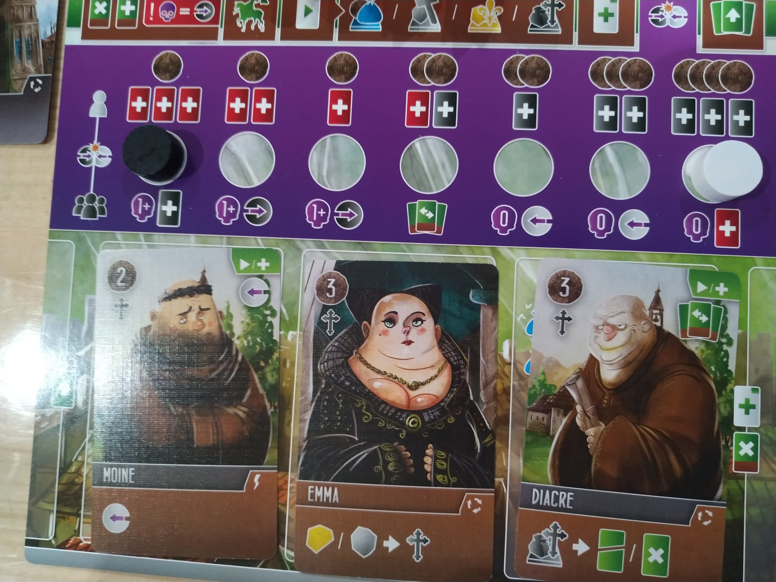 - Activer une des 4 actions possibles : Commercer (recevoir des ressources selon les sacs visibles) / Construire (selon les marteaux visibles) / Courtiser (ajouter des nombres selon les fleurs de lys visibles) / Retranscrire un manuscrit (selon les croix visibles). Sachant que les crânes des criminels sont des jokers utilisables pour toutes les actions, que l’on peut ajouter des ressources pour augmenter sa valeur d’action, que l’on peut engager en one shot un villageois près de son vicomte pour ajouter ses symboles visibles et faire son action spécifique (haut à droite).