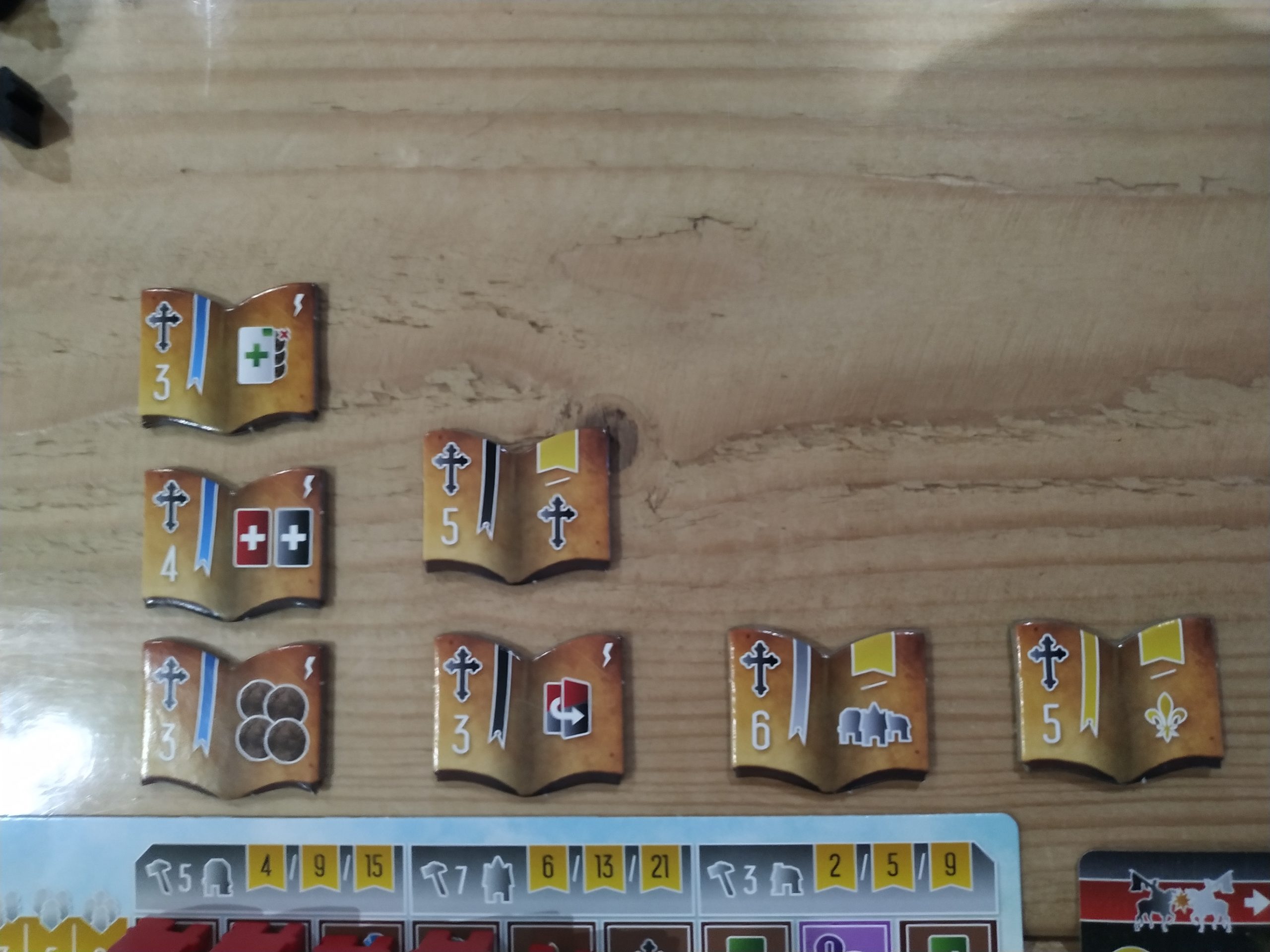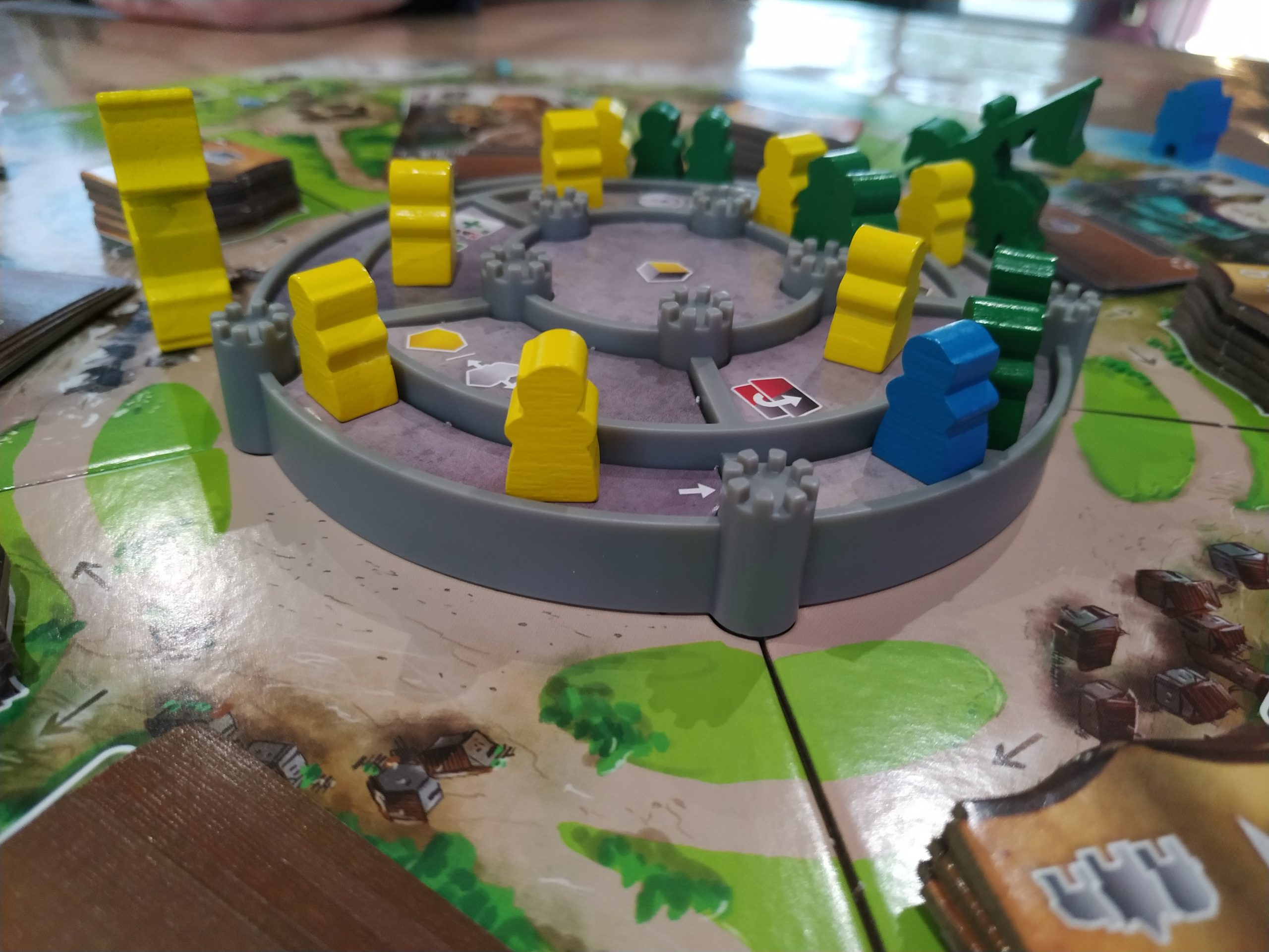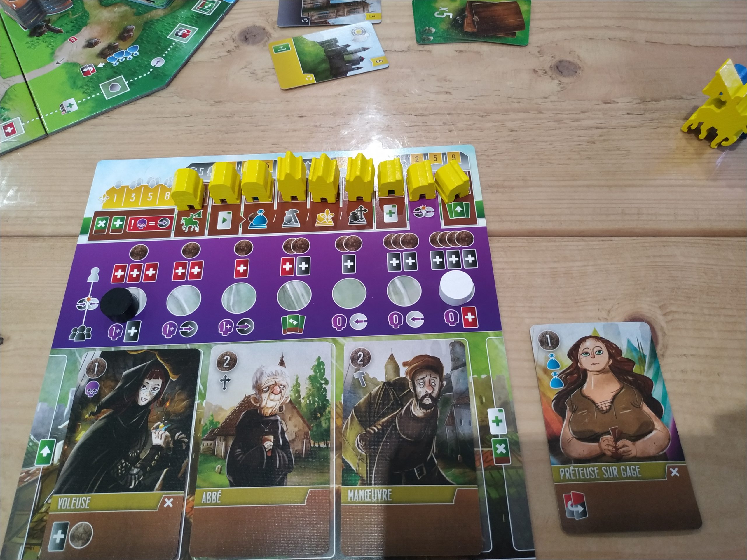 Le château s’avère trop énergivore pour le résultat final et on se dit qu’il faudra essayer de se contenter de le faire sur une seule case d’entrée pour essayer d’atteindre plus vite le haut de ce dernier (niveau 3) qui est le seul intéressant. Le prêtre est super intéressant (d’ailleurs dans l’exemple des règles il fait 50 % des PV du joueur exemple), mais cela dépend malgré tout des cartes que l’on a pu trouver. Le constructeur est moyen, mais la construction sur des positions uniques (retournement de carte) fera que le joueur gagnera sur les PV de fin, de justesse. 3 joueurs finissent ainsi à 5 PV l’un de l’autre, tandis que le 4ième se fait avoir par les dettes dans les derniers tours.