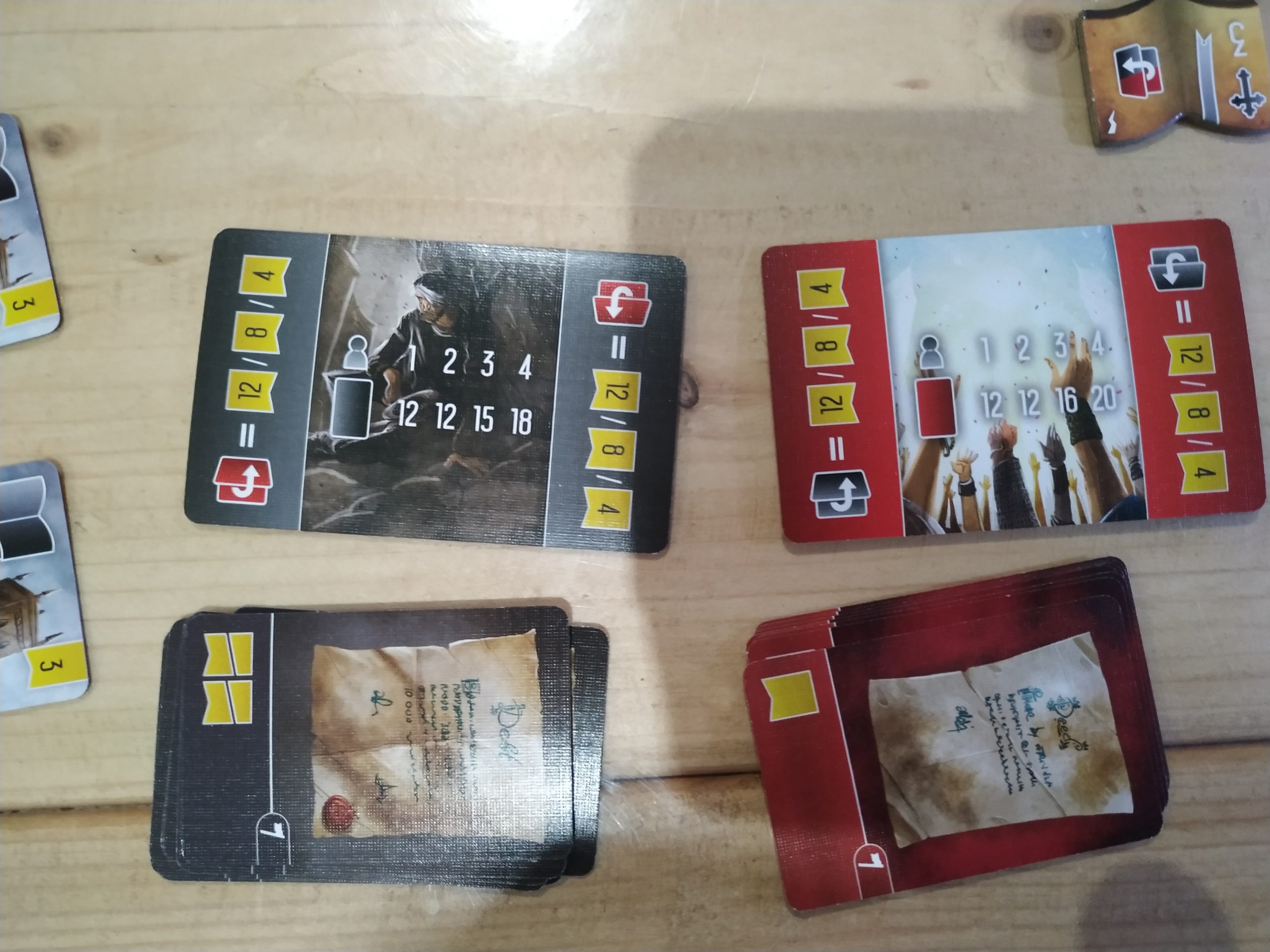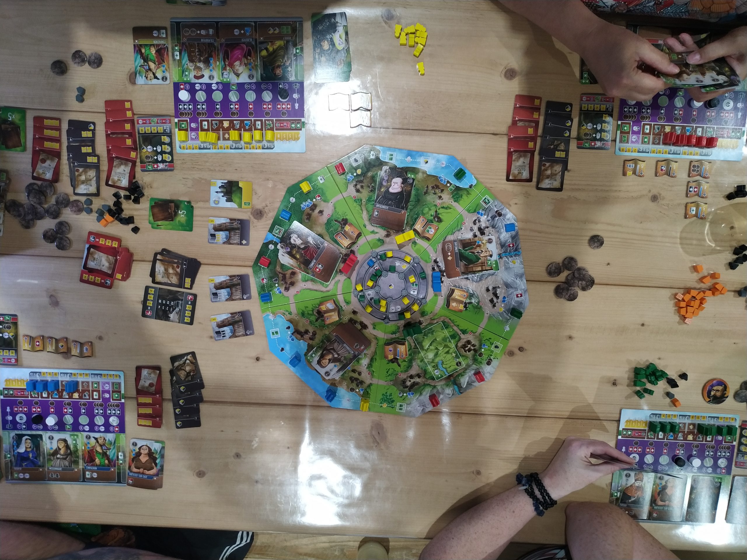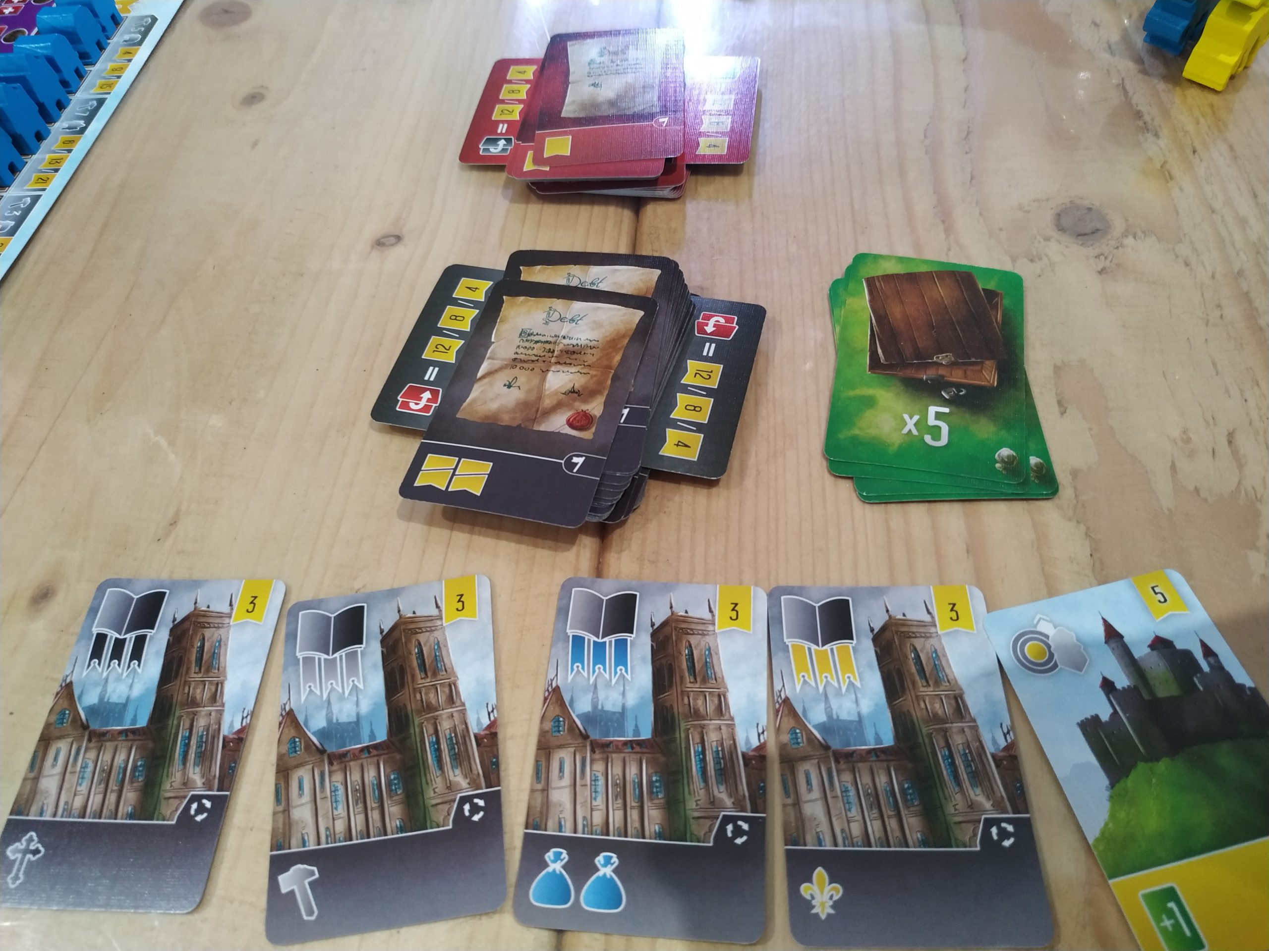 Concrètement, il faut 2-3 tours pour que tout rentre bien et ensuite cela devient plus fluide et on commence chacun avec l’idée d’une voie à explorer. Si le commerce est accessible par tous, on trouve des joueurs pour jouer les nobles (château), les manuscrits (prêtres) et bâtiments (pour les bonus). Le choix d’un héro au départ permet à un joueur de prendre son envol sur les manuscrits, tandis qu’un autre utilise les bâtiments pour s’assurer de retourner un maximum de ses cartes (dettes / titre de propriété).